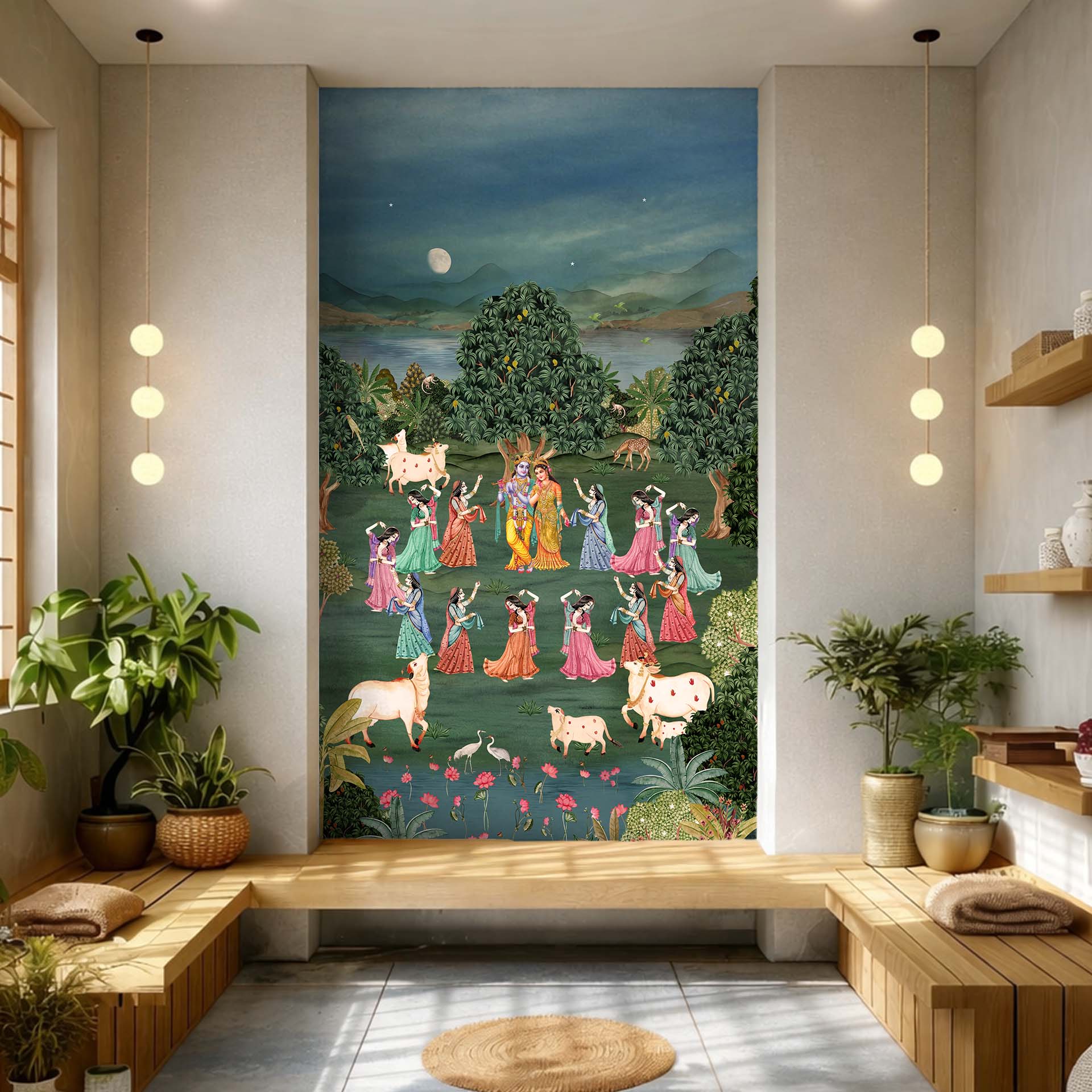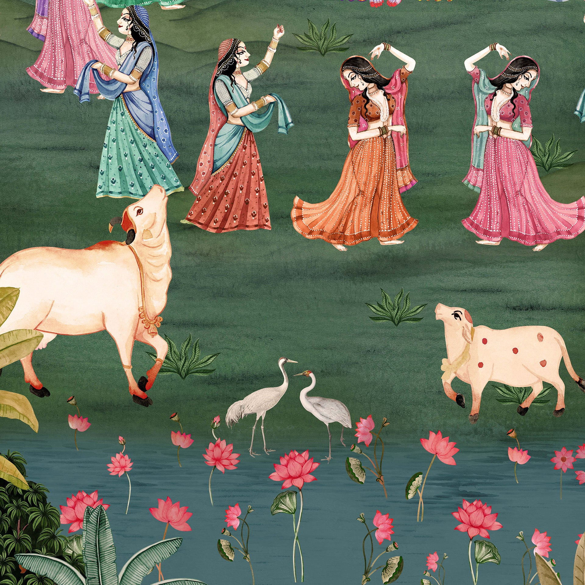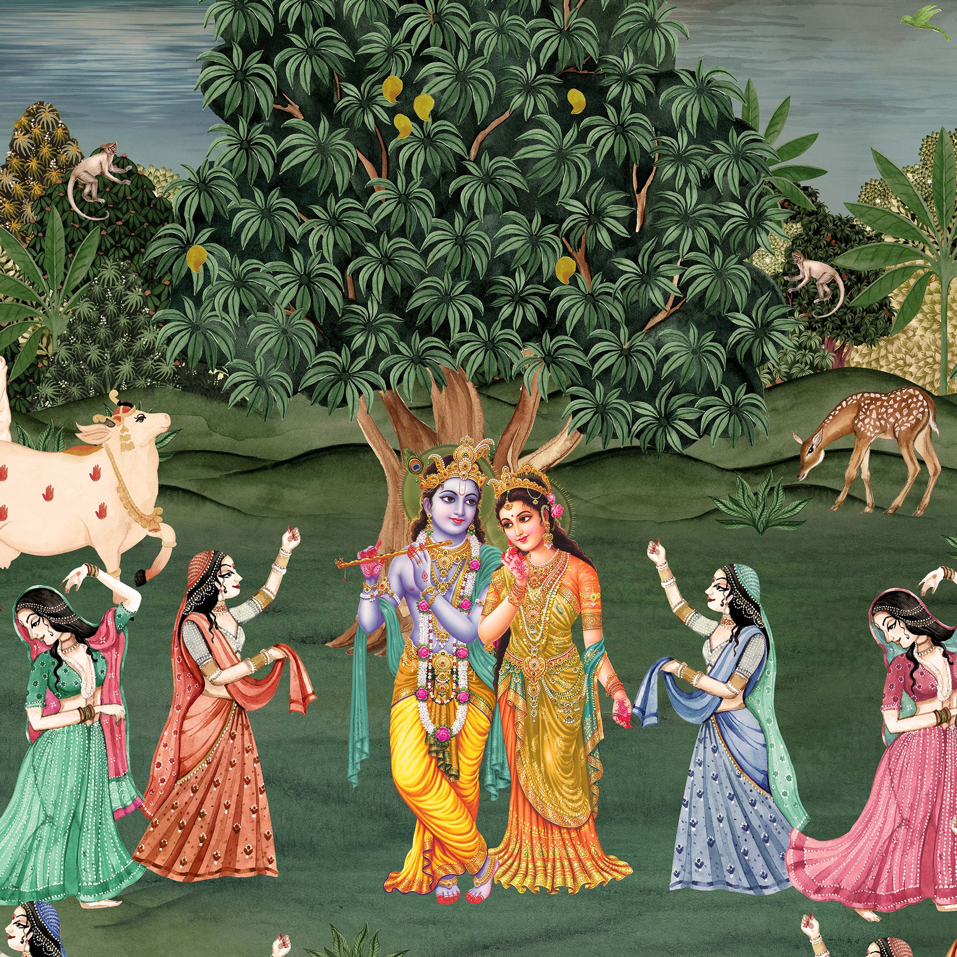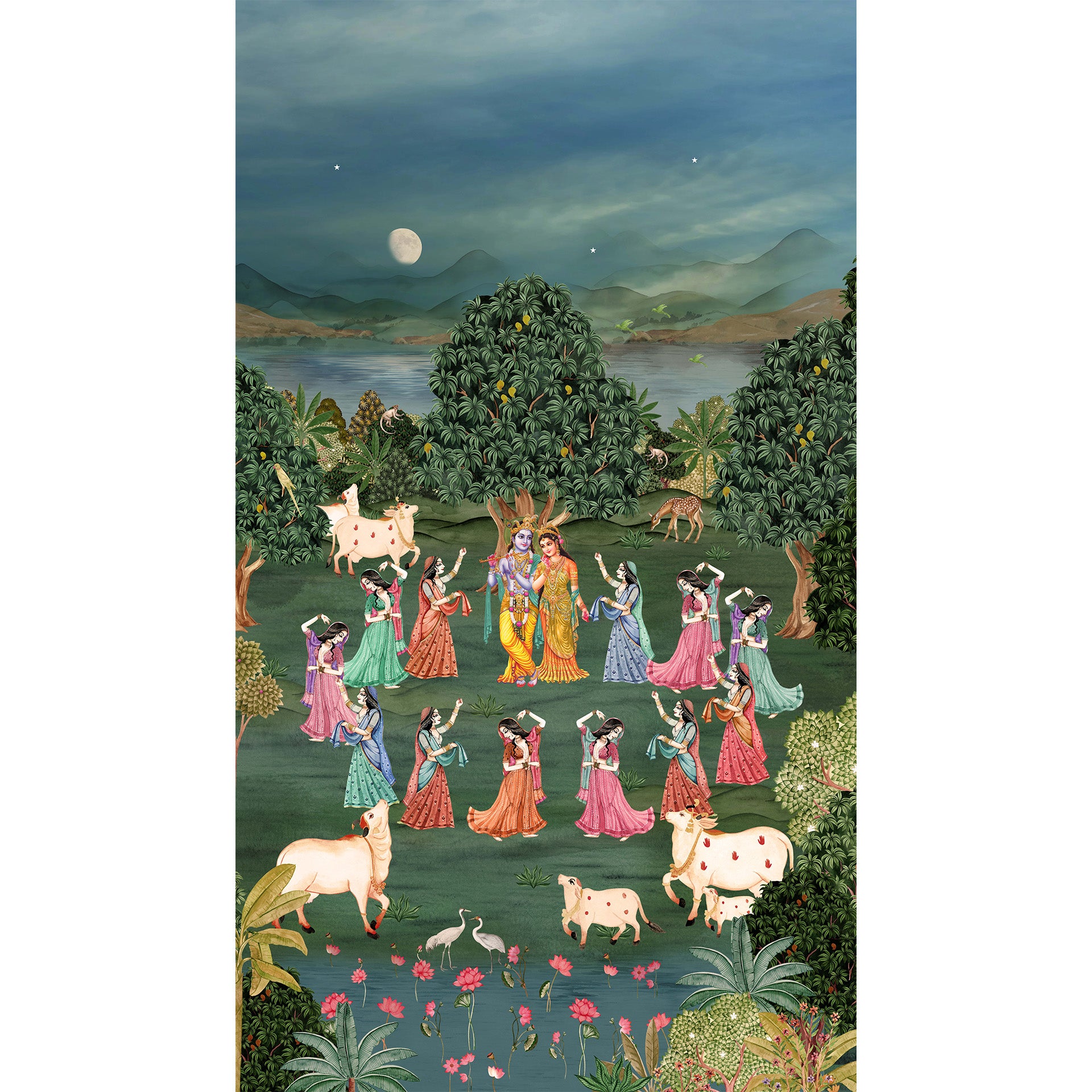 Colorful traditional painting of Radha and Krishna dancing with gopis in a moonlit forest by a lotus pond, surrounded by cows, deer and lush foliage, conveying devotion, romance and serenity.
