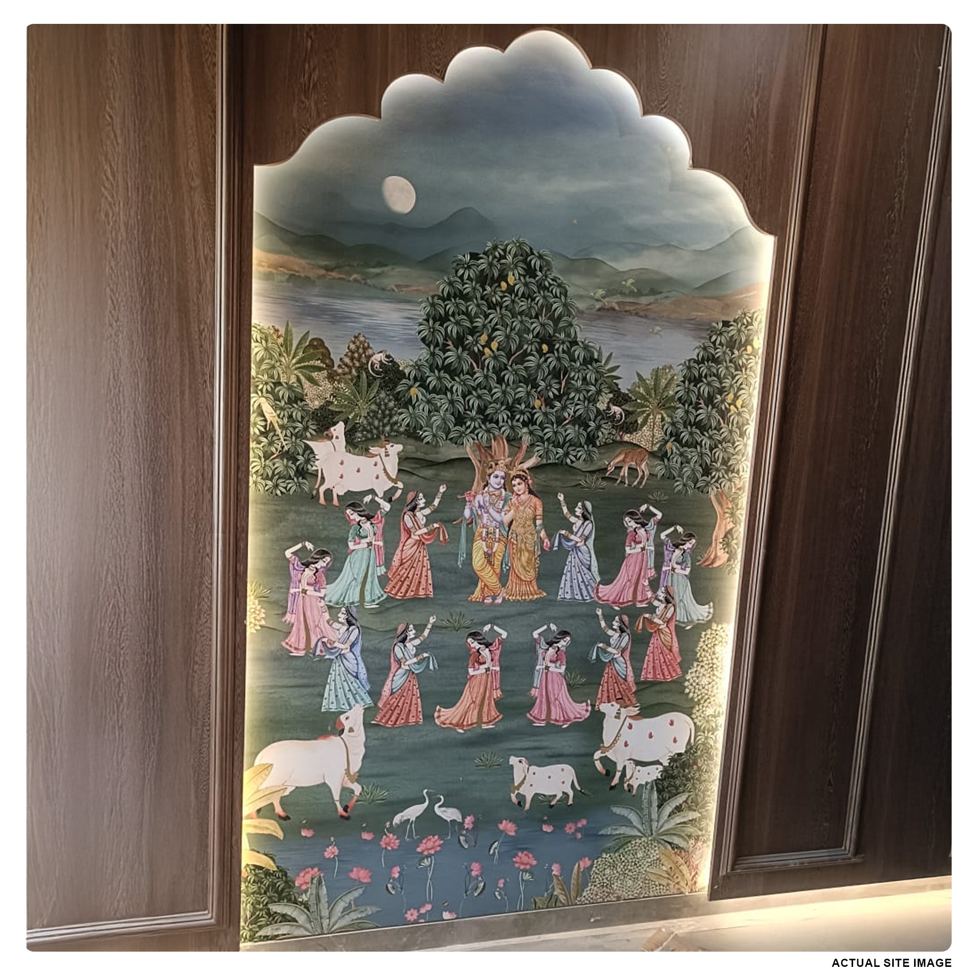 Chandni Raas: Radha and Krishna With Gopis Dancing in Moonlit Forest Near Cows and Lotus Pond