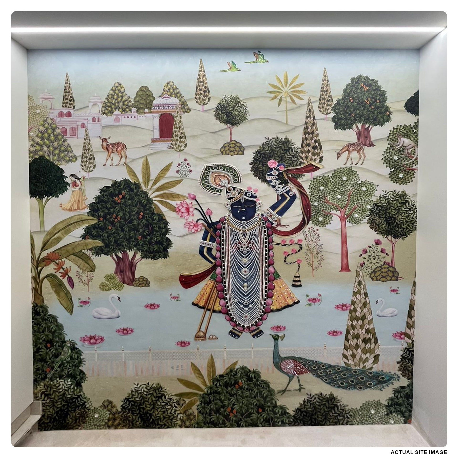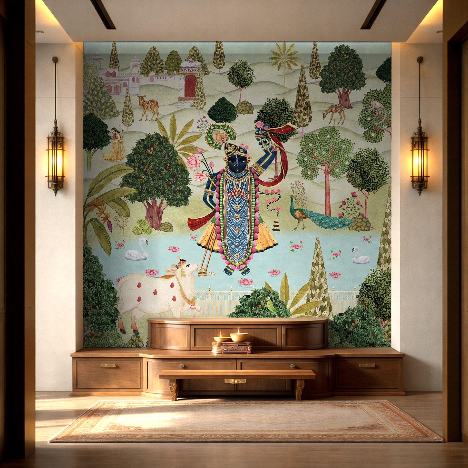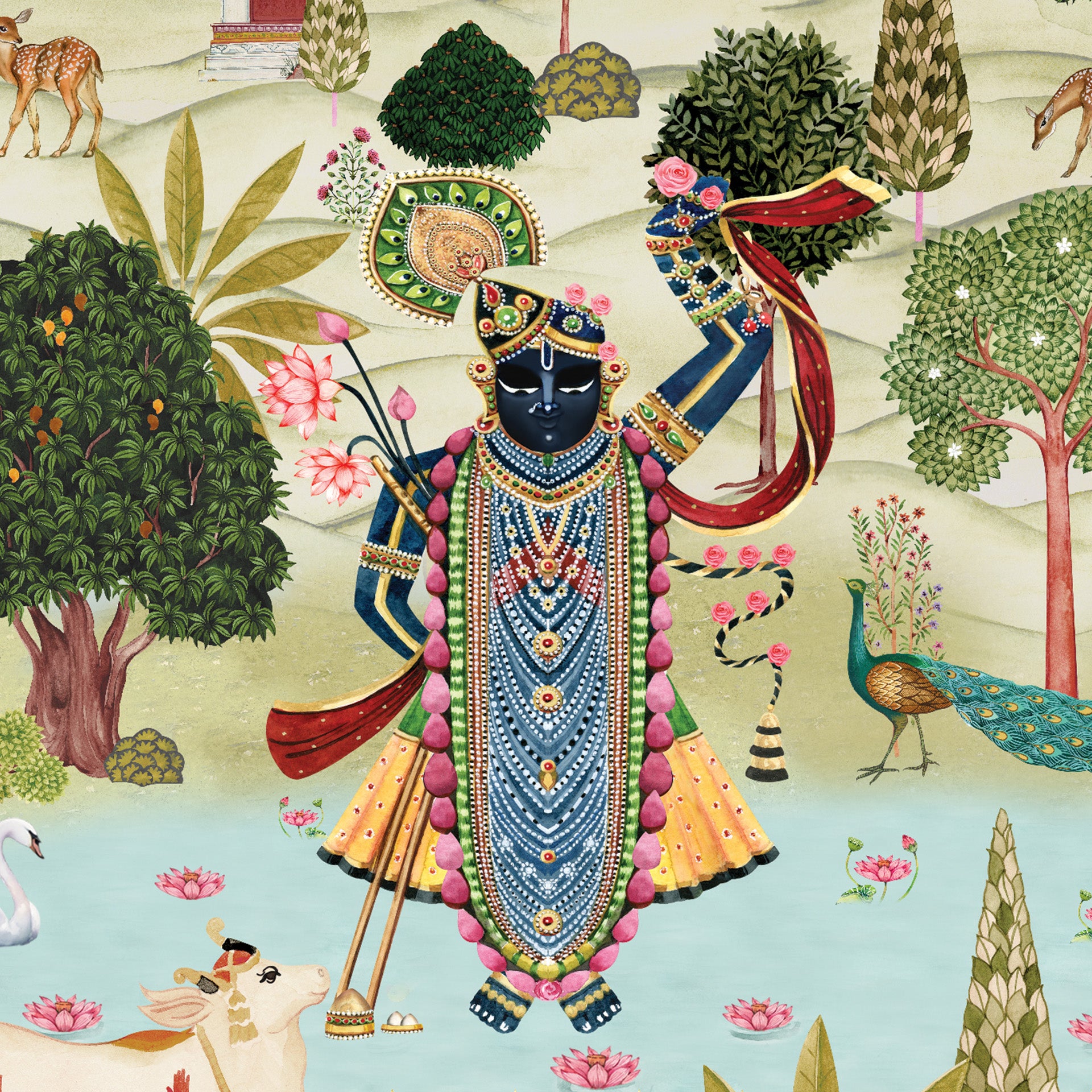 Ornate Krishna depiction in a traditional Indian miniature painting style, showing the deity beside a sacred cow, peacock and lotus pond surrounded by lush trees, deer and a serene palace landscape.