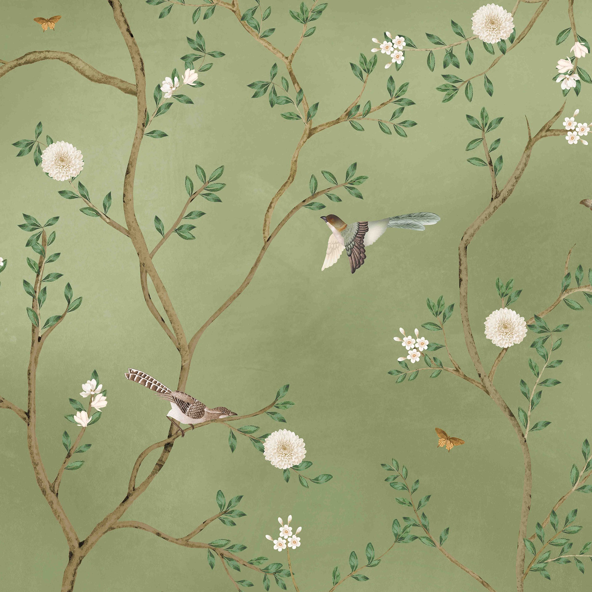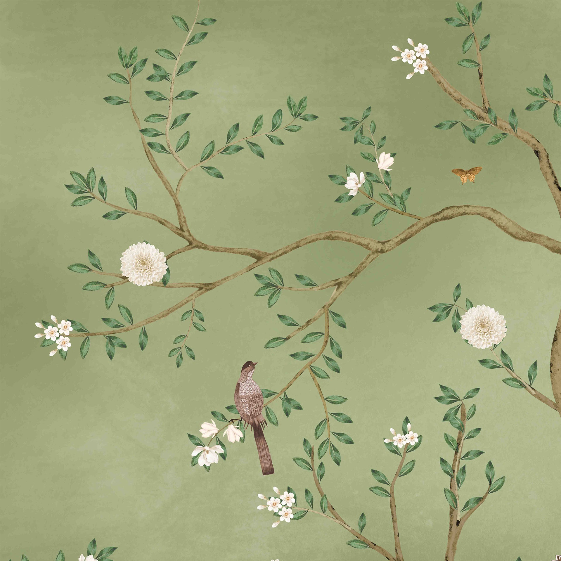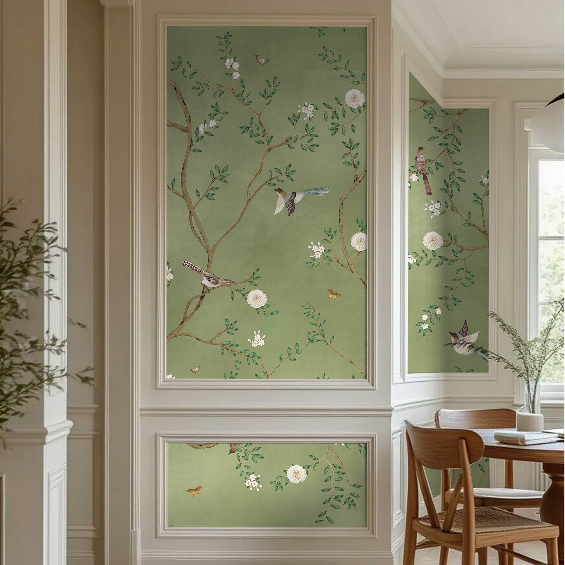 Elegant green chinoiserie wallpaper featuring delicate branches, white blossoms and small songbirds. A hand-painted botanical motif with vintage Asian-inspired charm