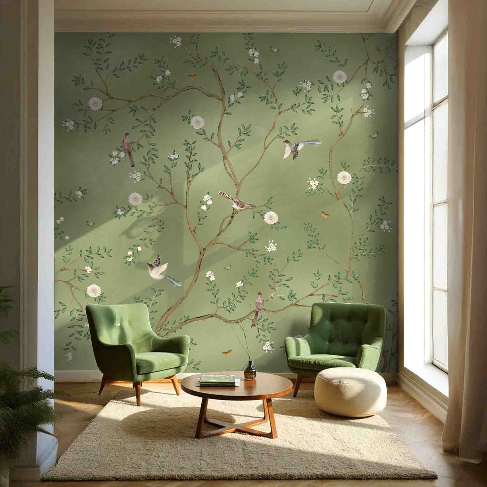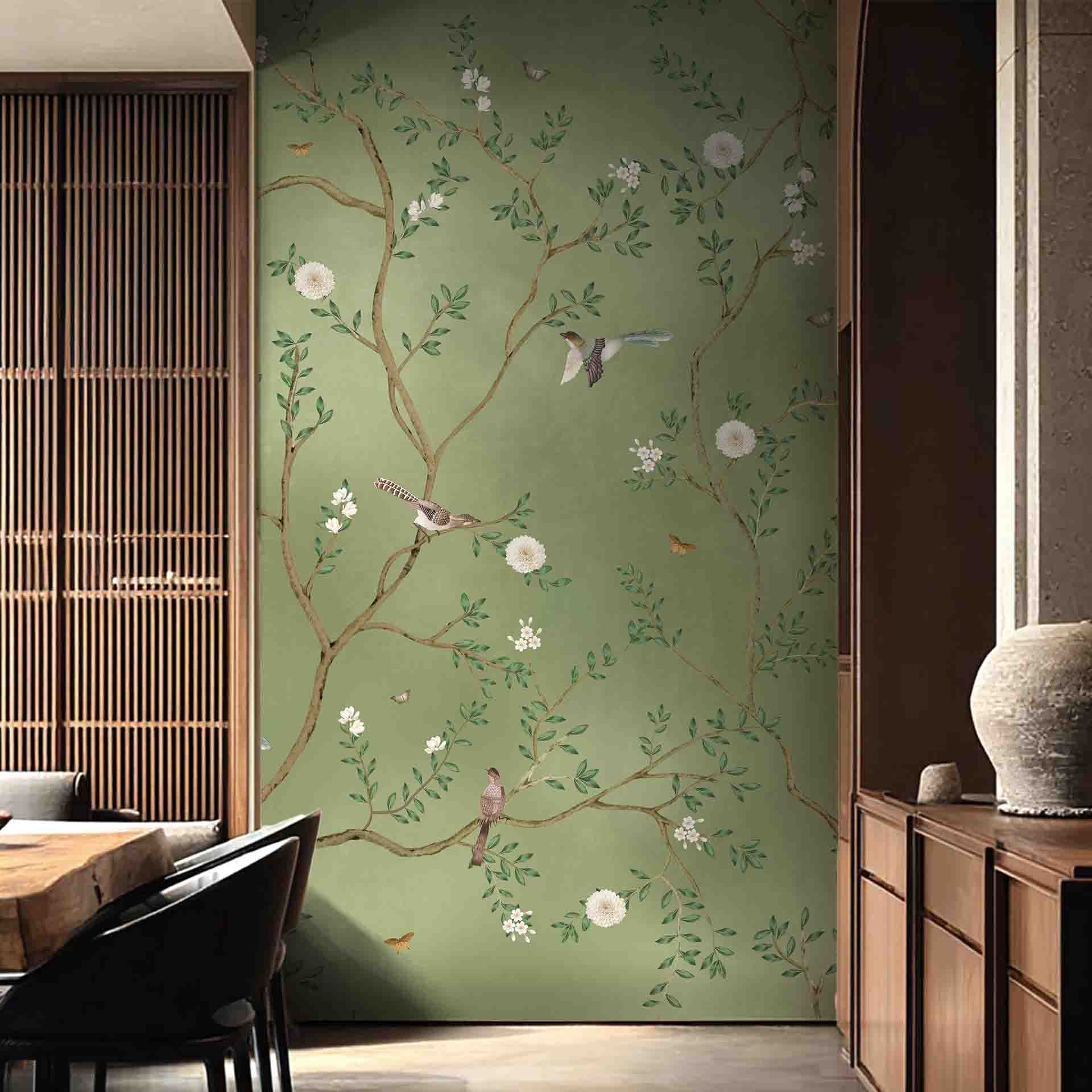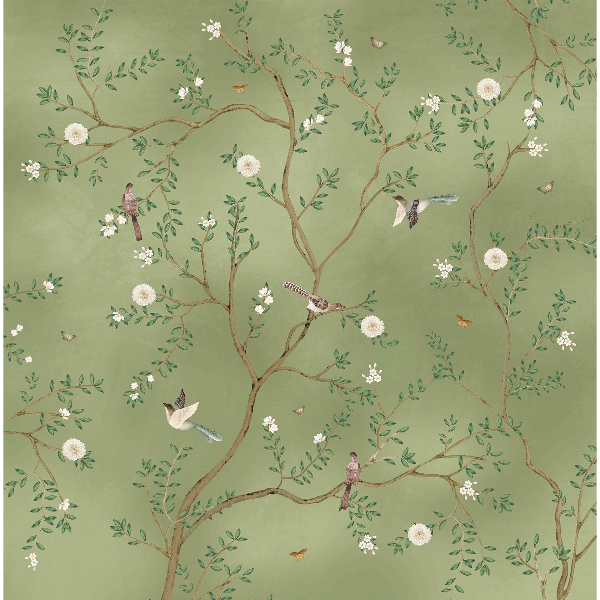 Elegant green chinoiserie wallpaper featuring delicate branches, white blossoms and small songbirds. A hand-painted botanical motif with vintage Asian-inspired charm