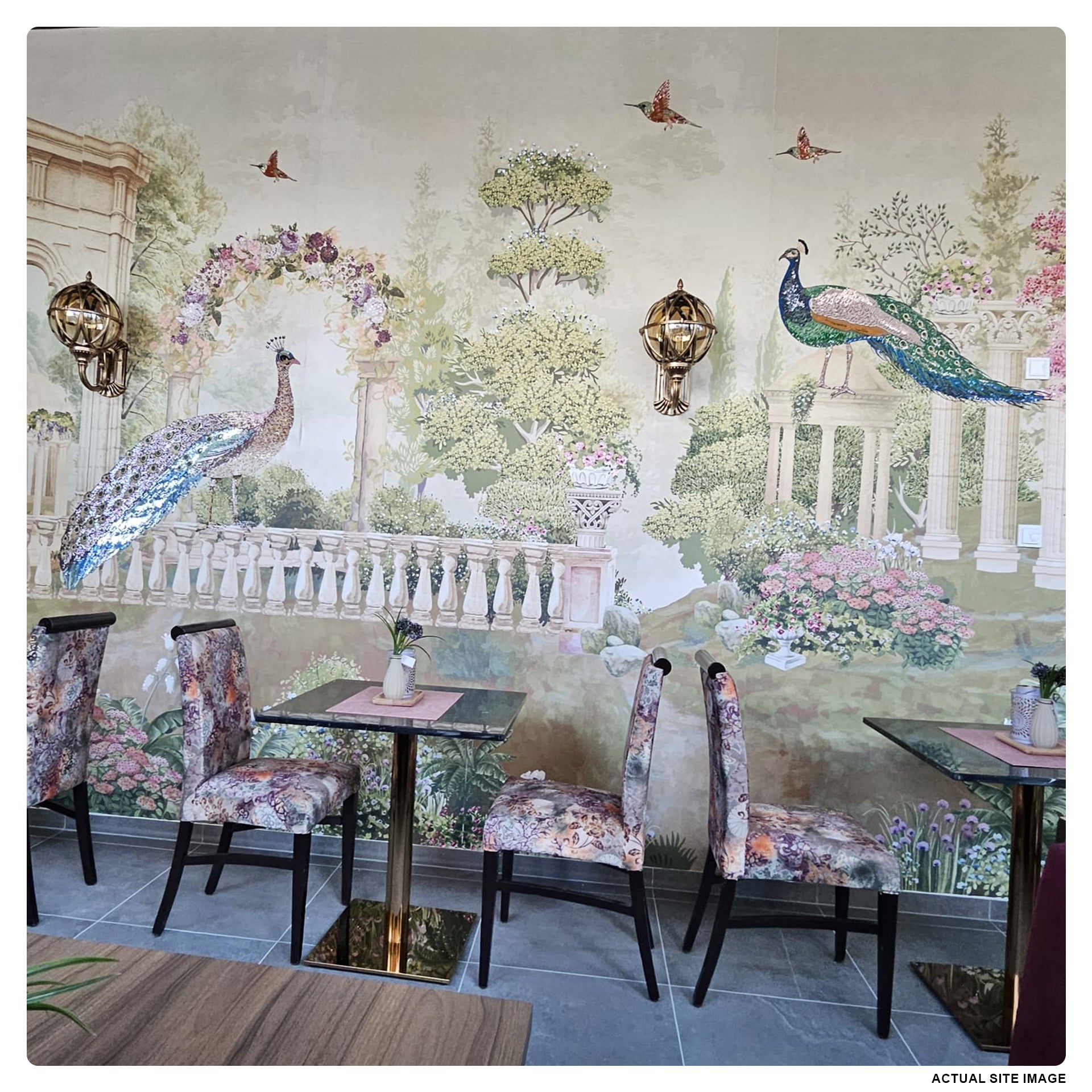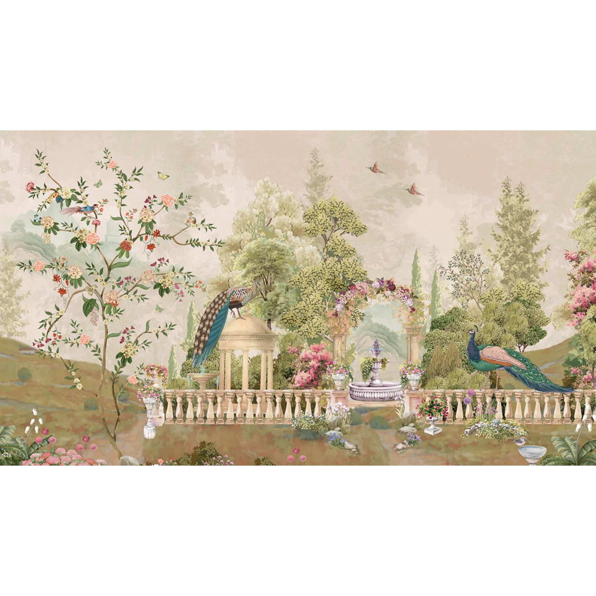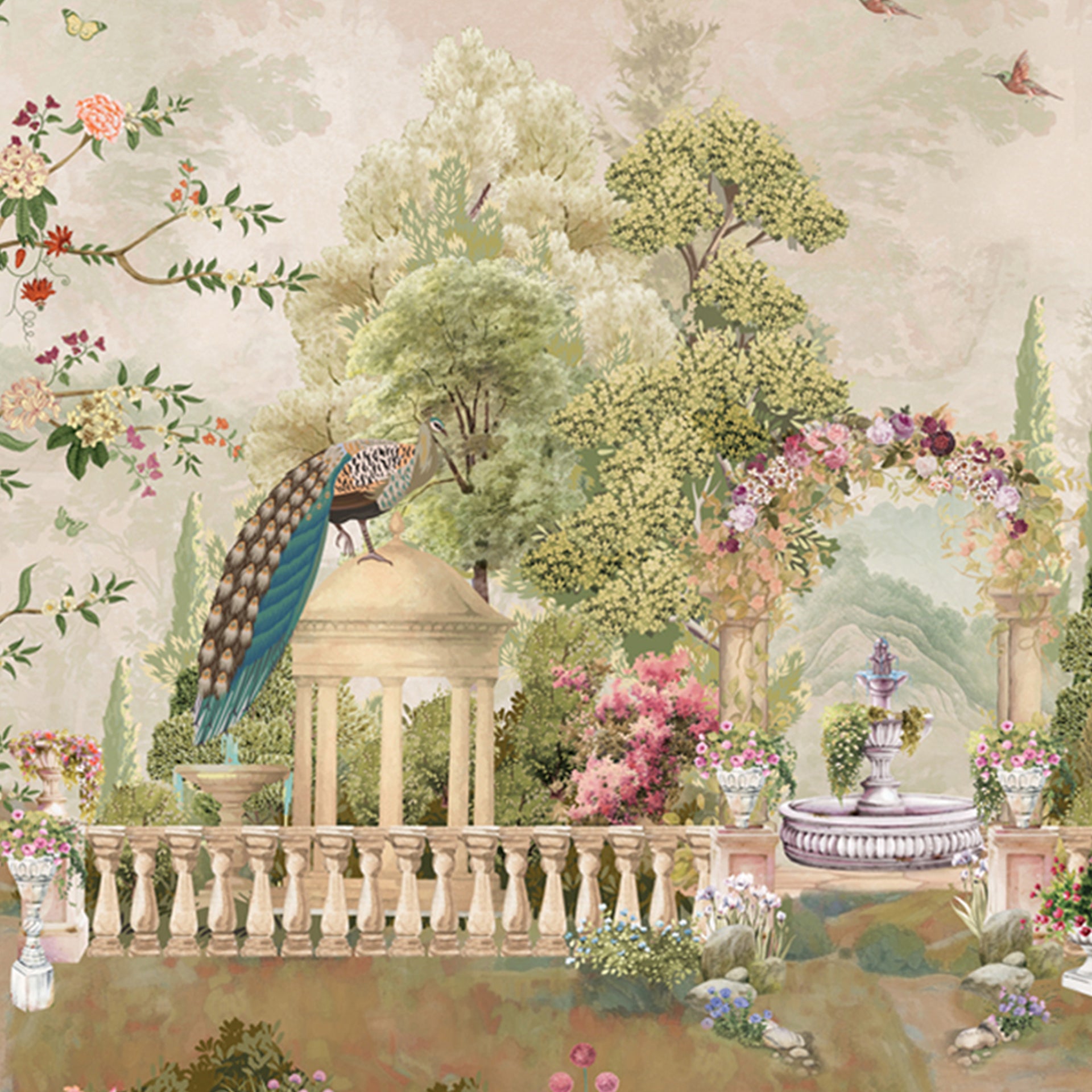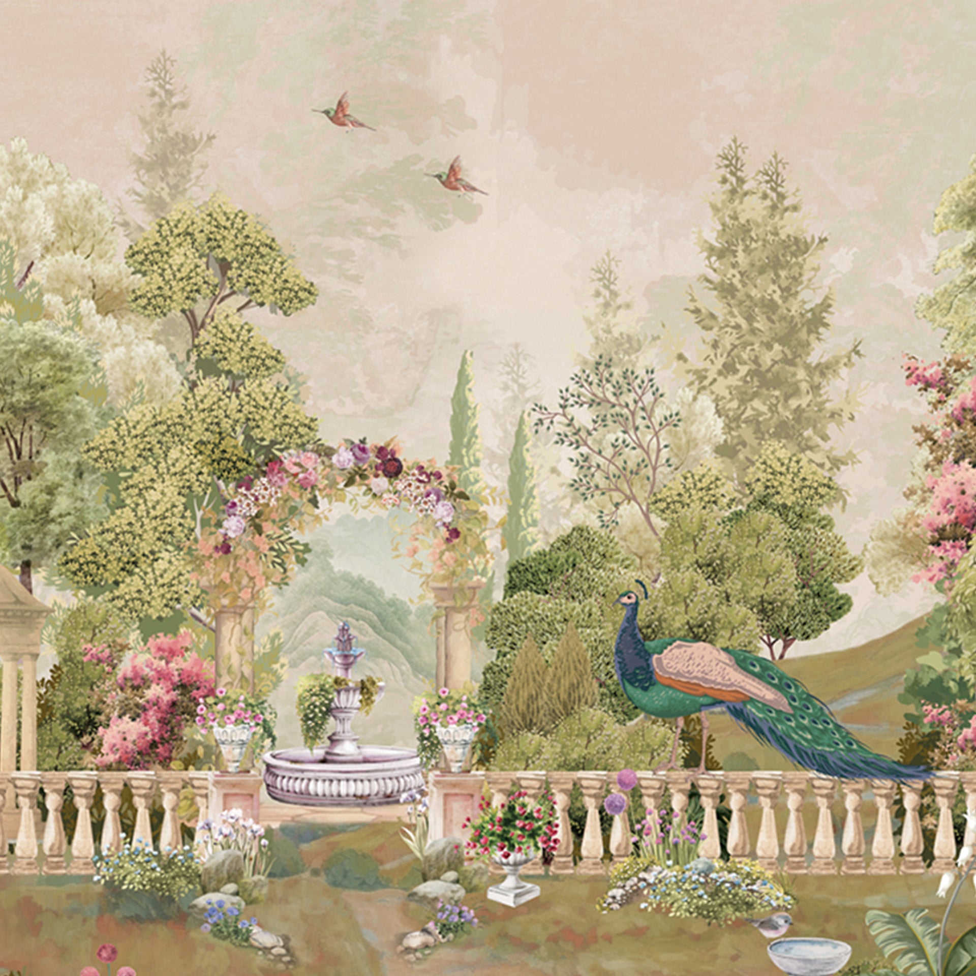 Pastel garden mural featuring peacocks, flowering trees, a classical gazebo, and a decorative balustrade with a central fountain. A tranquil, romantic backdrop suitable for decor, art, and storytelling visuals.
