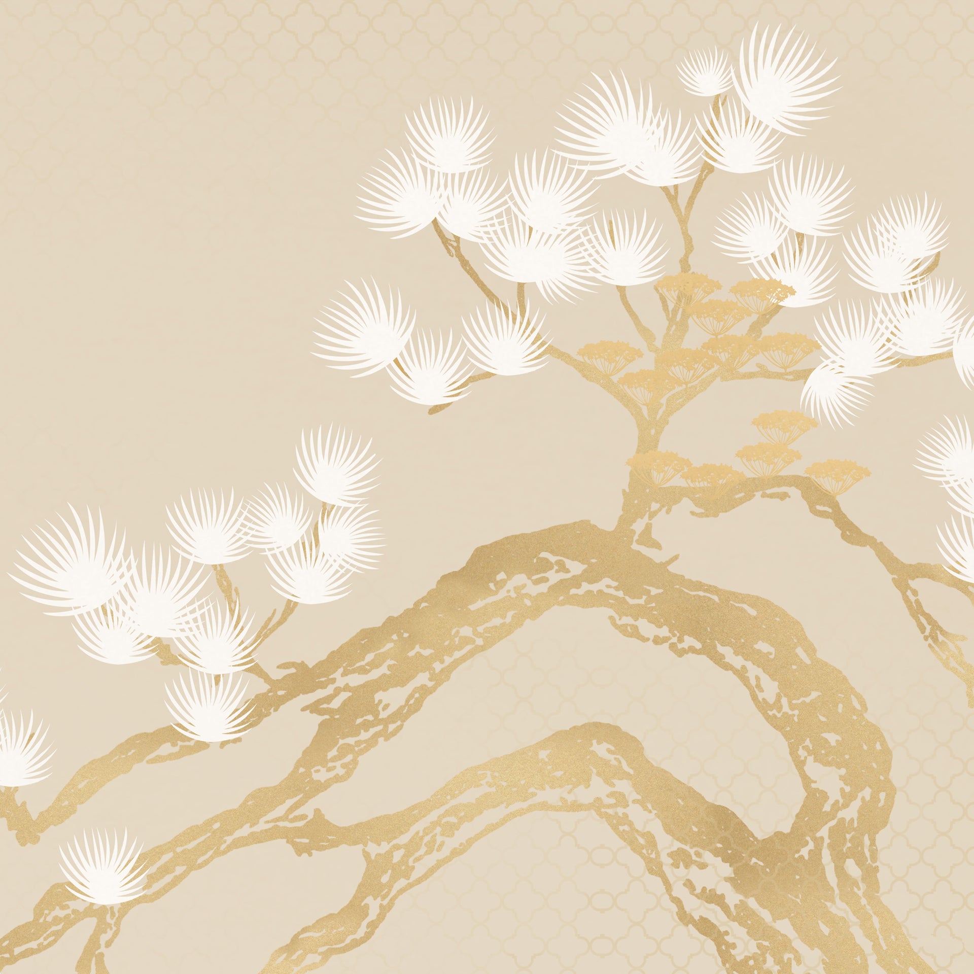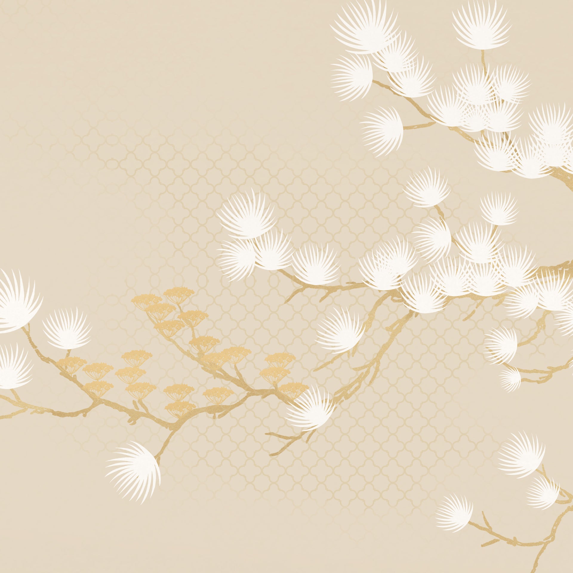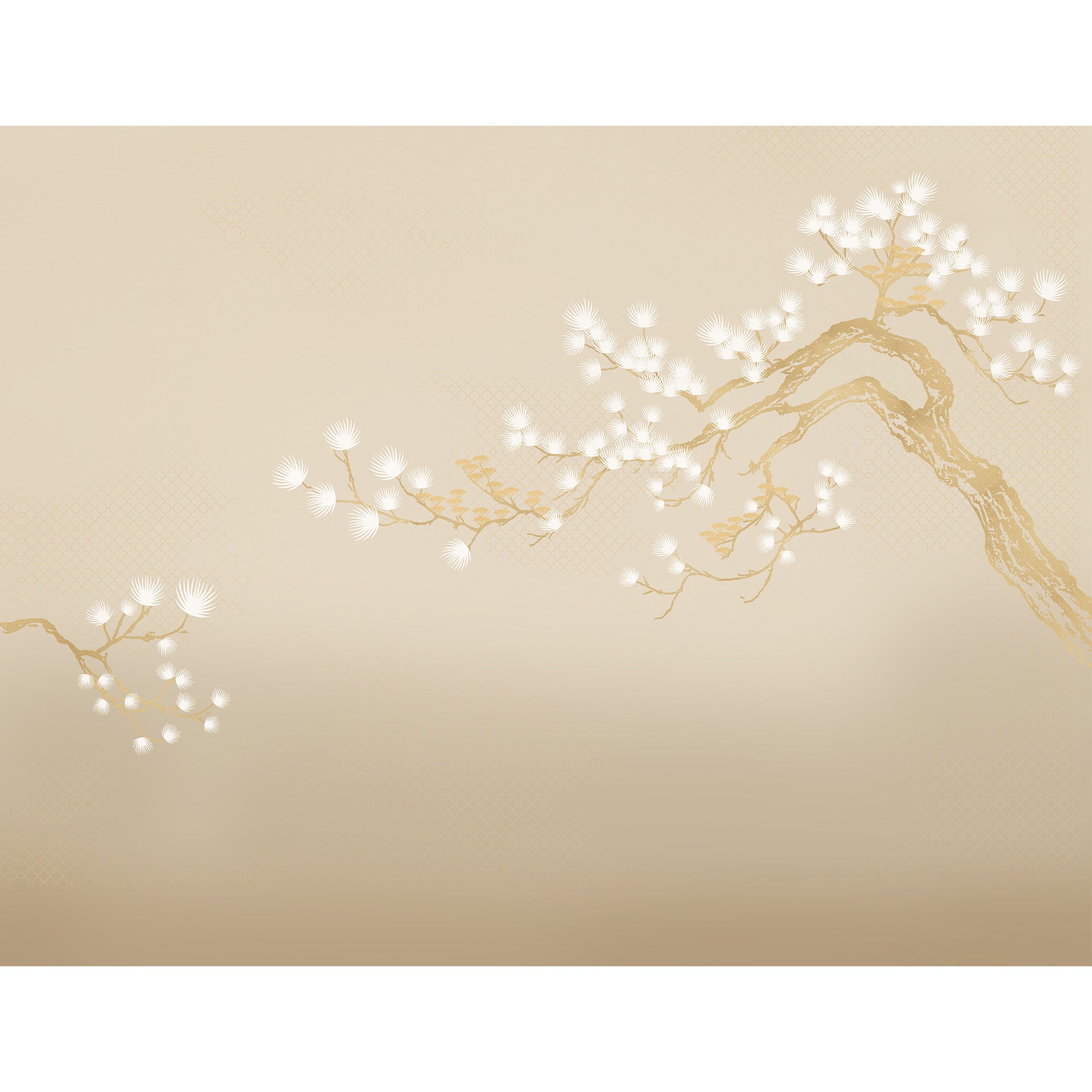 Serene beige background featuring delicate gold branches and stylized white blossoms with subtle oriental patterning. Elegant, minimal design ideal for invitations, web backgrounds, packaging, stationery, and interior decor projects.