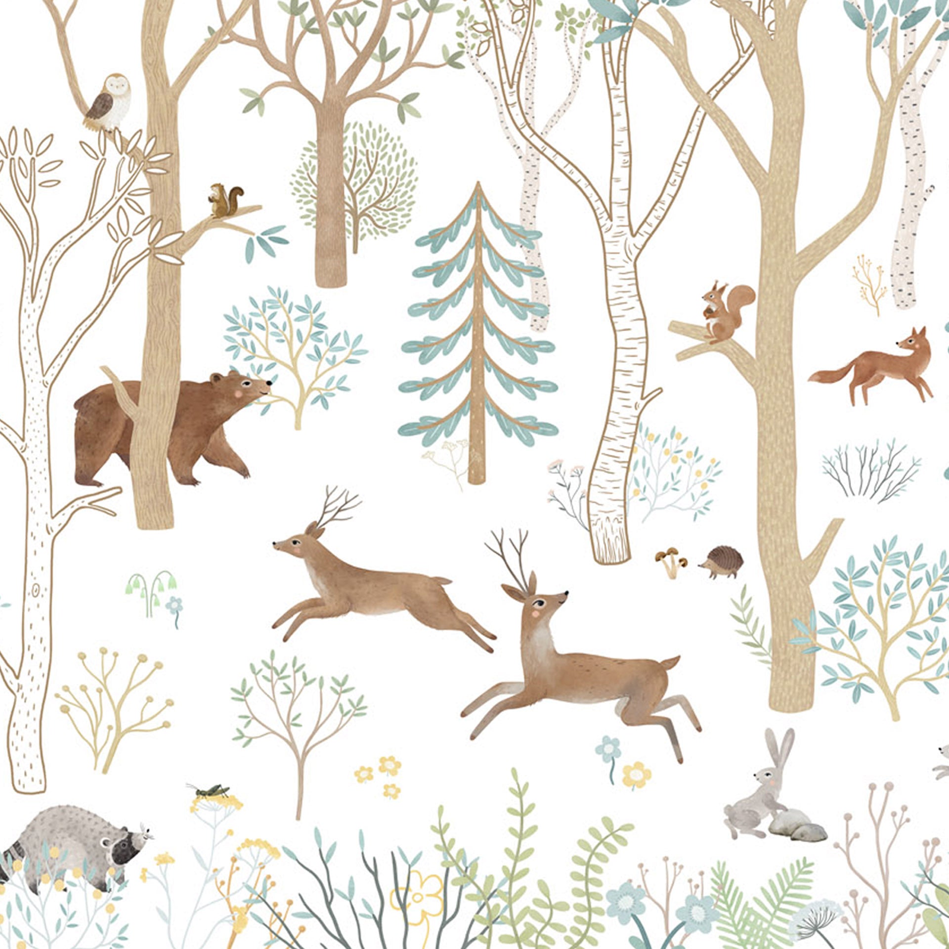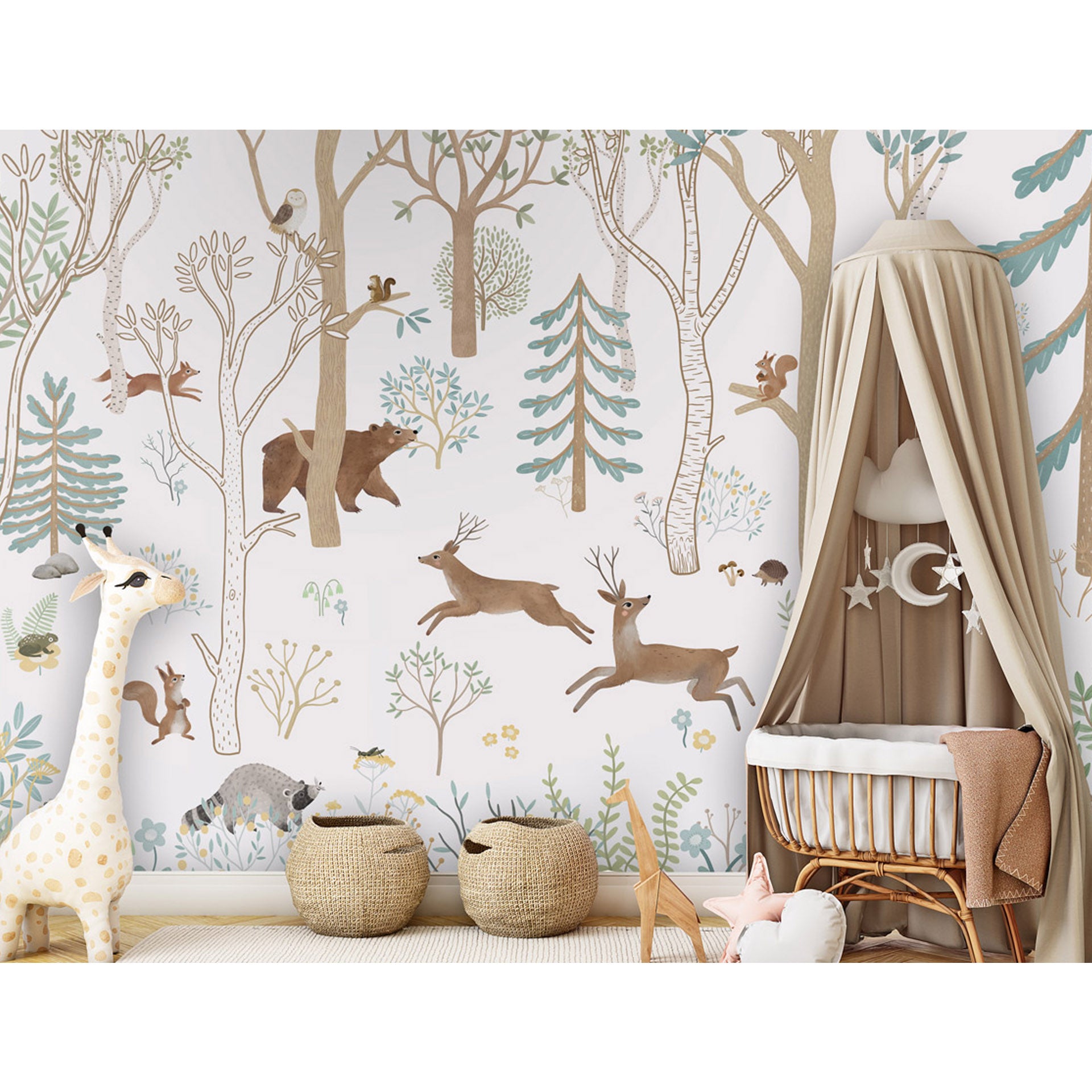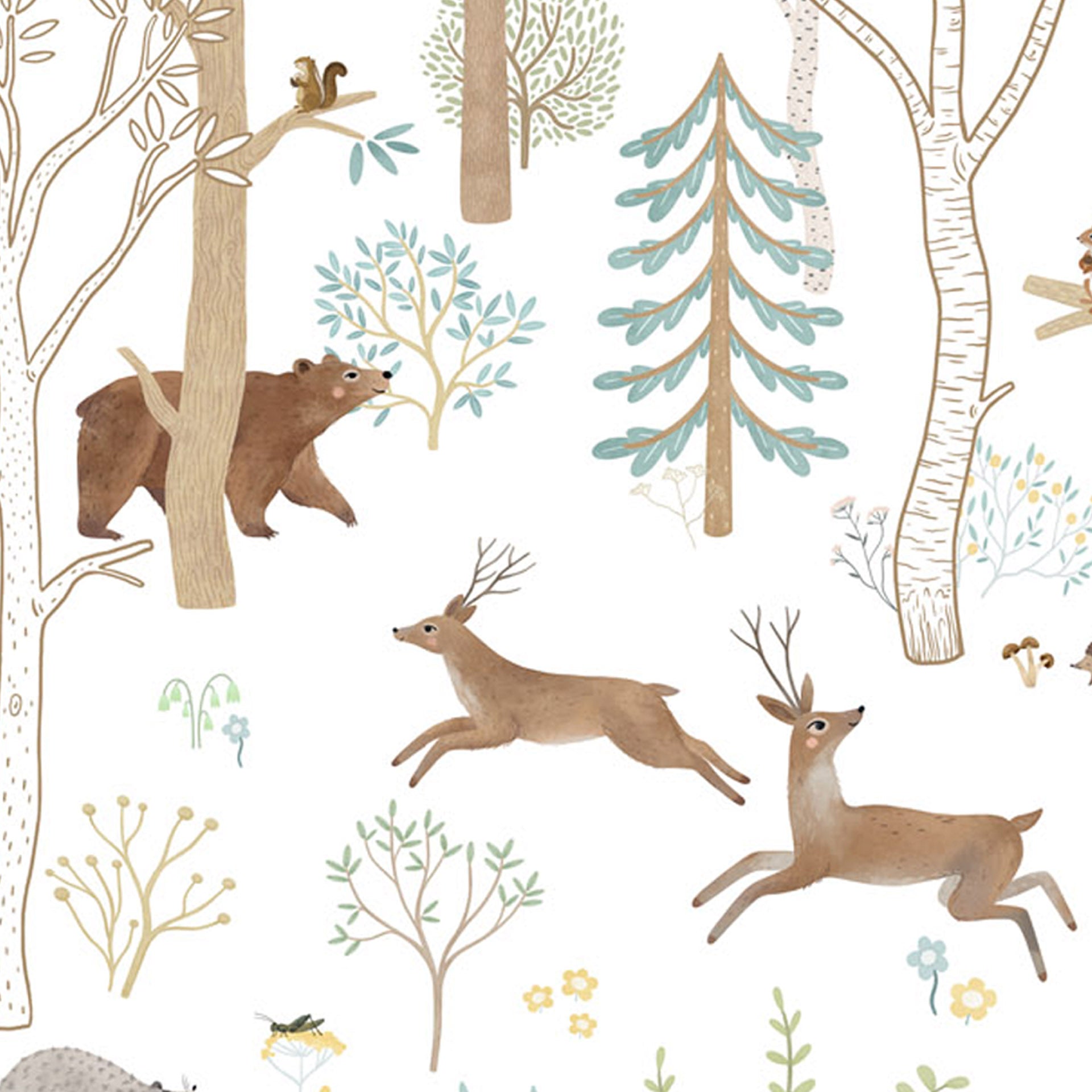 Delicate watercolor illustration of woodland forest animals among birch and pine trees, wildflowers and foliage. Gentle, whimsical pattern ideal for nursery, kids’ products, stationery, textiles, and nature-themed designs.