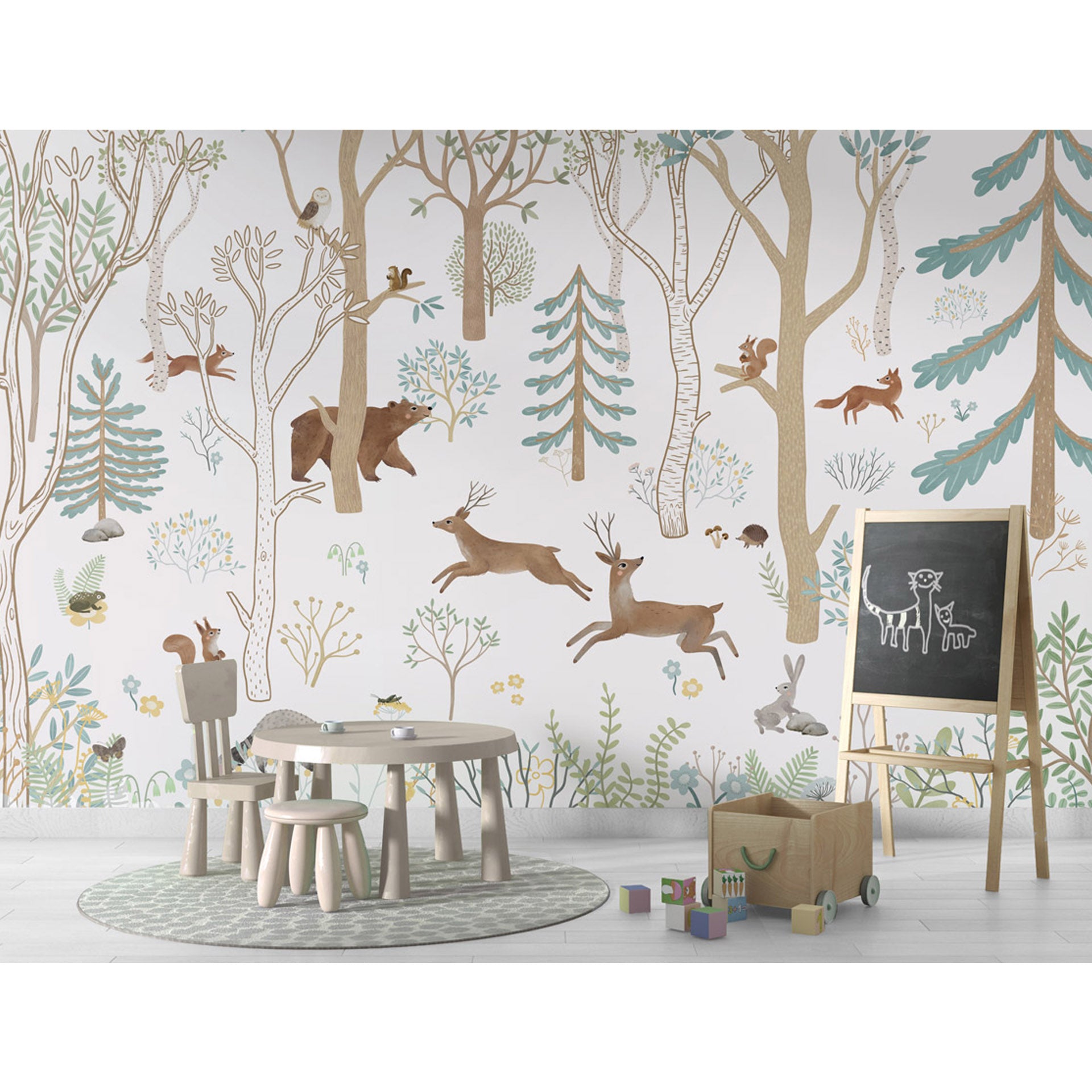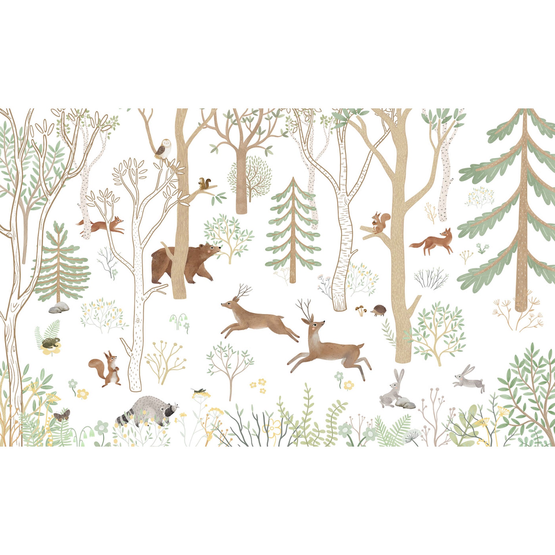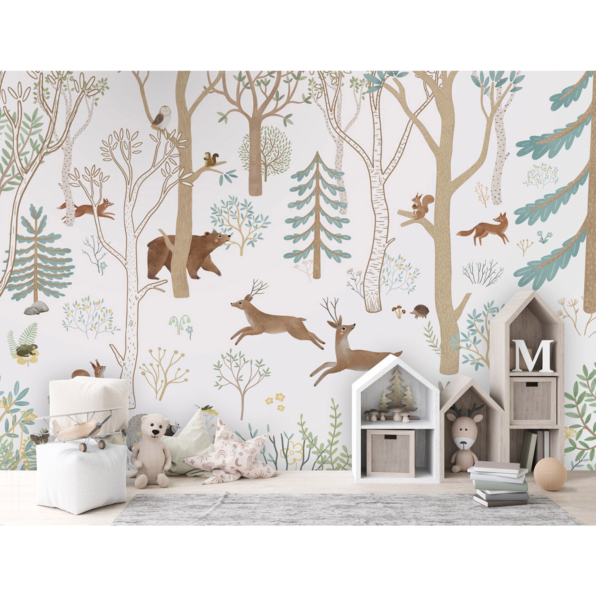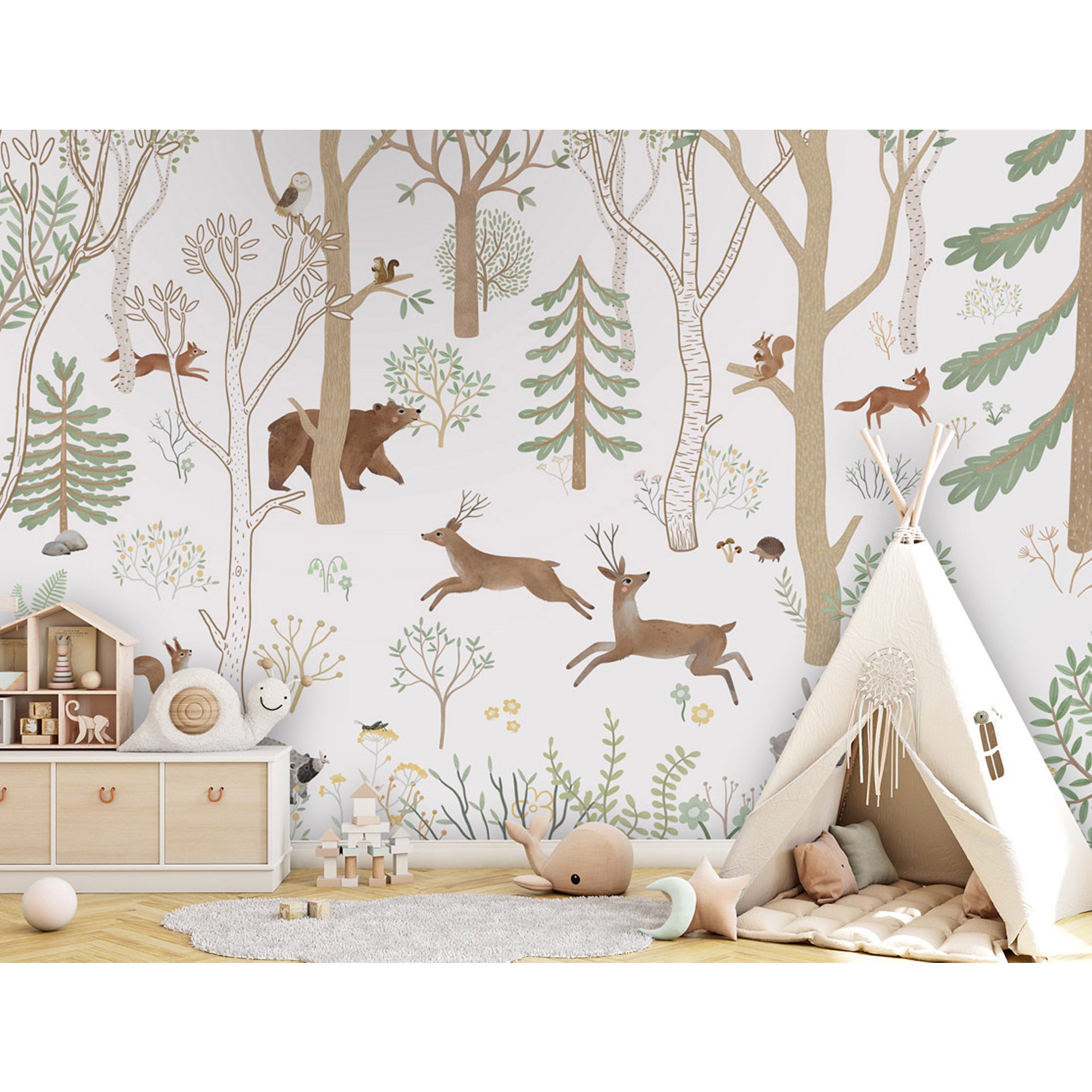 Delicate watercolor illustration of woodland forest animals among birch and pine trees, wildflowers and foliage. Gentle, whimsical pattern ideal for nursery, kids’ products, stationery, textiles, and nature-themed designs.