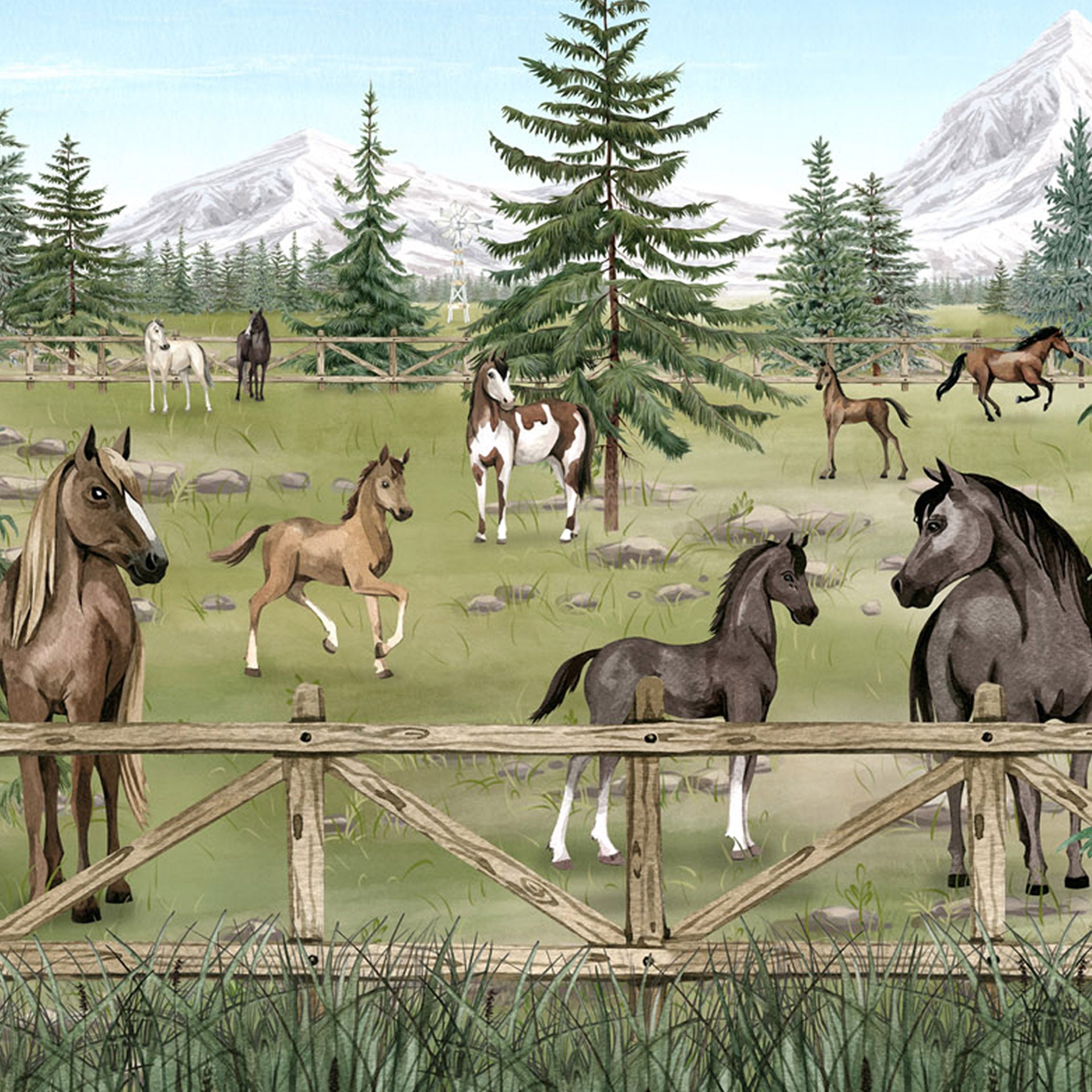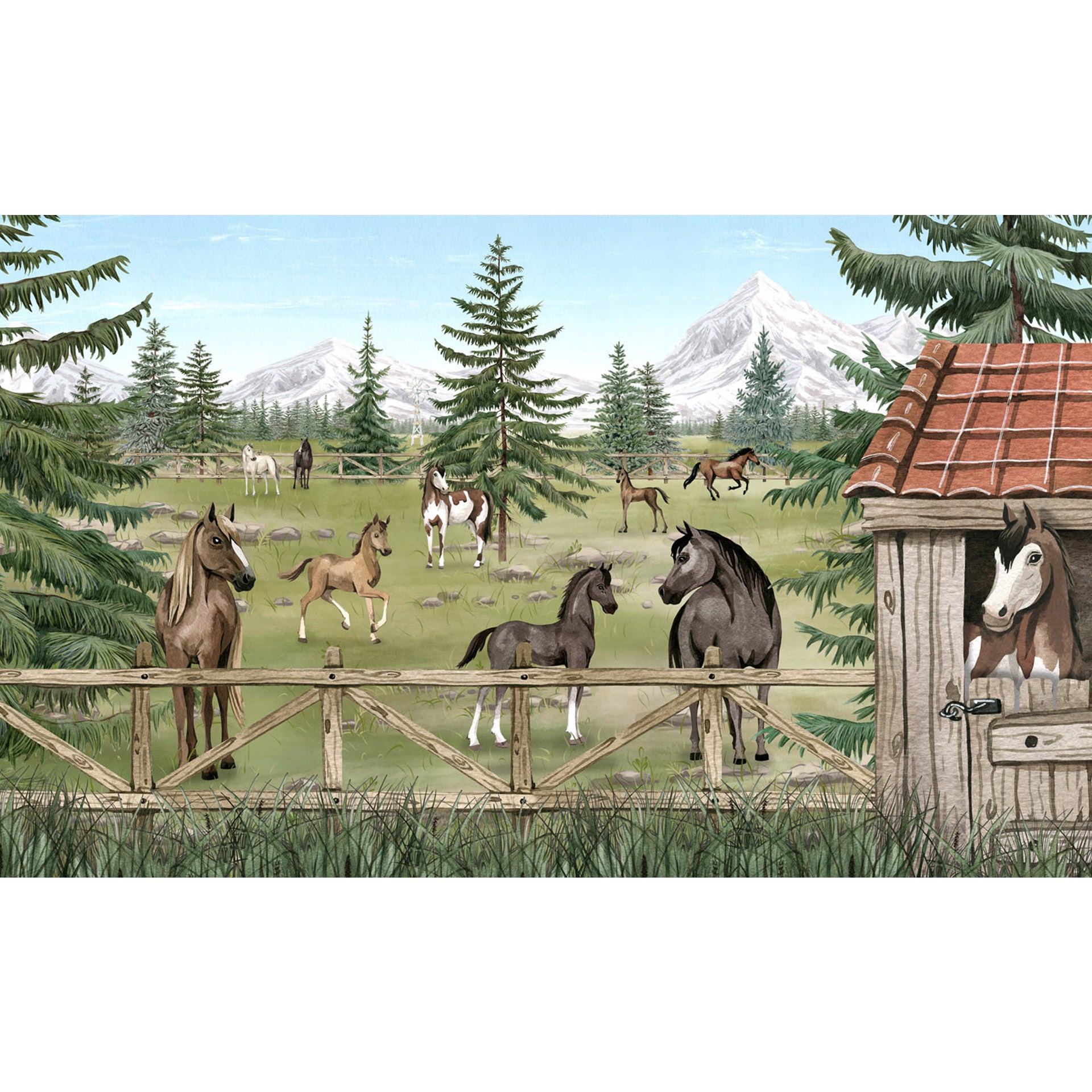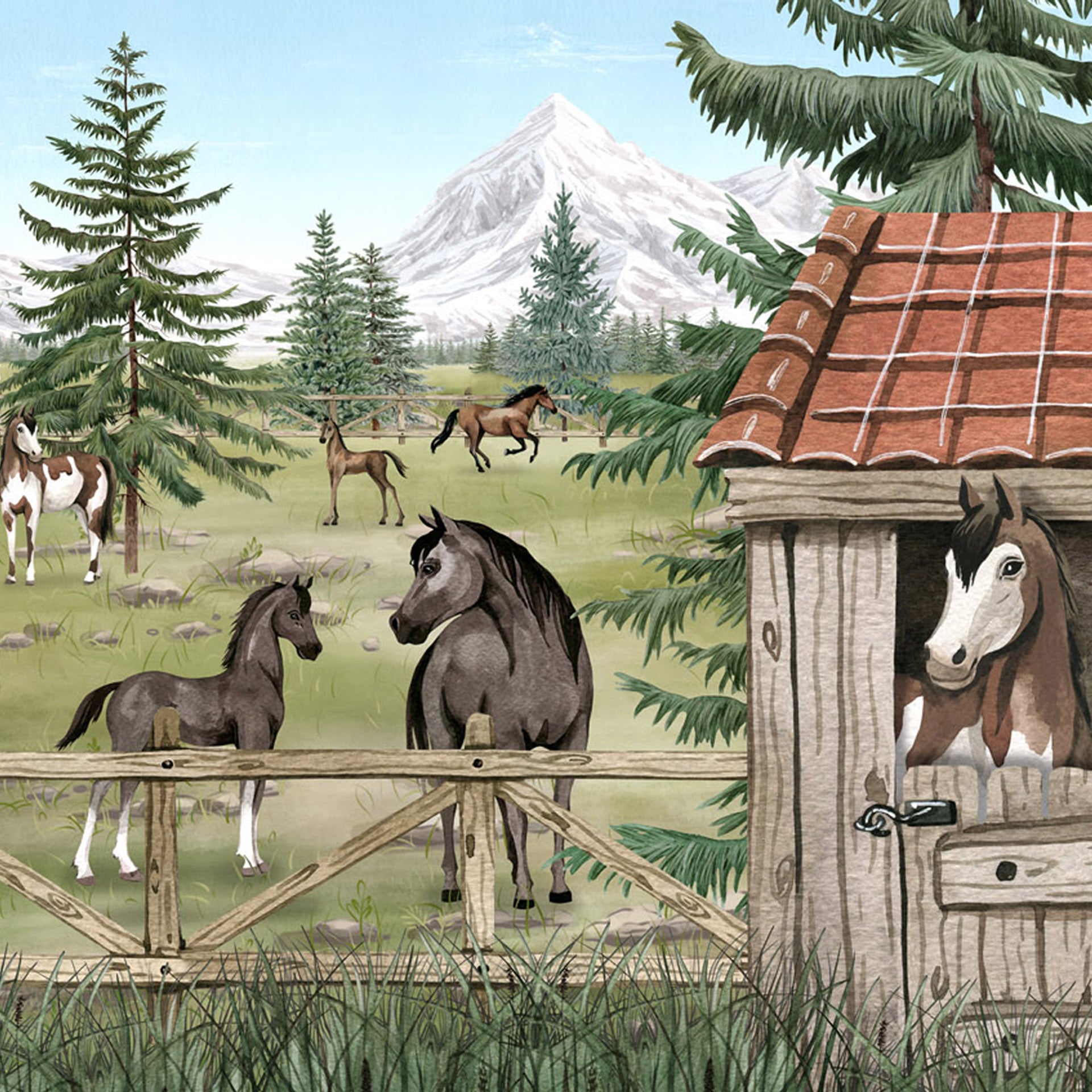 A peaceful herd of horses and playful foals graze in a fenced mountain pasture beside a rustic barn, surrounded by pine trees, wildflowers and distant snow-capped peaks.