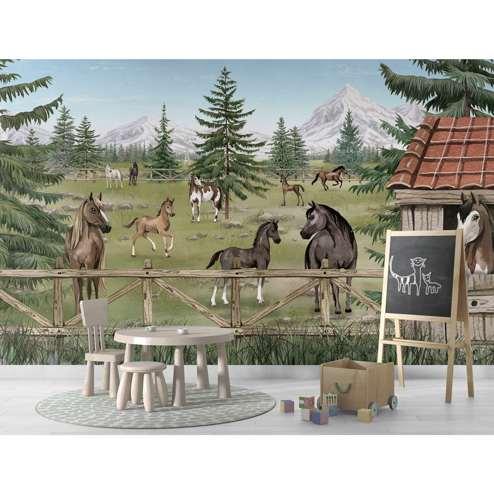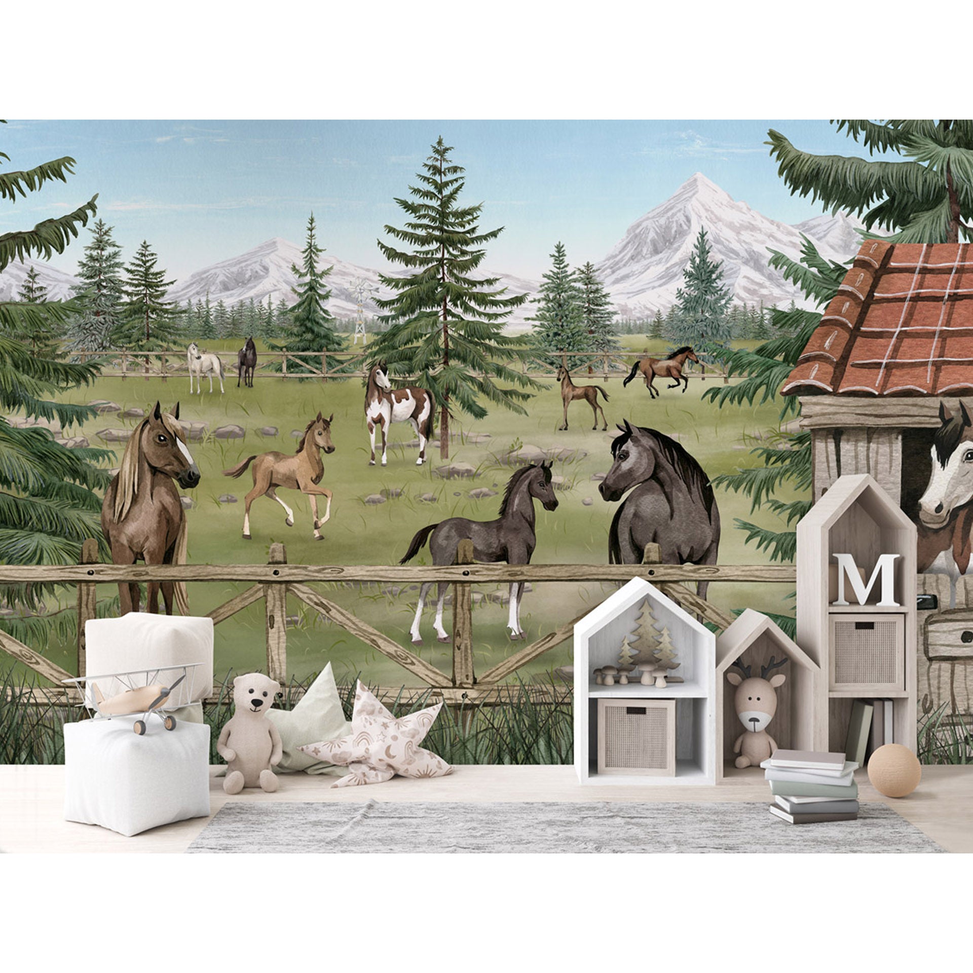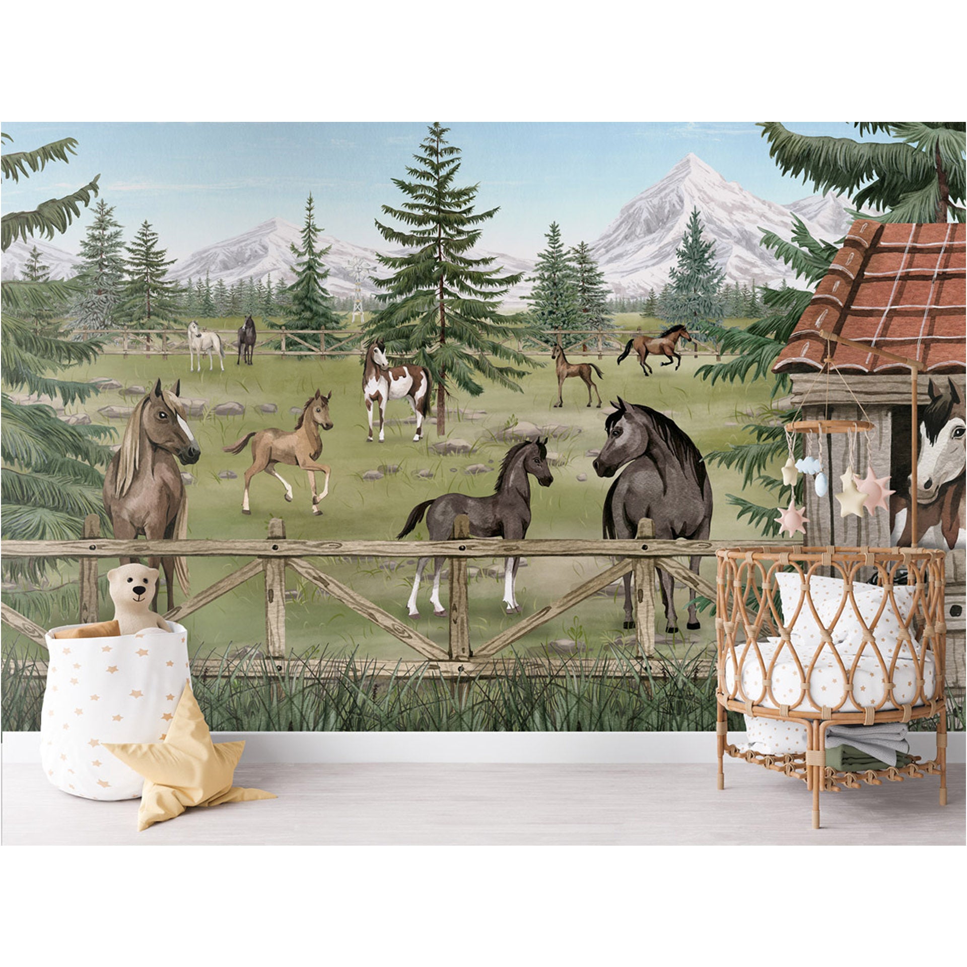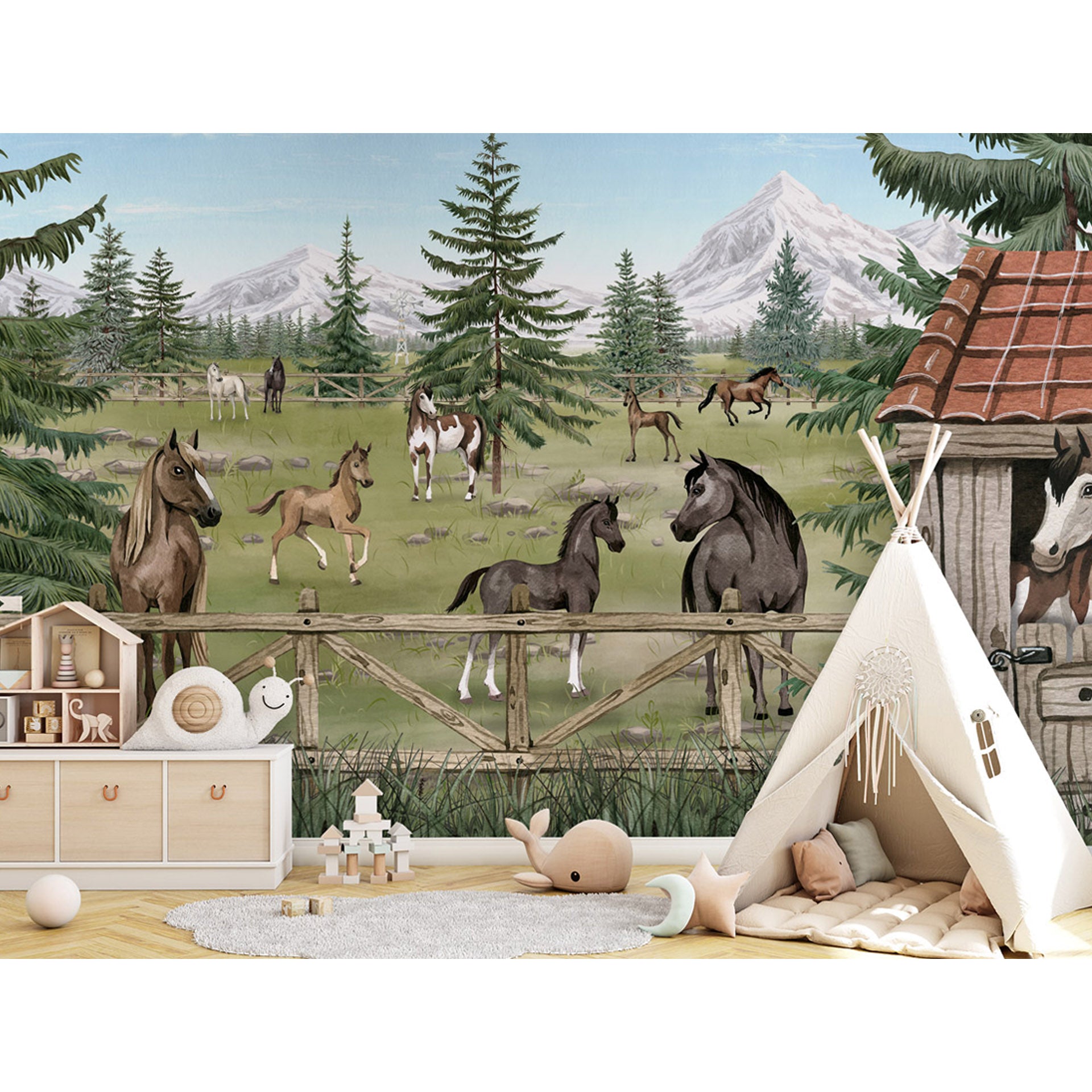 A peaceful herd of horses and playful foals graze in a fenced mountain pasture beside a rustic barn, surrounded by pine trees, wildflowers and distant snow-capped peaks.