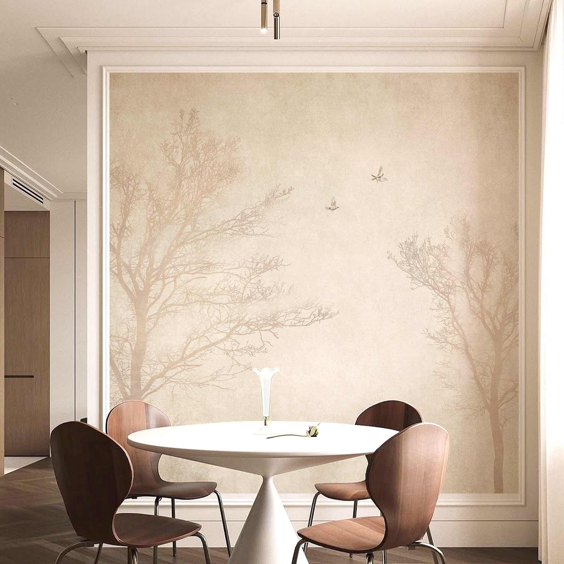 A tranquil, sepia-toned scene of leafless trees against a soft sky. Small birds glide between branches, evoking nostalgia and quiet beauty in a vintage woodland setting.