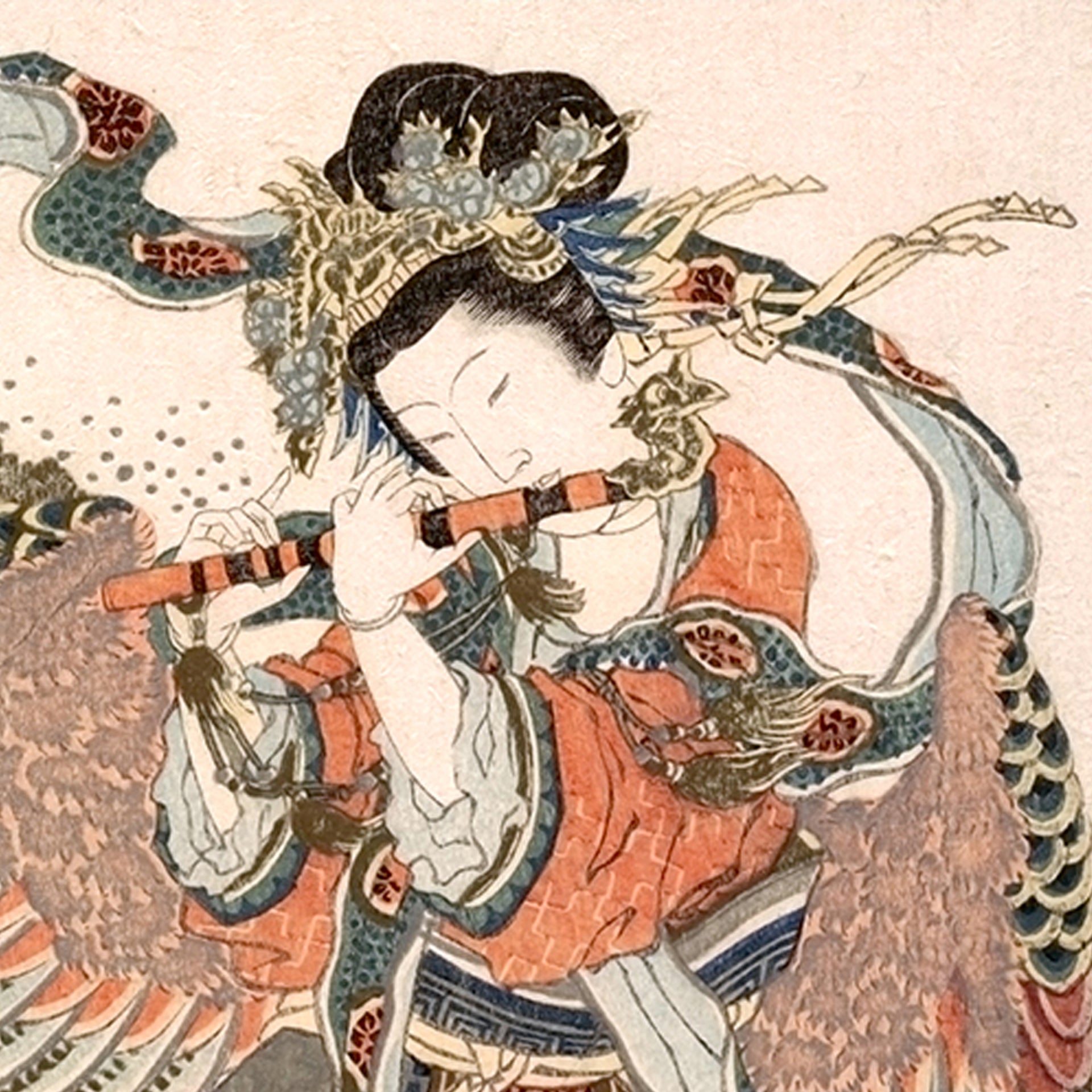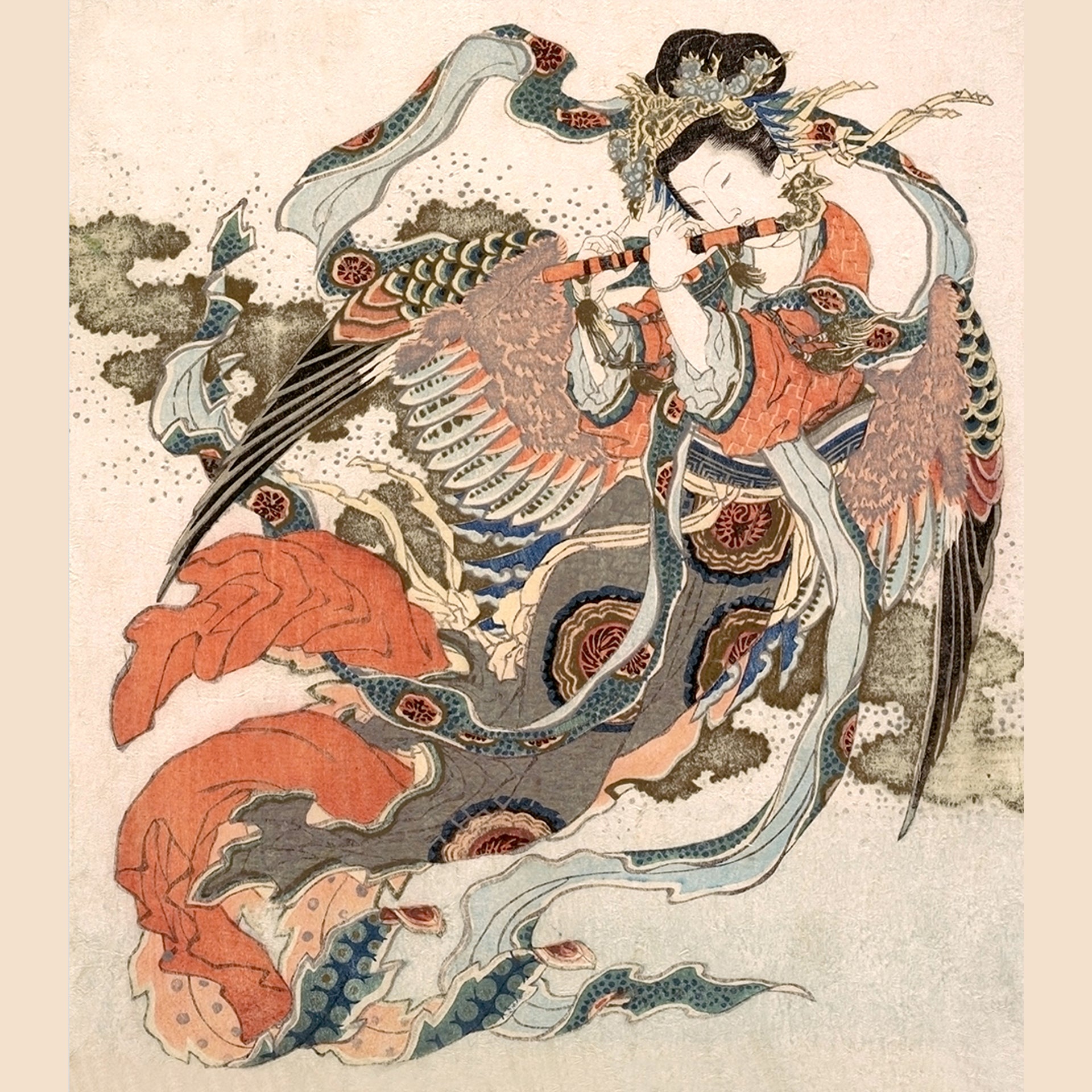 Asian Angel: A Graceful, Traditional Japanese Artwork Featuring A Celestial Maiden Playing A Flute,A Timeless Fusion Of Elegance, Mythology, And Cultural Artistry