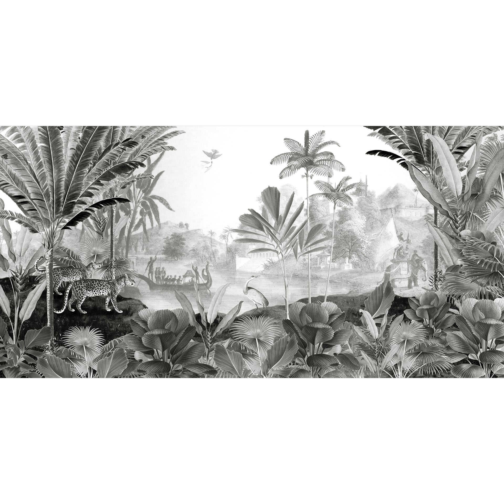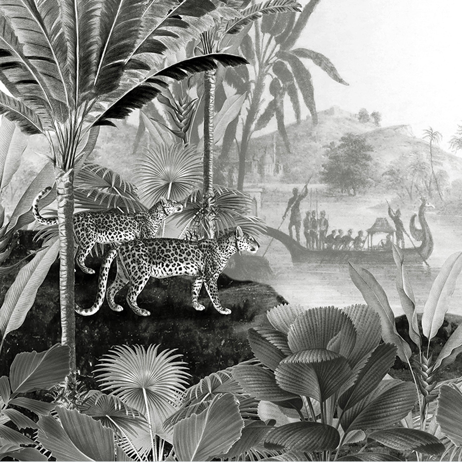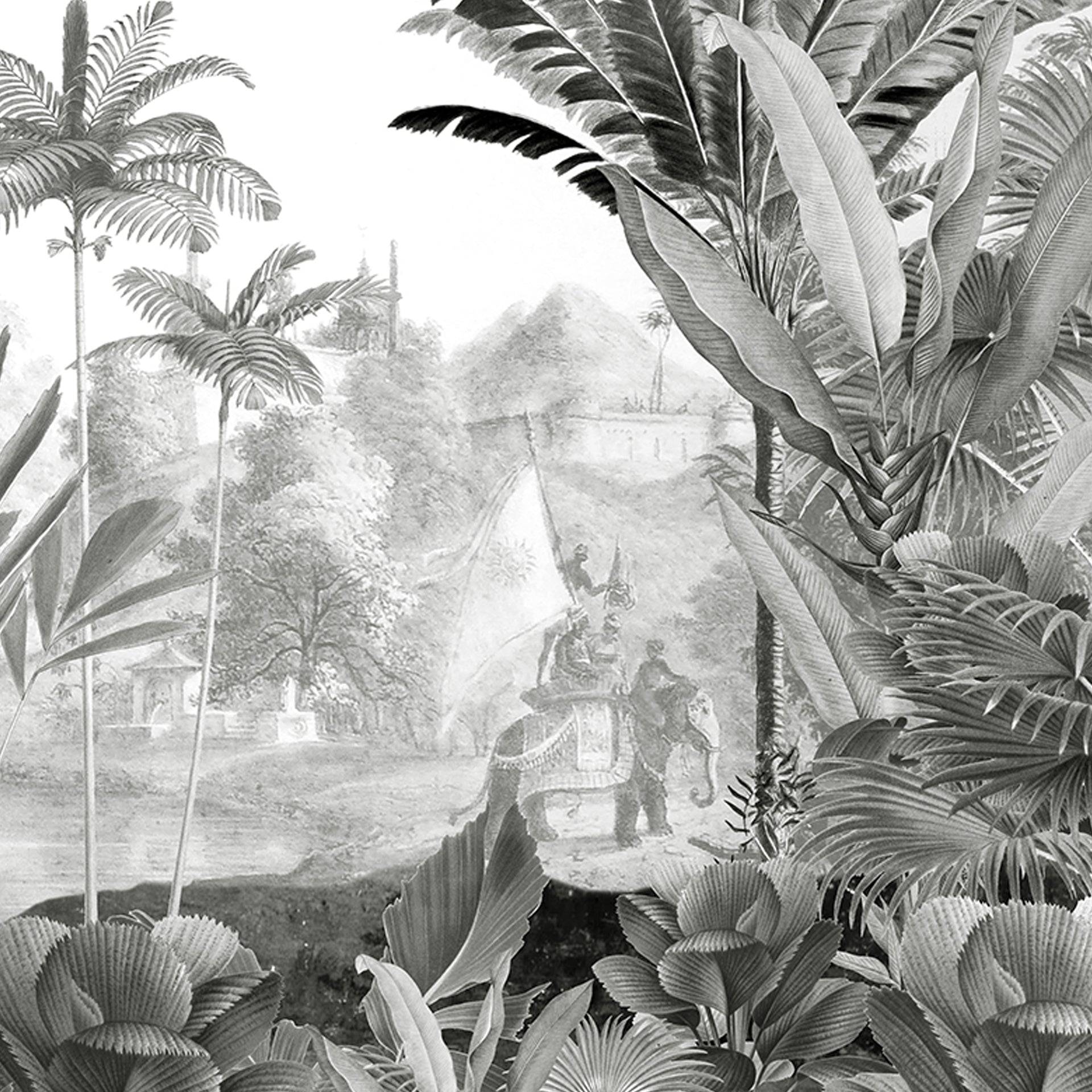 Black and white Kerala tropical jungle wallpaper with leopards, elephants, birds in lush foliage. This tropical wallpaper is manufactured using carbon neutral practices and is easy to install.