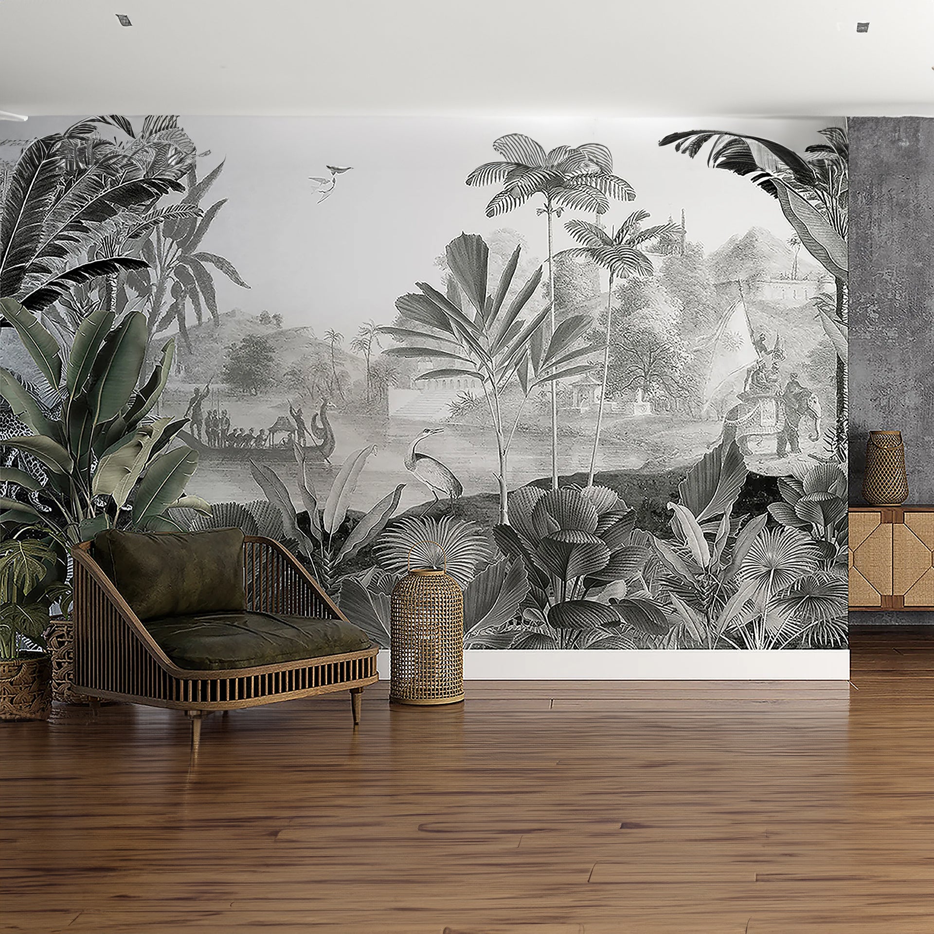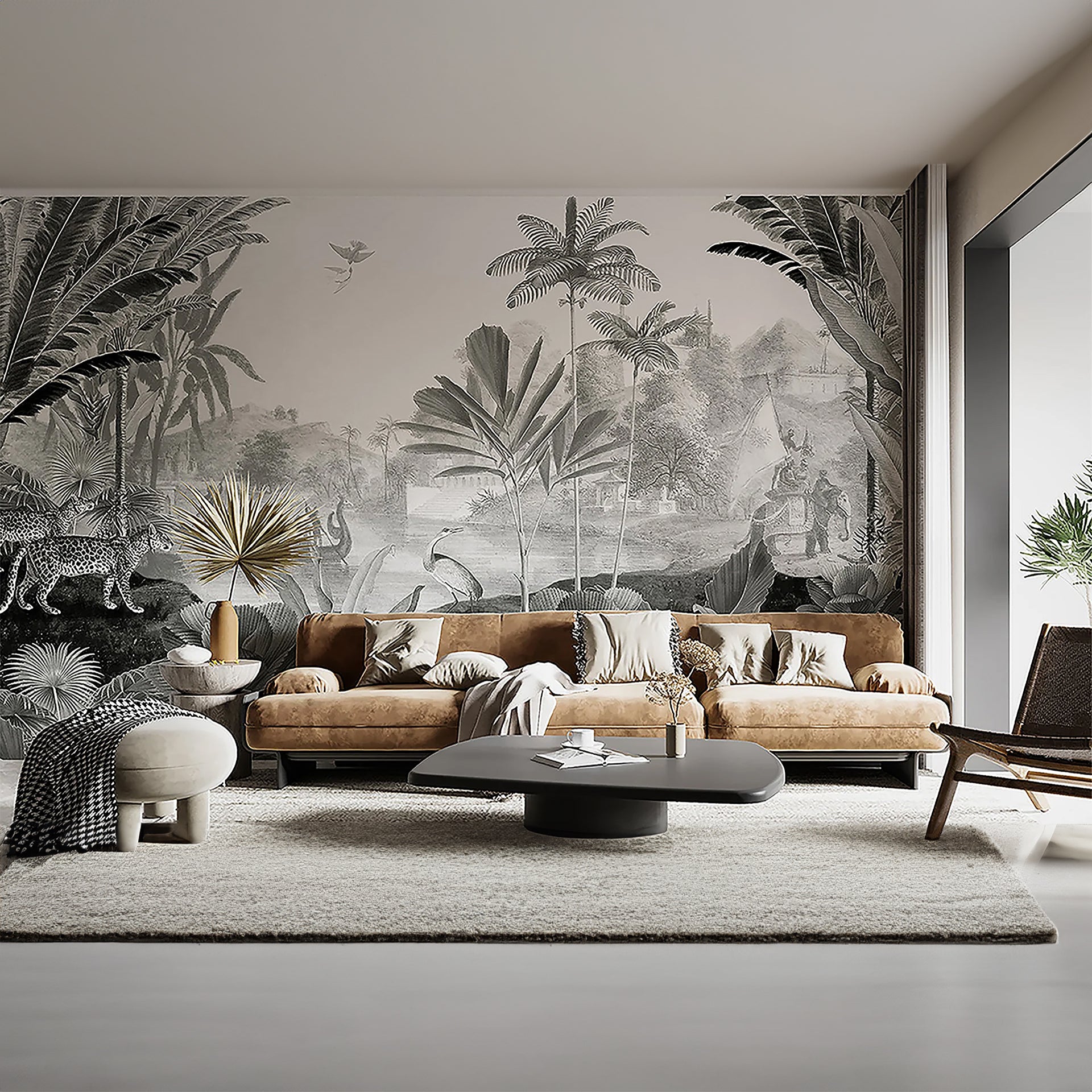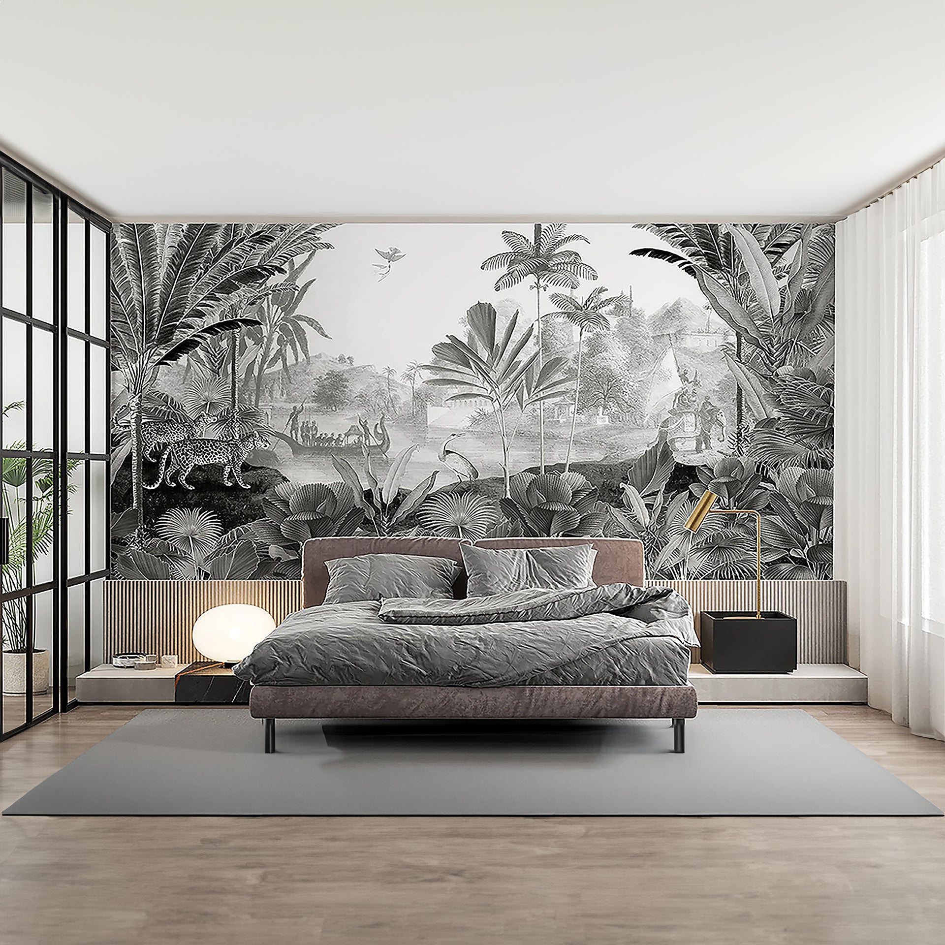 Black and white Kerala tropical jungle wallpaper with leopards, elephants, birds in lush foliage. This tropical wallpaper is manufactured using carbon neutral practices and is easy to install.