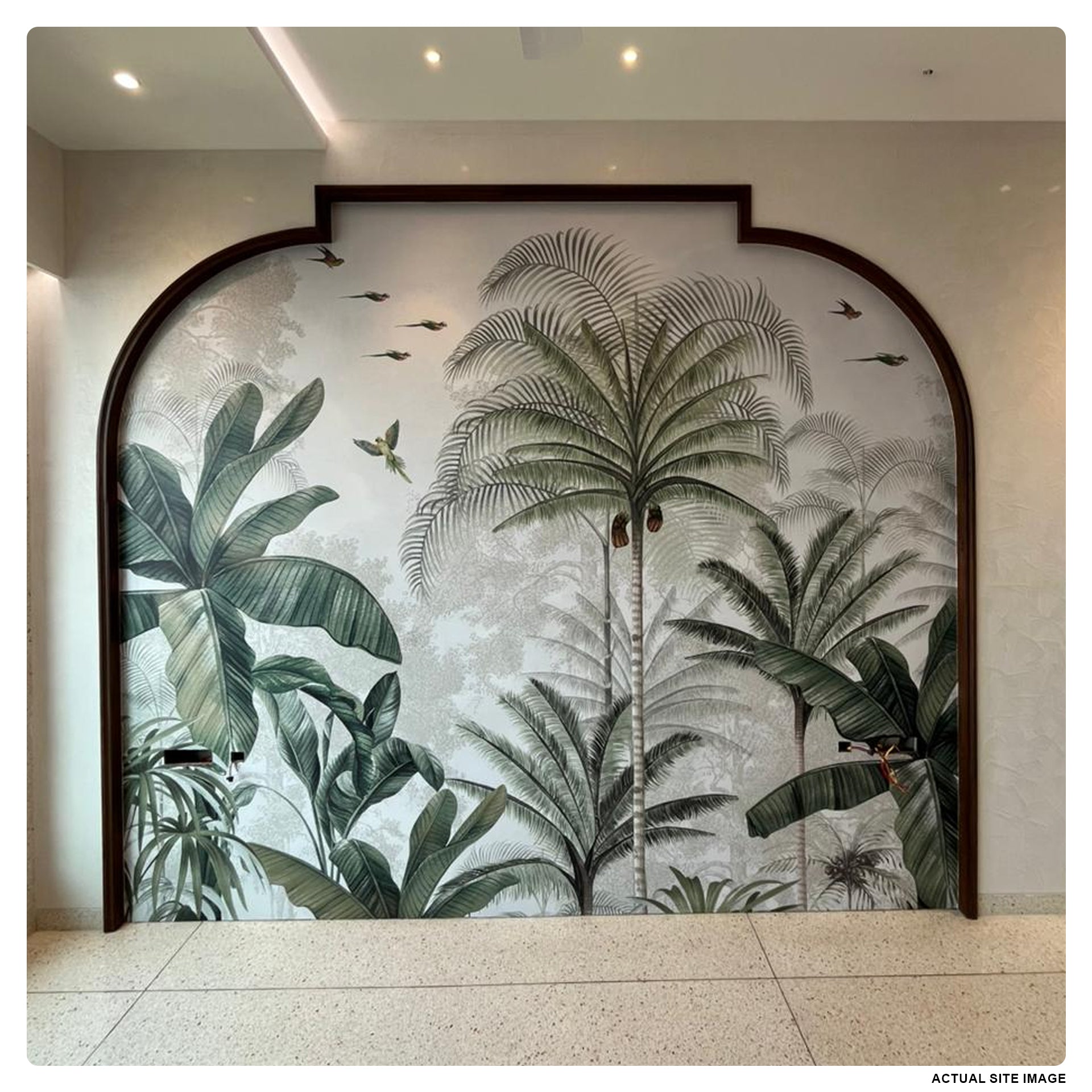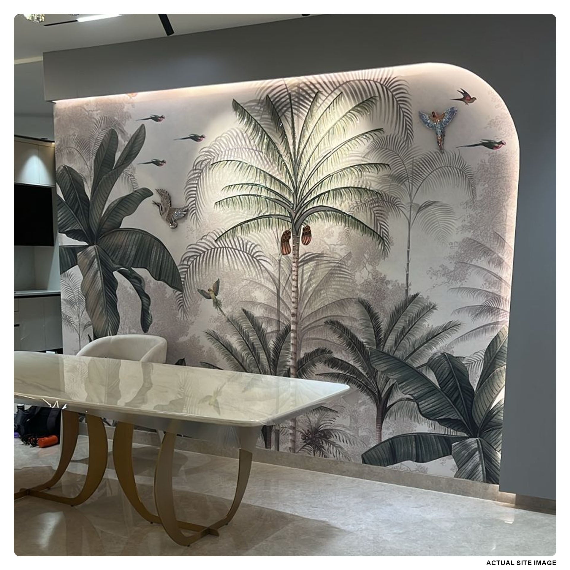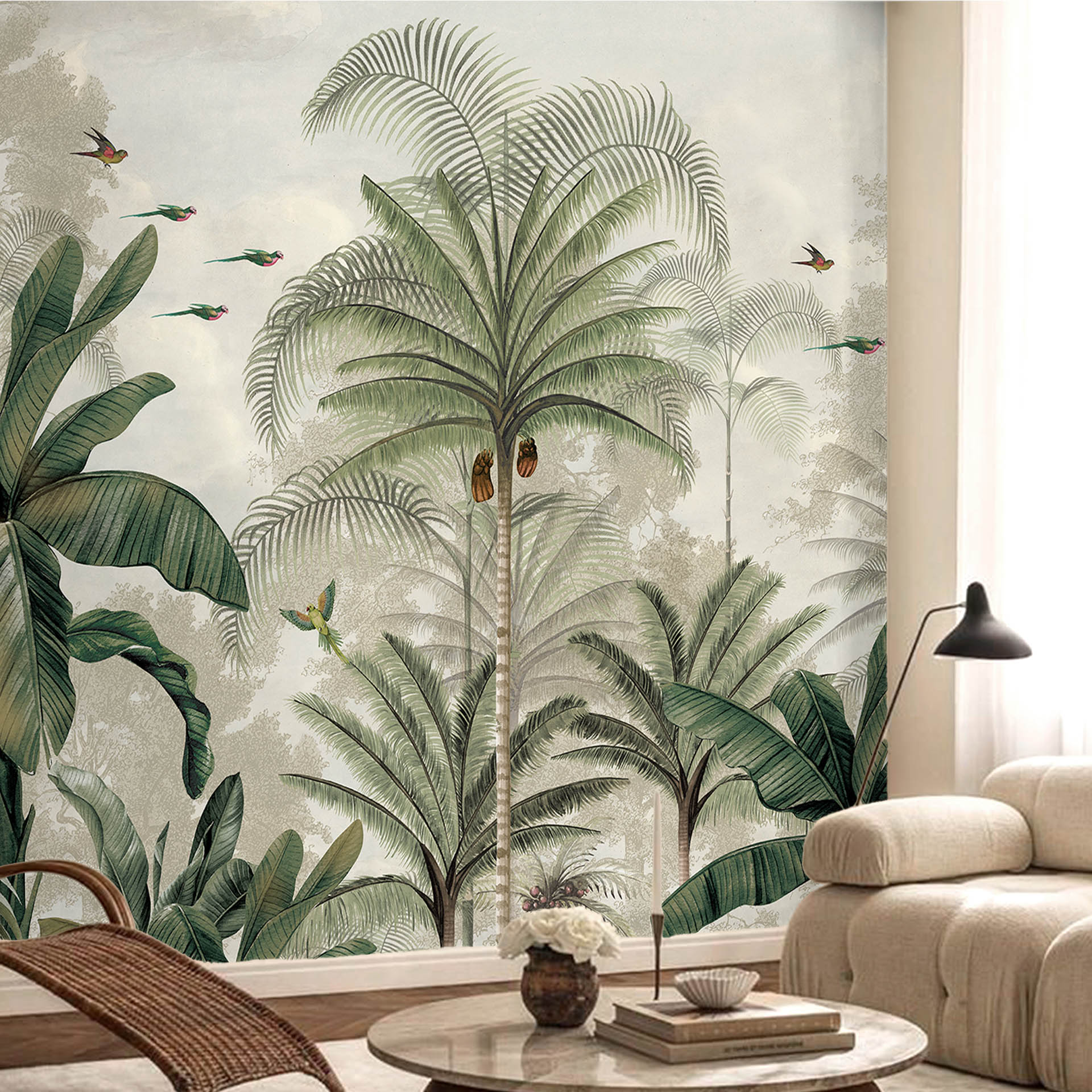 Our Modern Tropical Forest Wallpaper with Flying Birds Motifs is designed to bring a refreshing blend of lush foliage and serene avian beauty into your home. Perfect for living rooms, bedrooms, and high ceiling entry areas, this wallpaper adds a vibrant yet calming vibe to any interior.
