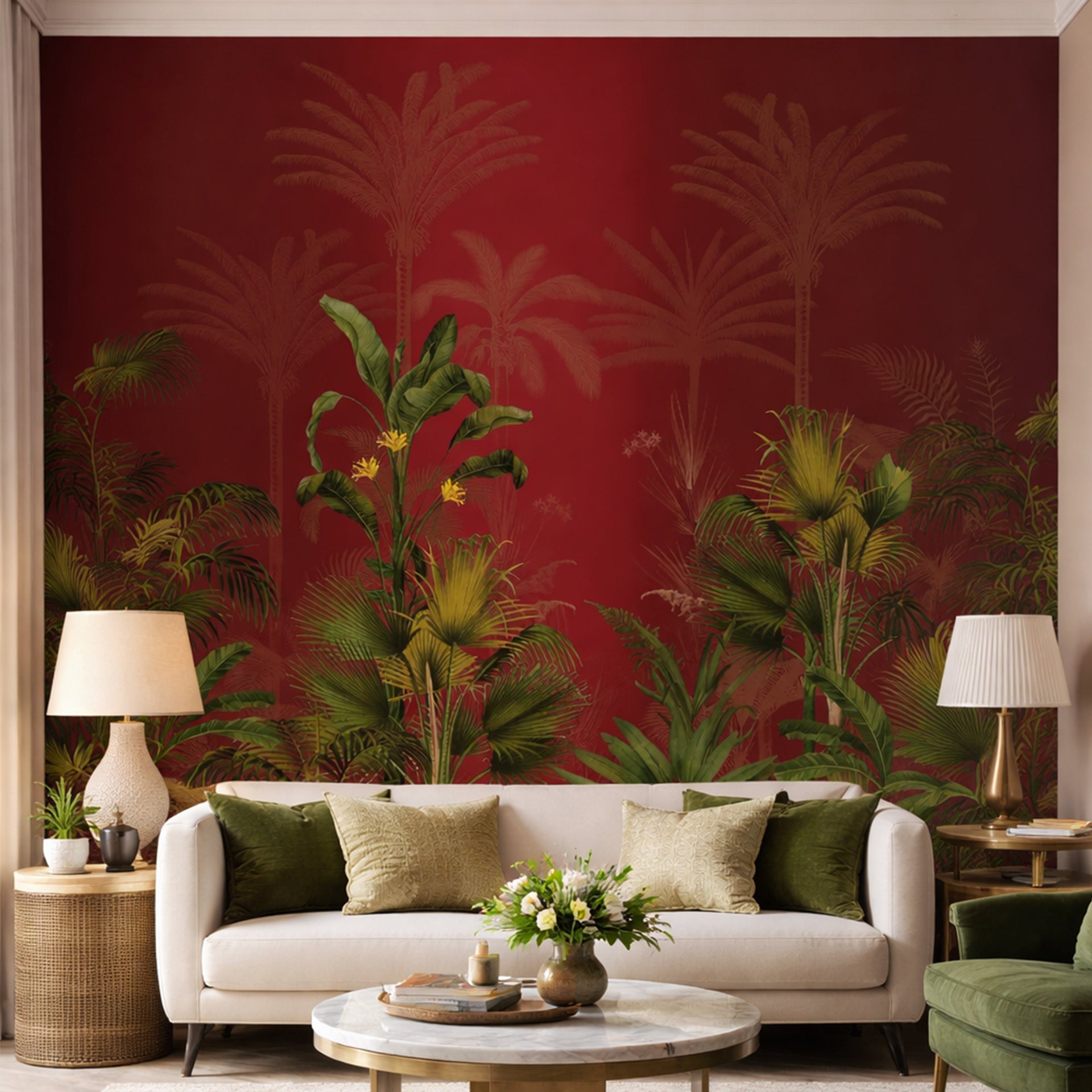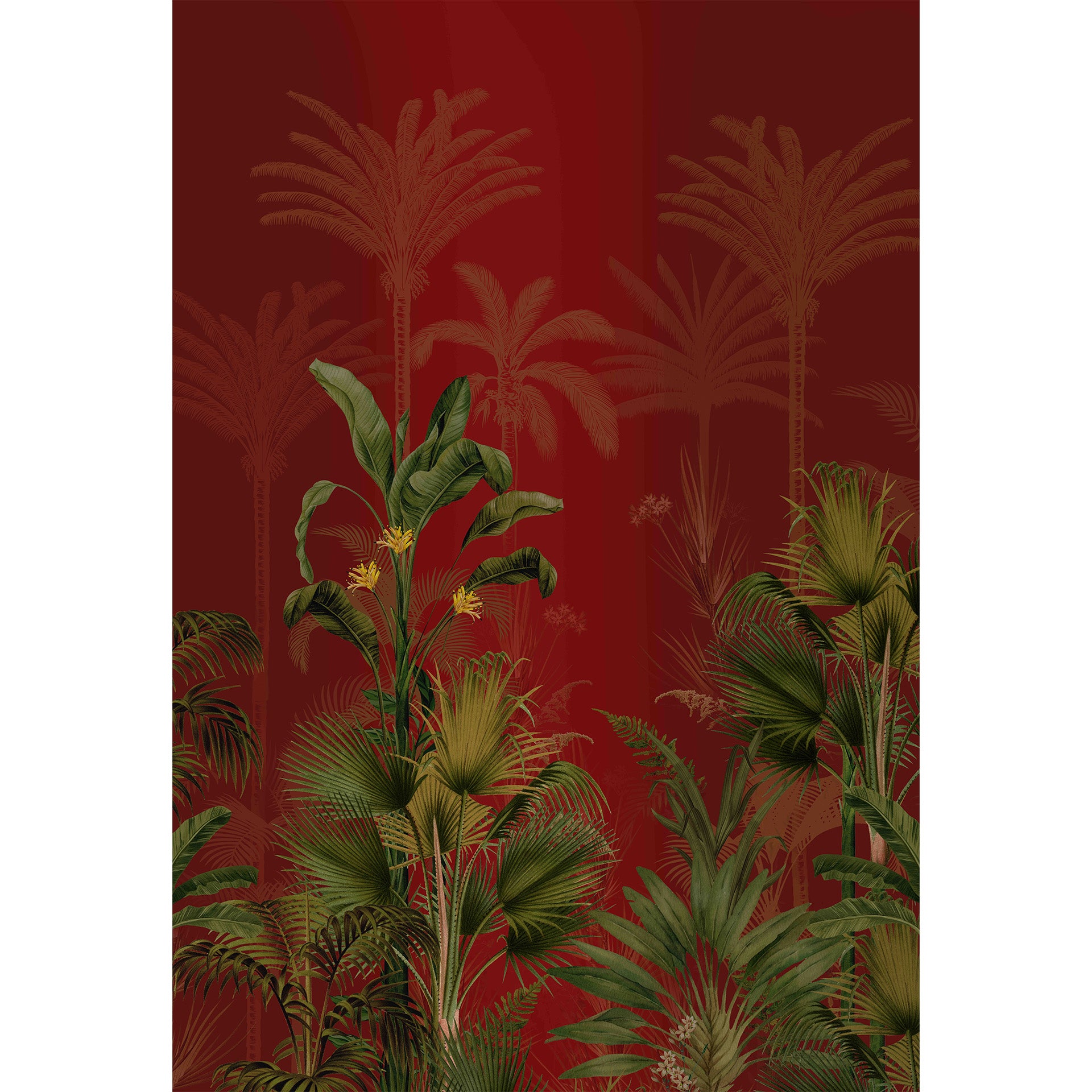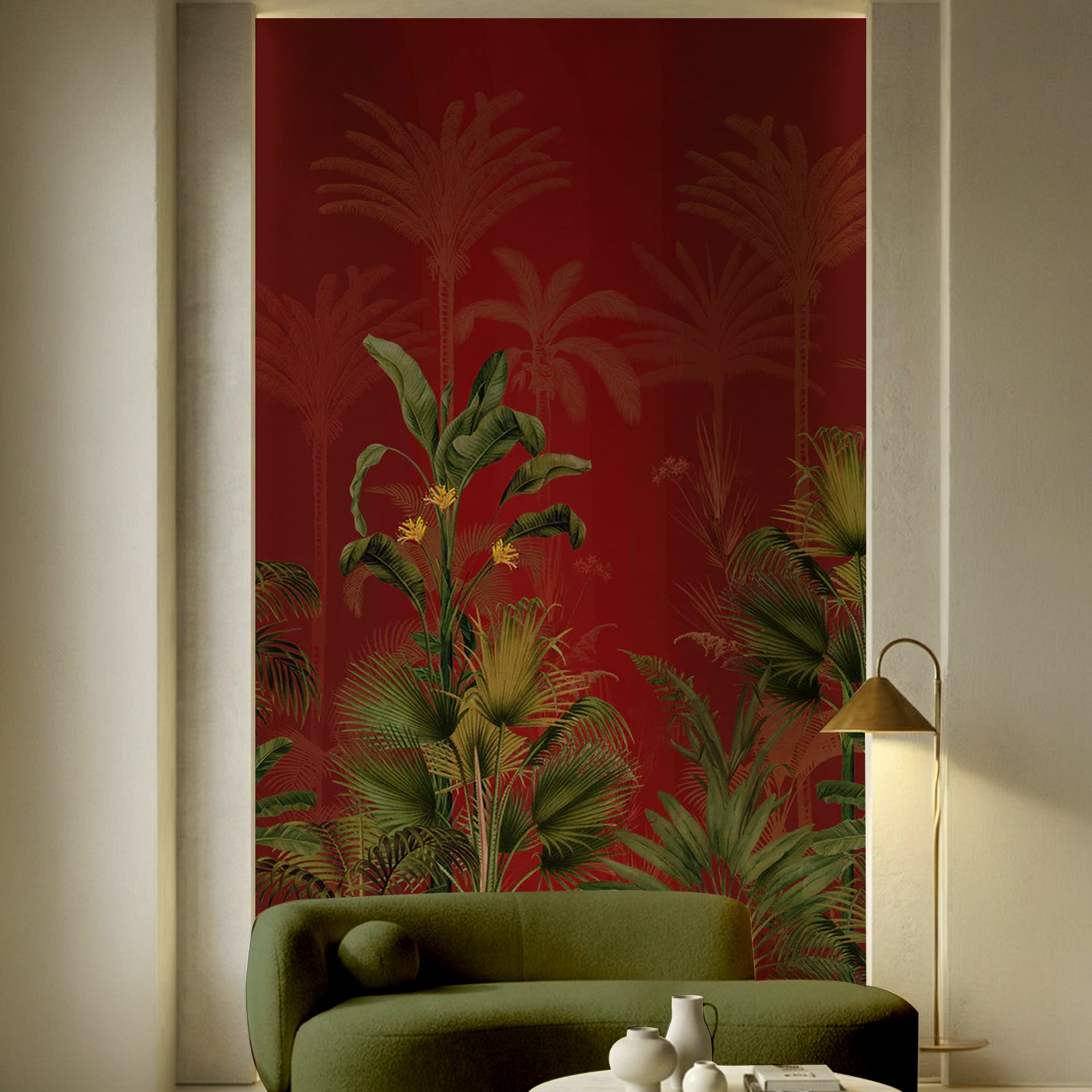 Crimson Canopy: Tropical Palm Jungle Wallpaper With Green Foliage On Deep Red Background