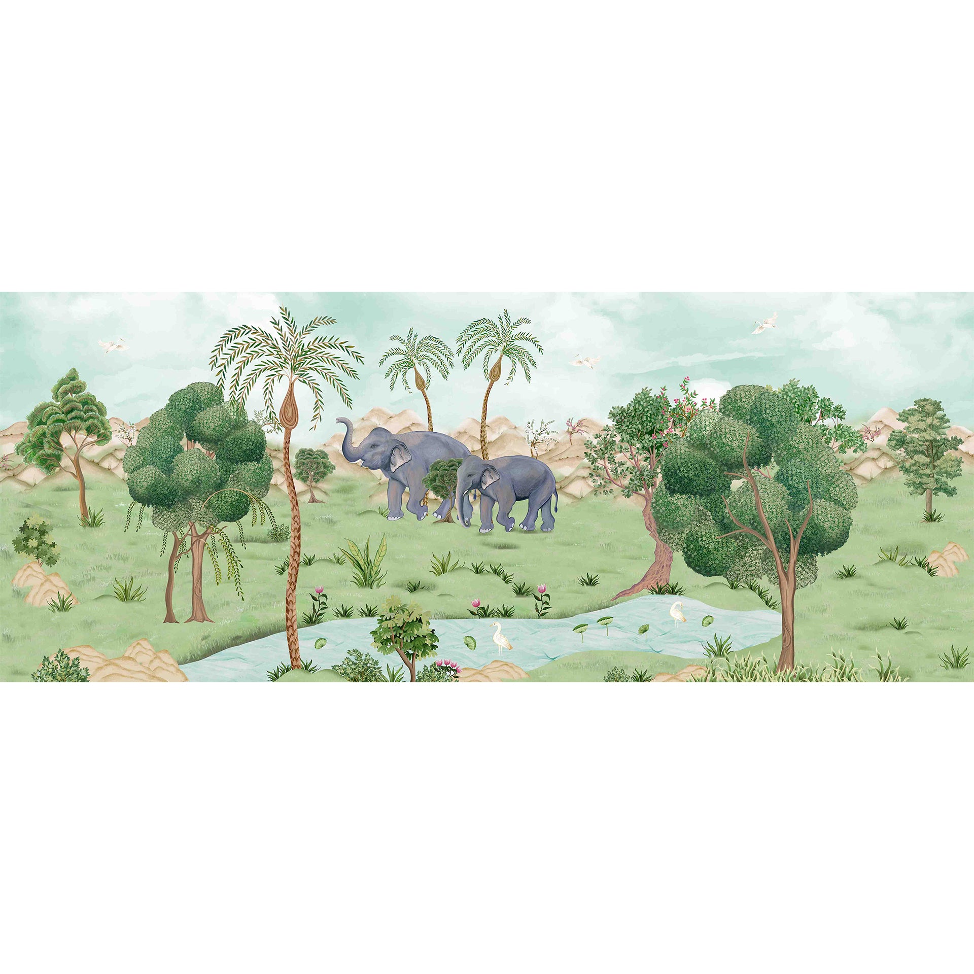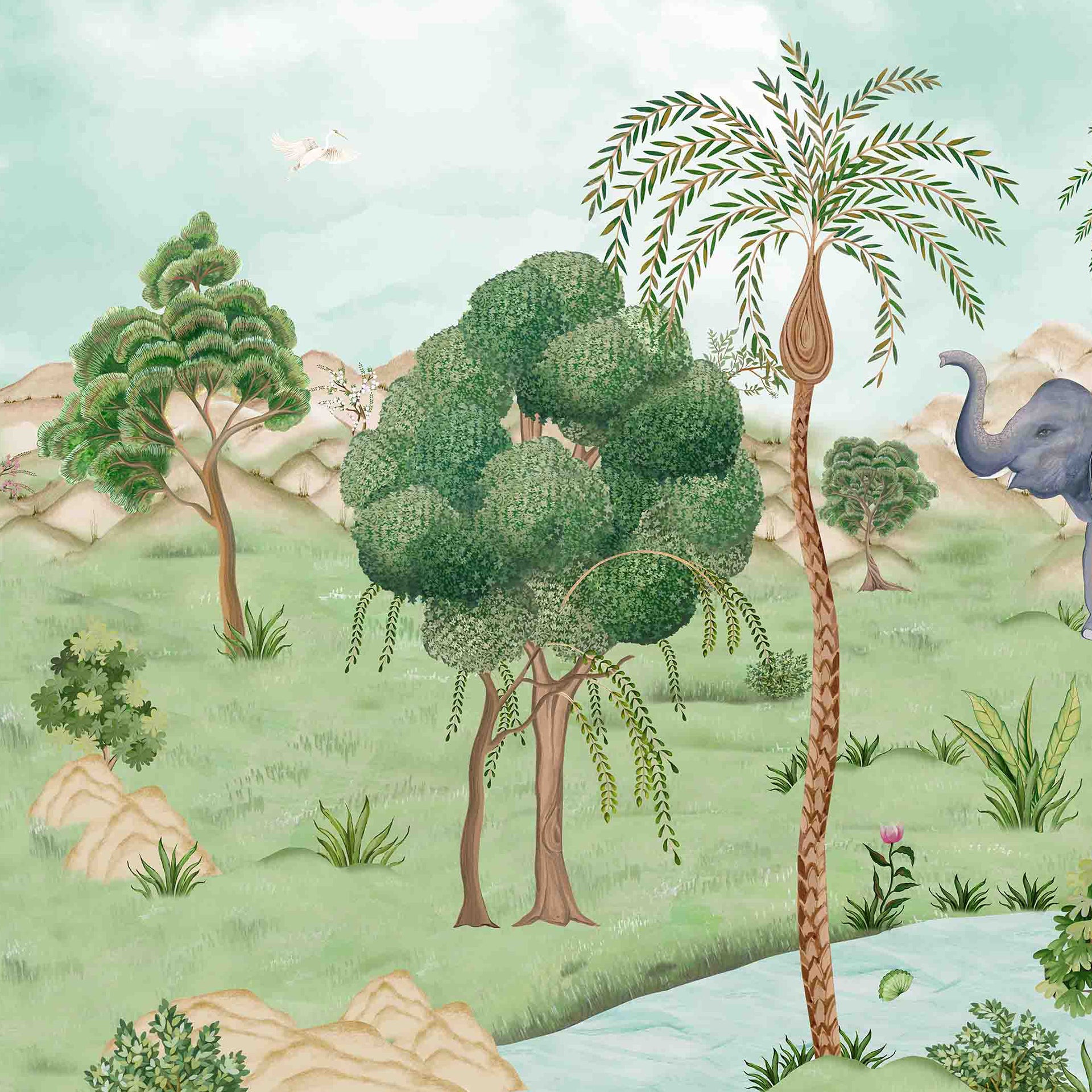 Beautifully illustrated jungle landscape featuring majestic wildlife, including leopards and antelopes, surrounded by verdant trees and a serene sky with white clouds.