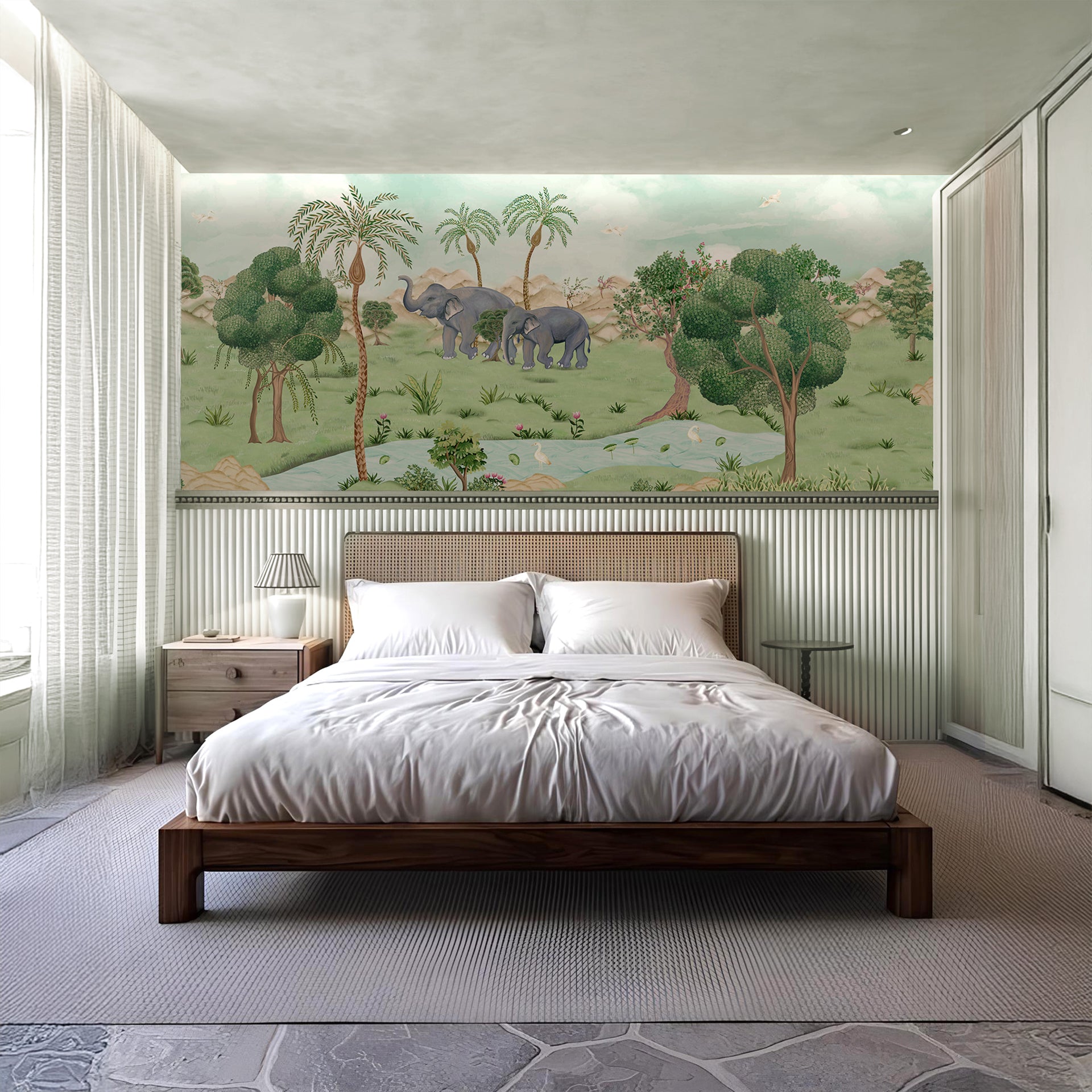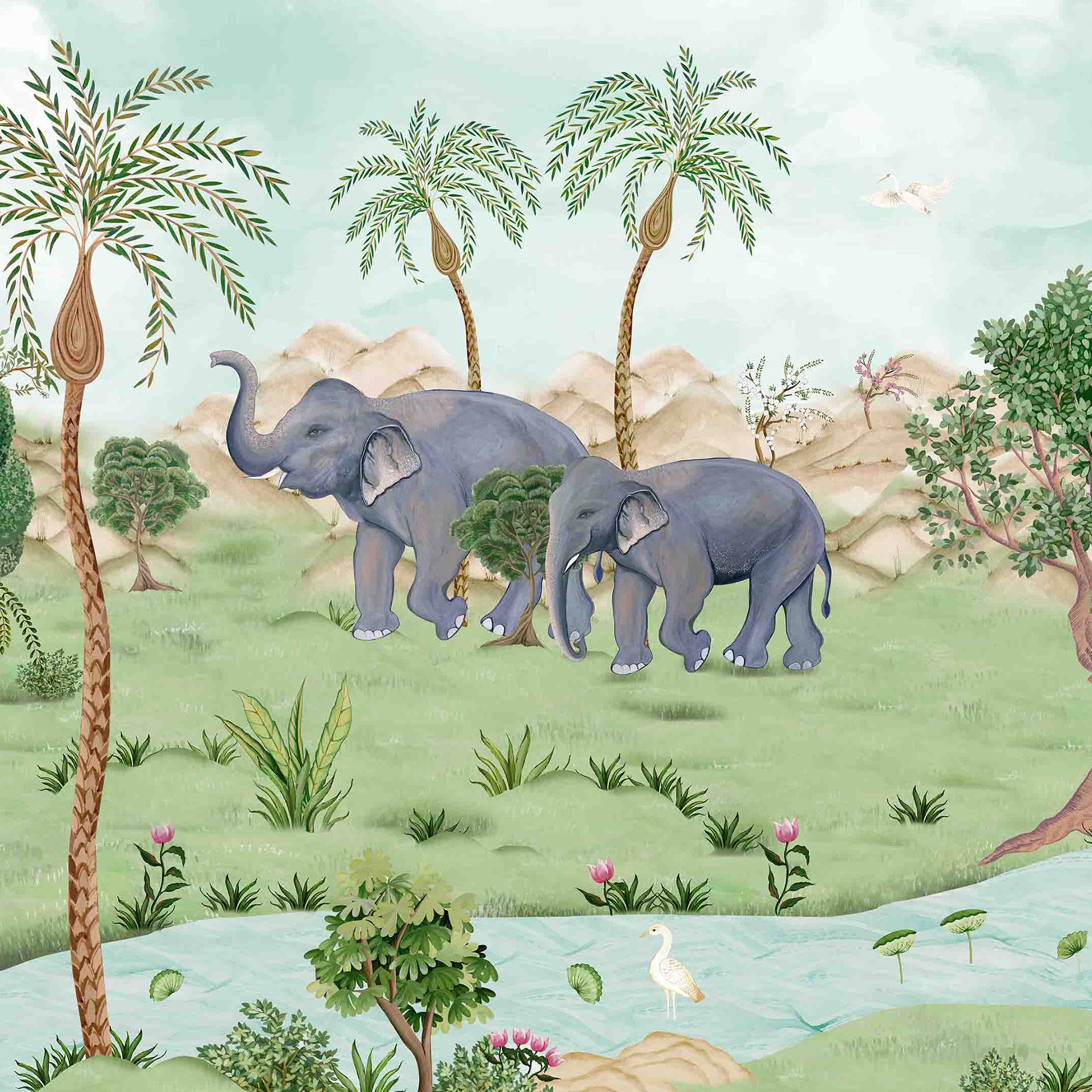 Elegant Tuskers: Elegant Watercolor Scene with Elephants in Lush Tropical Landscape Near a Stream