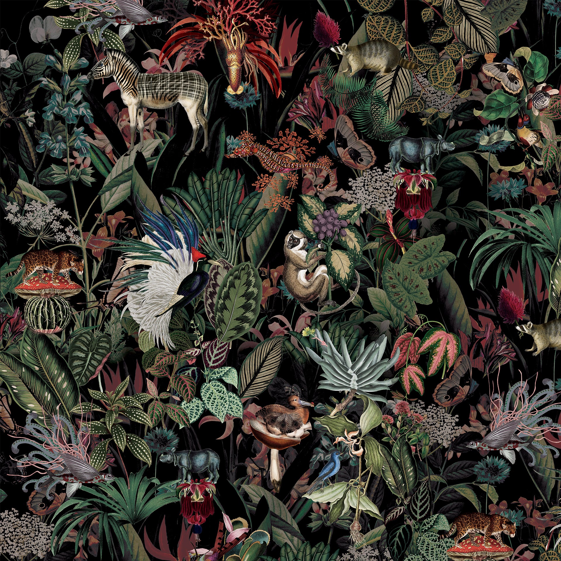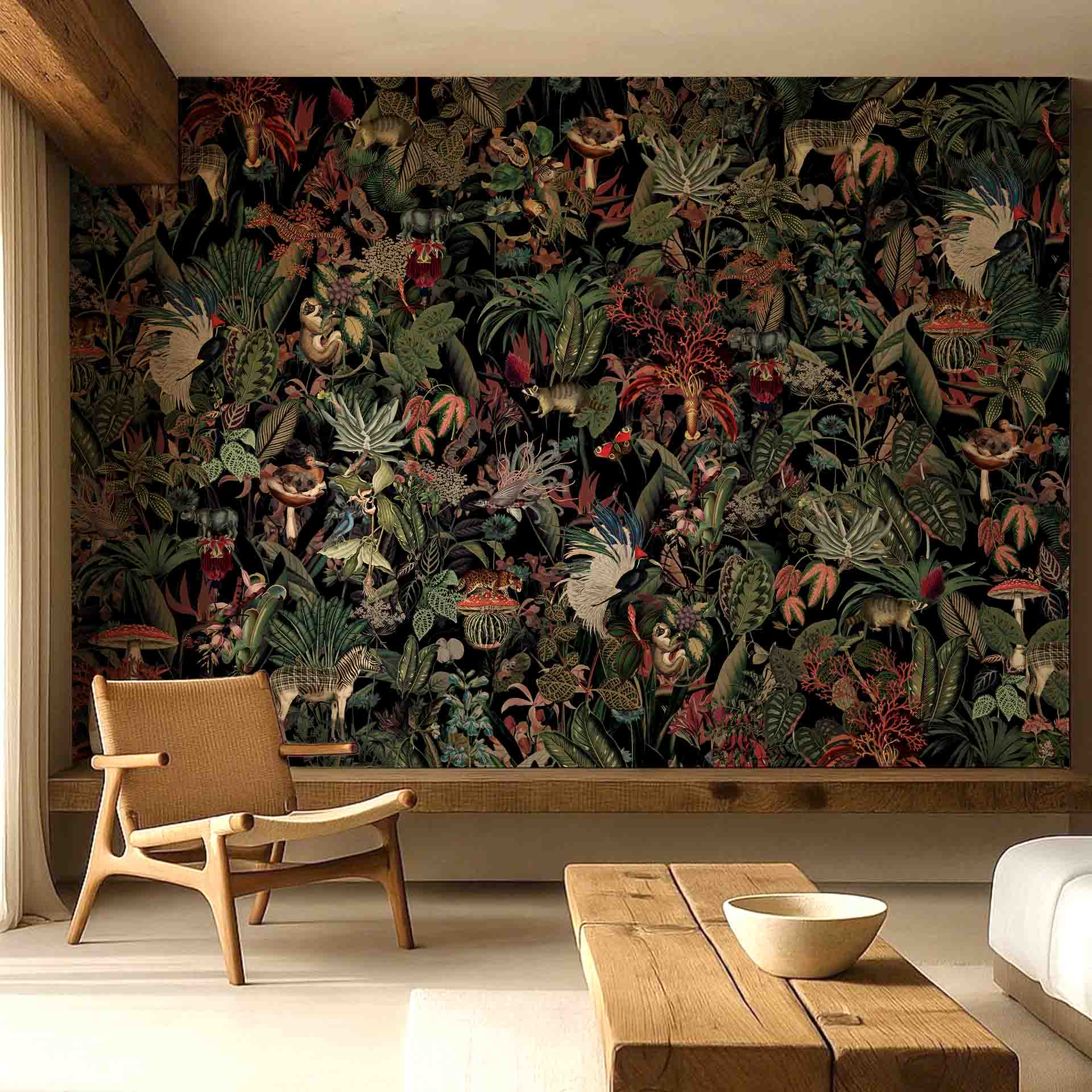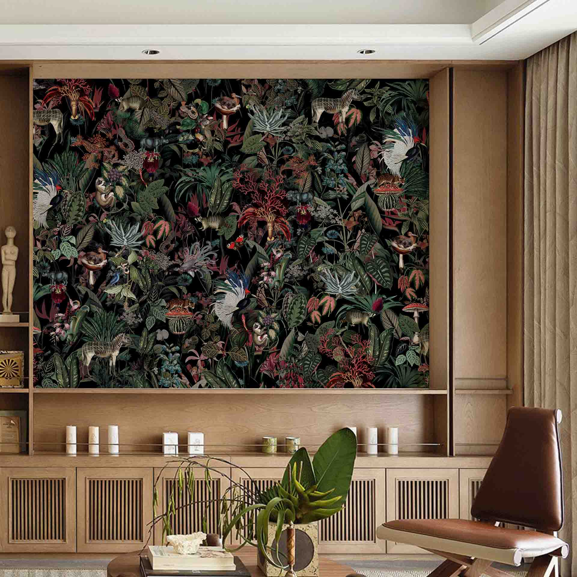 Midnight Jungle Wallpaper, a bold dark tropical wallpaper for party clubs and statement spaces with rich tropical motifs and lush foliage, it creates a dramatic ambiance perfect for showrooms, ceiling entry areas, or even edgy offices.