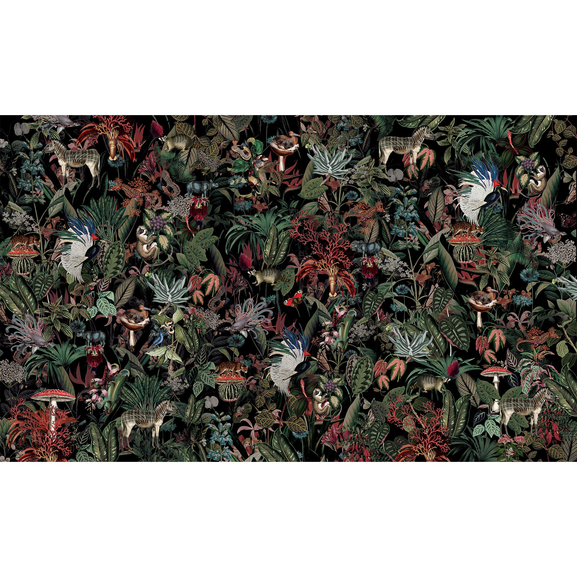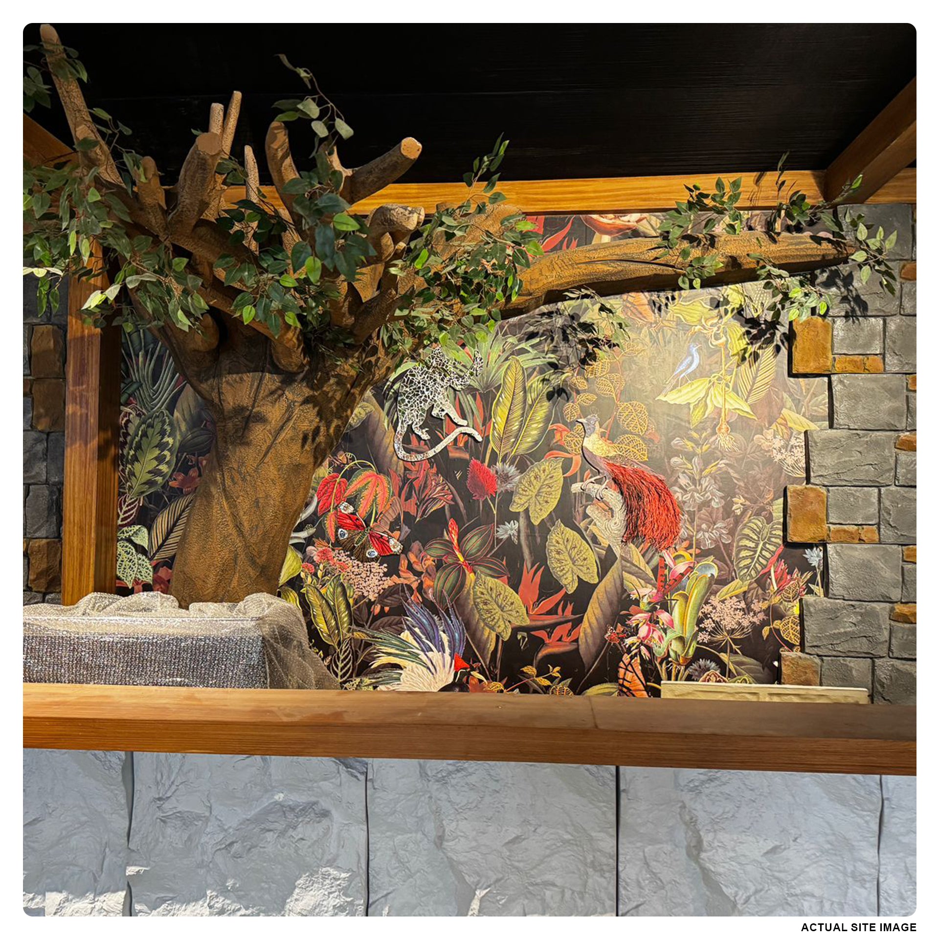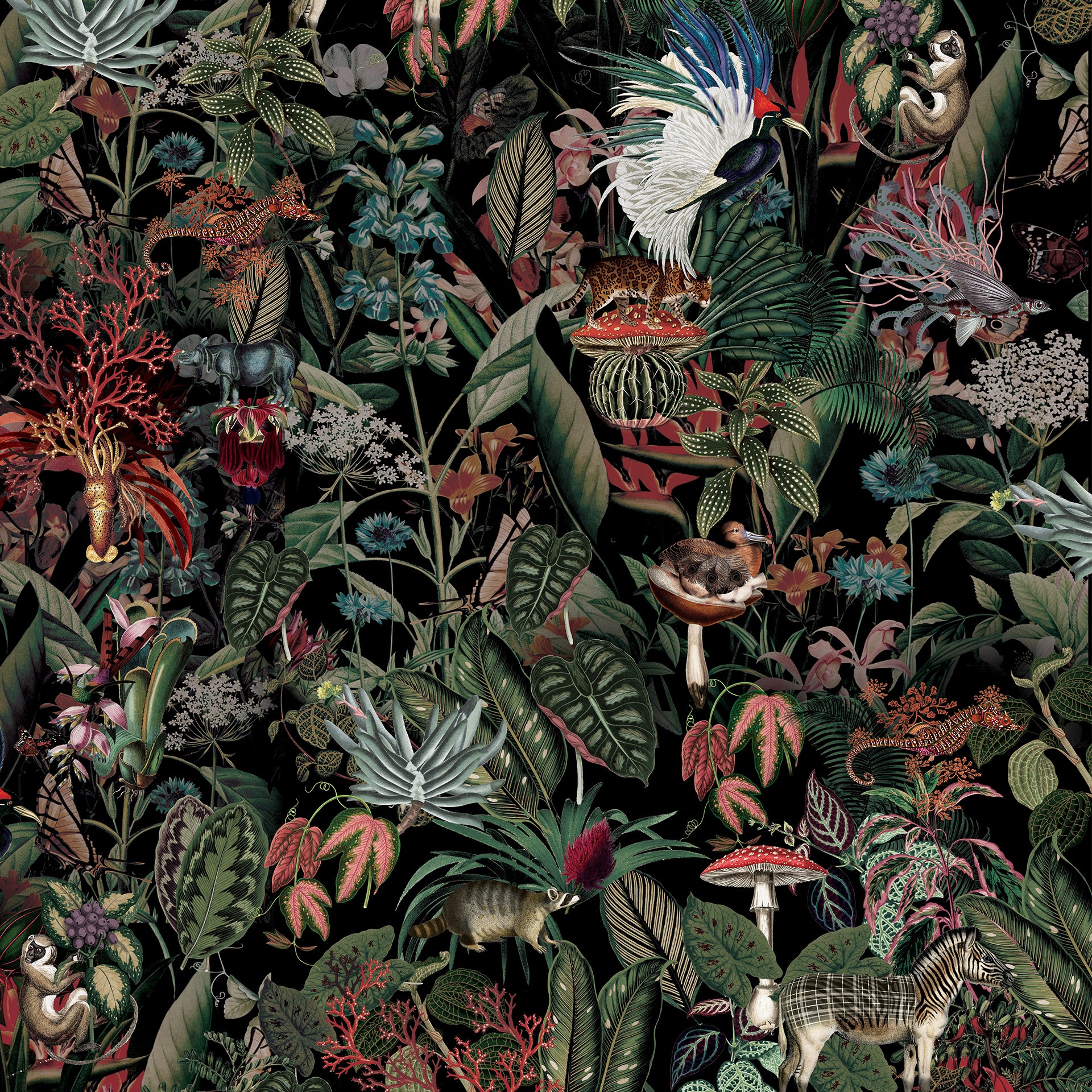Midnight Jungle Wallpaper, a bold dark tropical wallpaper for party clubs and statement spaces with rich tropical motifs and lush foliage, it creates a dramatic ambiance perfect for showrooms, ceiling entry areas, or even edgy offices.