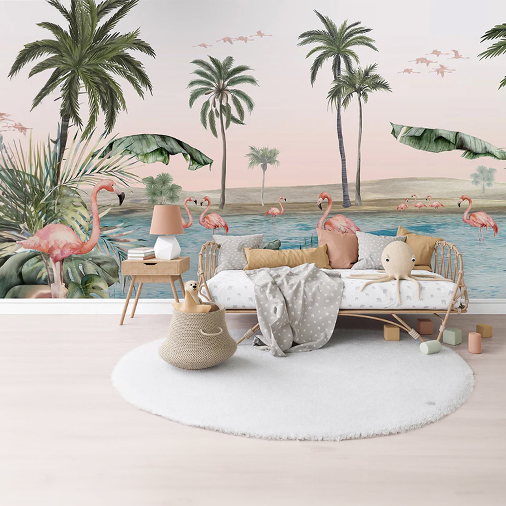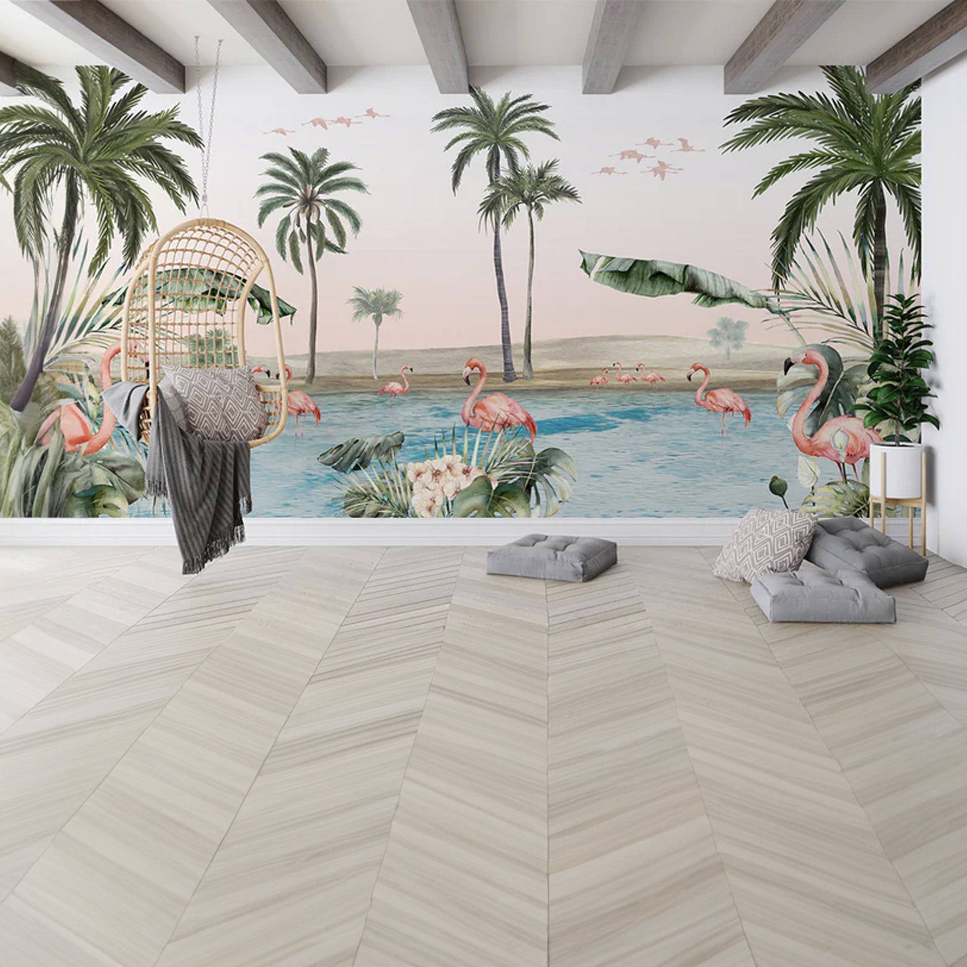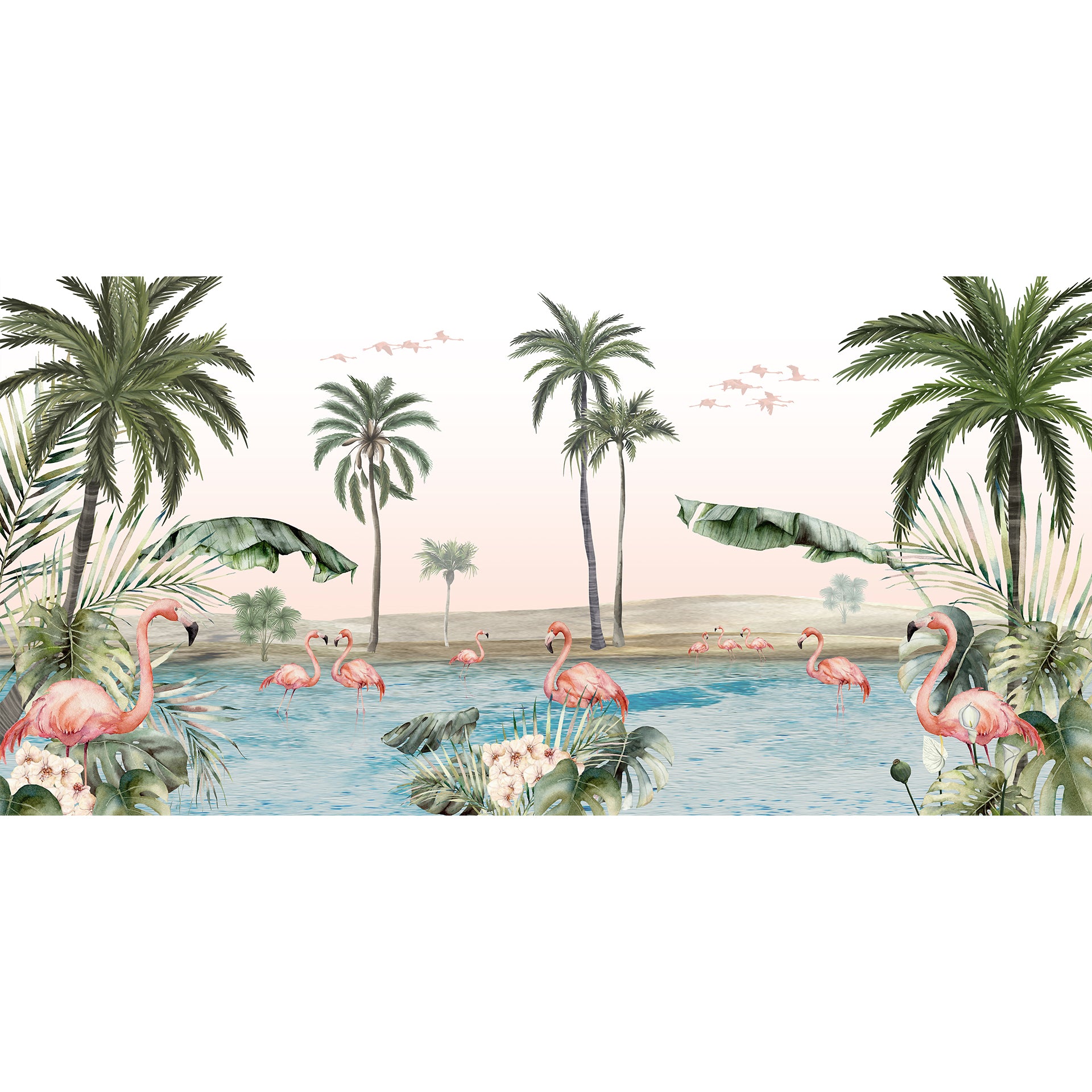 Bright tropical scene featuring pink flamingos wading in a lagoon framed by tall palms. A soft pastel sky and calm waters evoke a relaxing vacation mood and natural paradise.