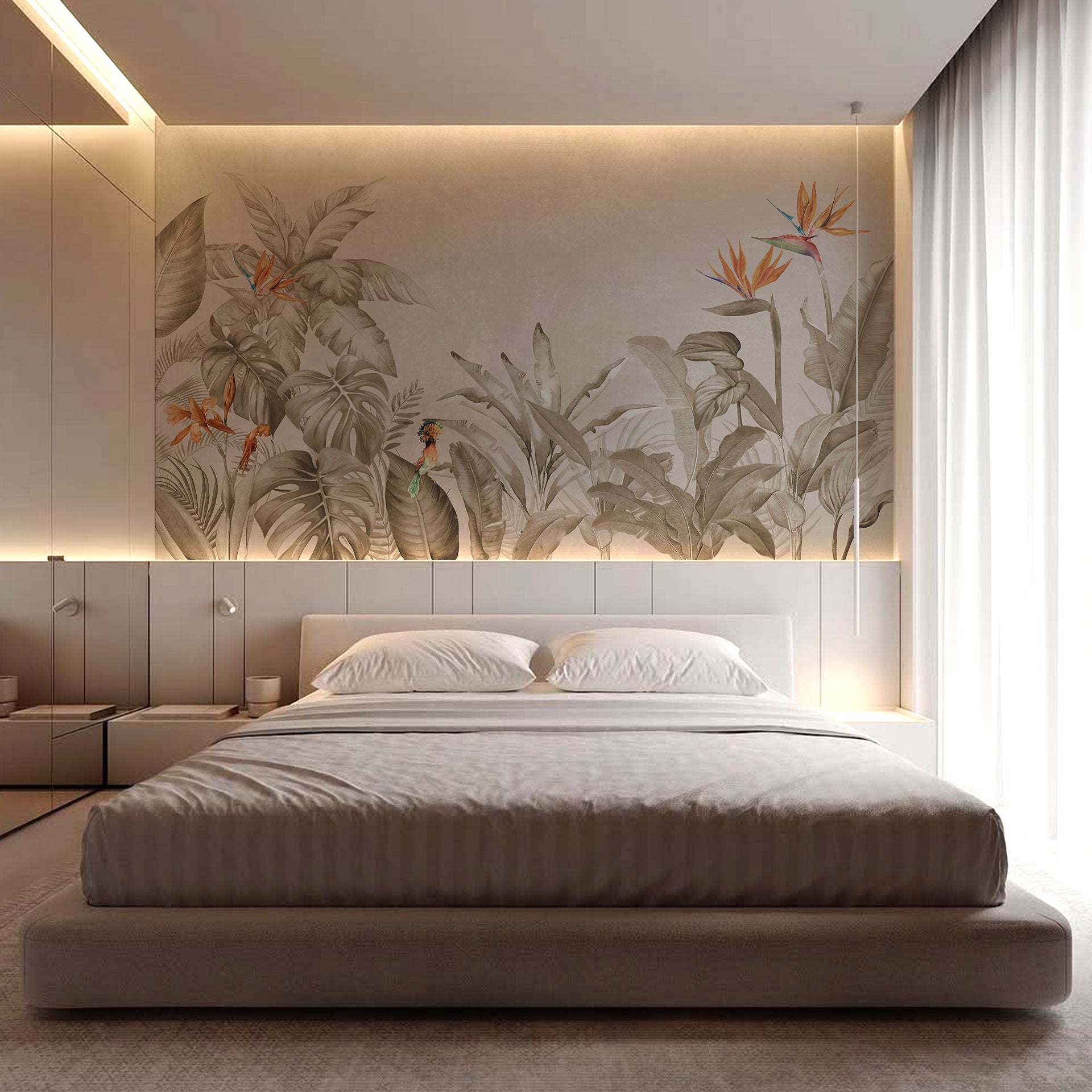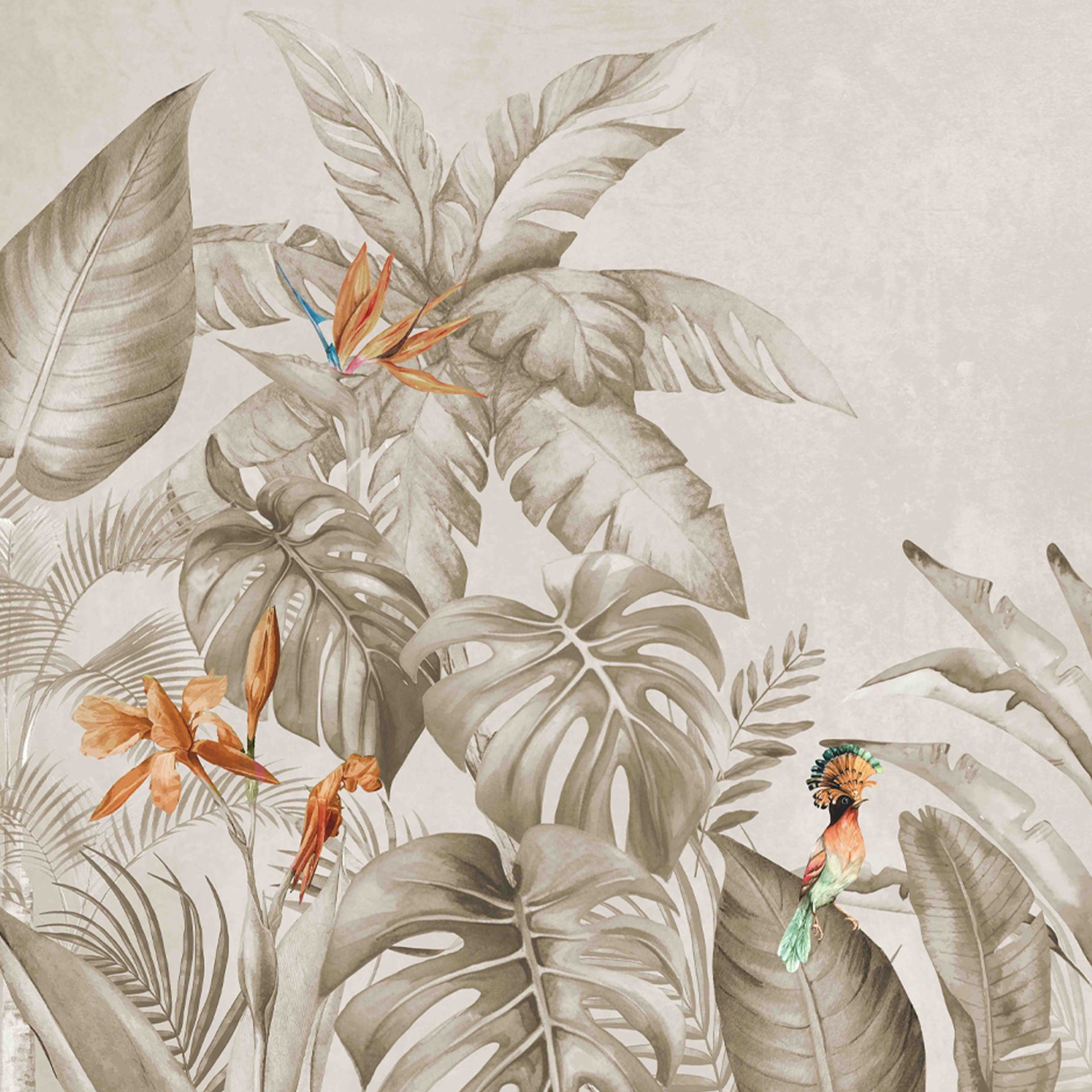 A serene sepia-toned jungle scene featuring lush tropical leaves and vibrant birds of paradise. This botanical artwork evokes calm, nature, and exotic appeal, ideal for wall art and nature decor.
