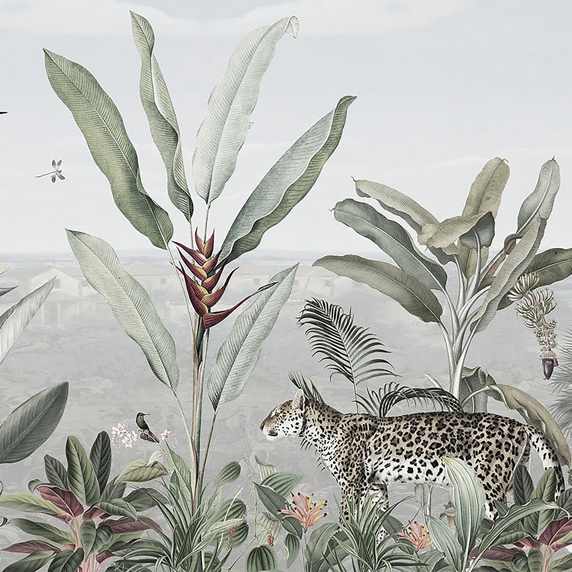 Botanical Beauty Panorama: This Sophisticated Jungle Wallpaper Features Lush Tropical Foliage, Tall Banana And Palm Trees, And A Variety Of Exotic Wildlife.