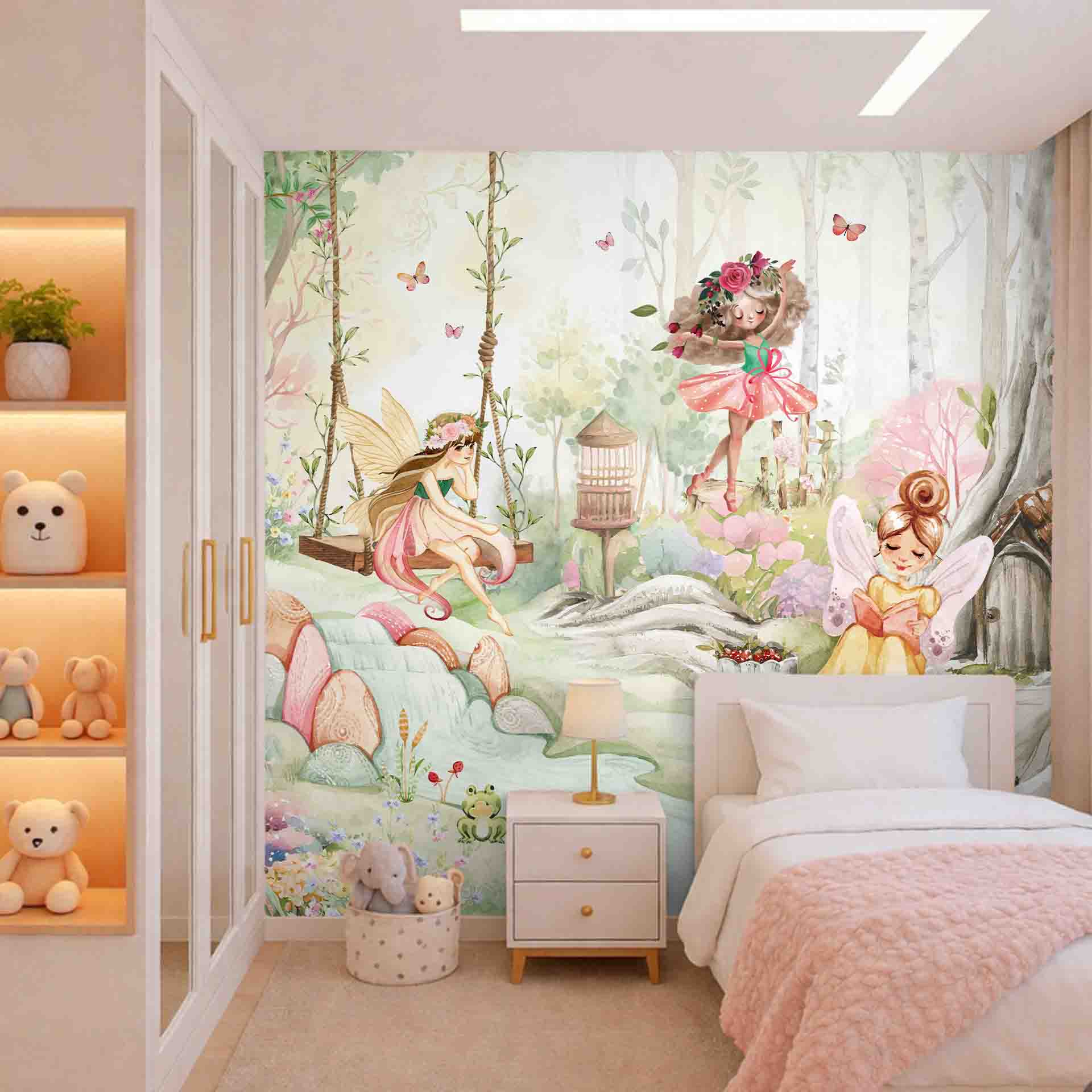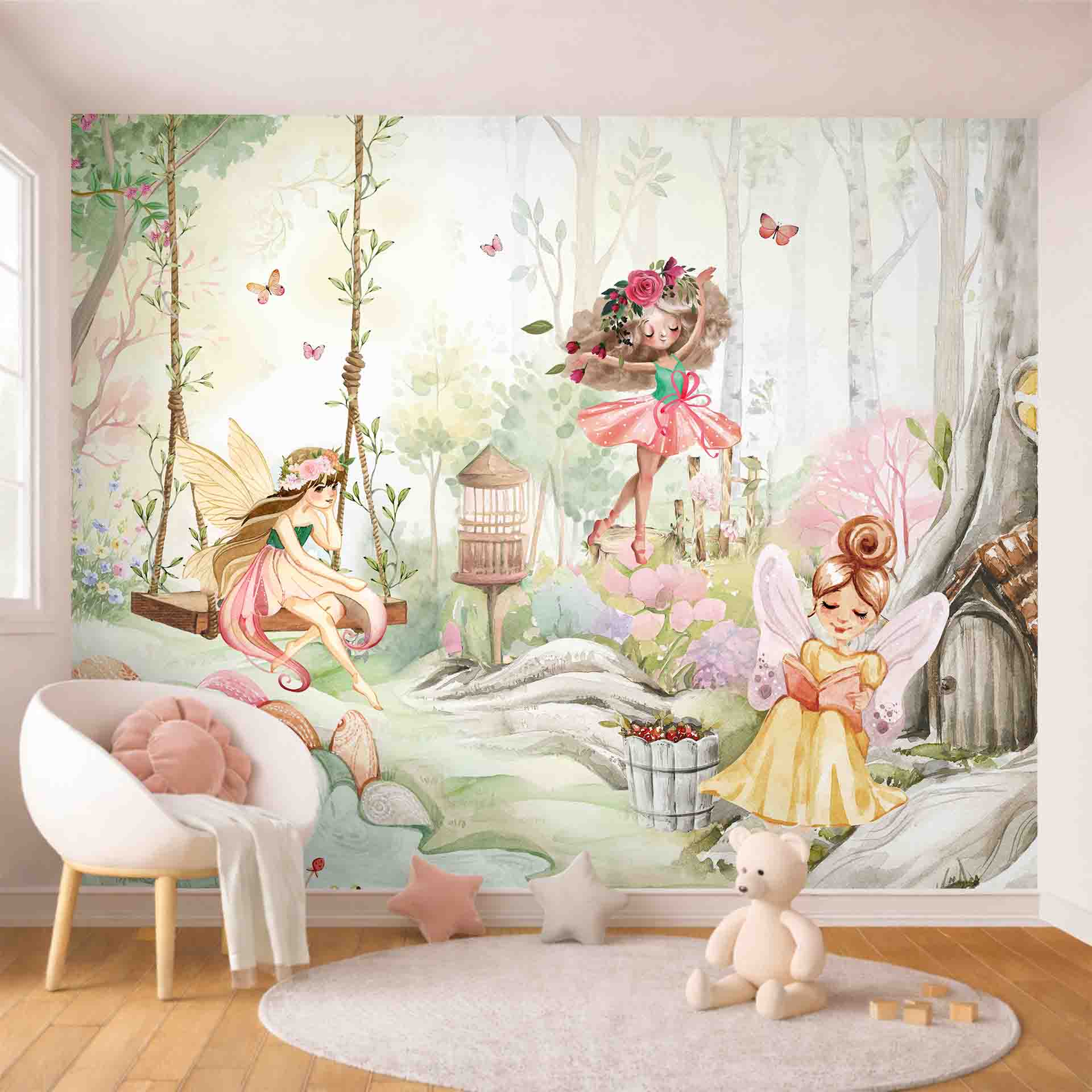 Enchanting watercolor fairy forest with three playful fairies: one on a swing, one dancing like a ballerina and one reading. Soft pastel nature setting with butterflies, flowers, a stream and cozy woodland charm.
