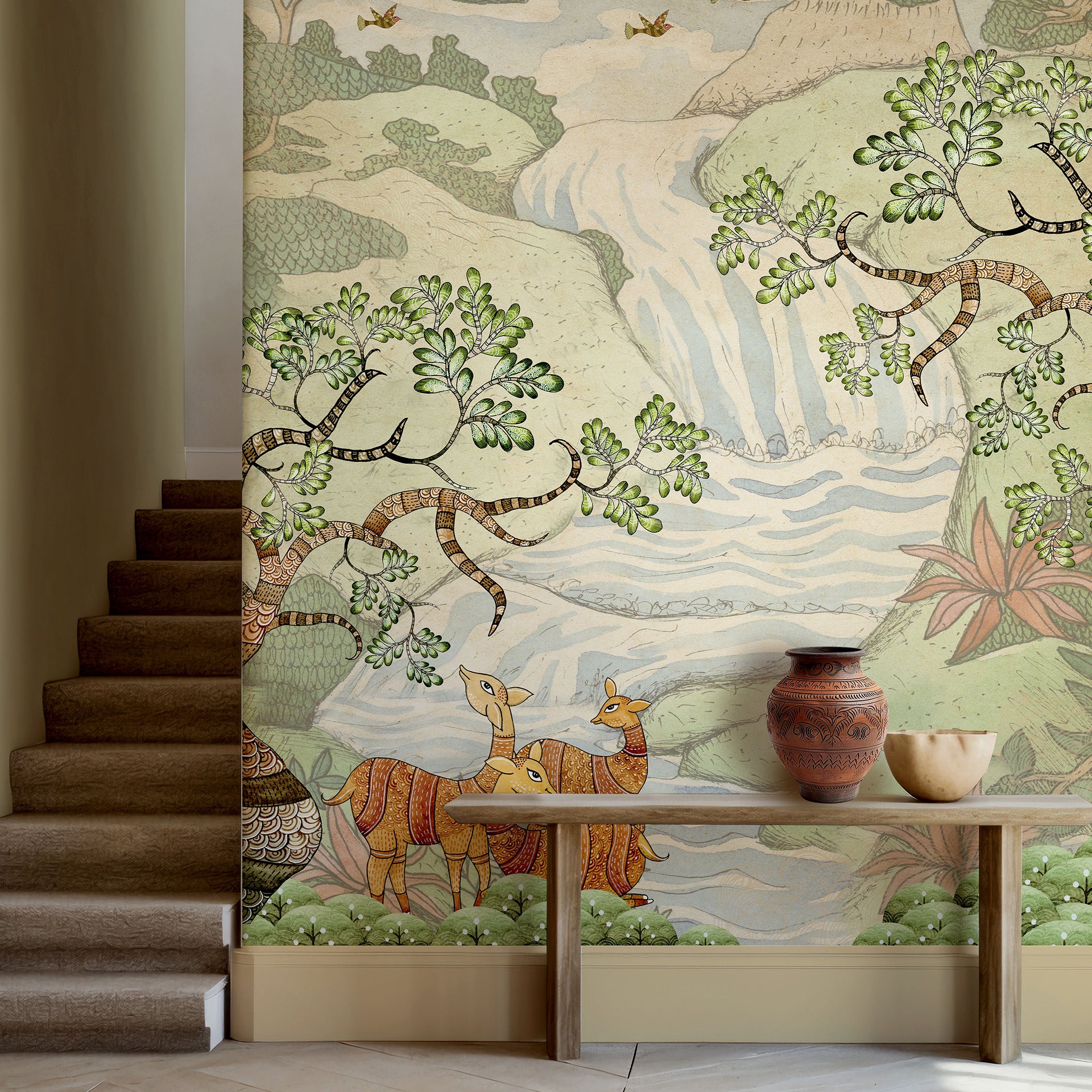 Forest Lullaby: Traditional Indian Artwork Depicting Nature, Animals, And A Serene Landscape