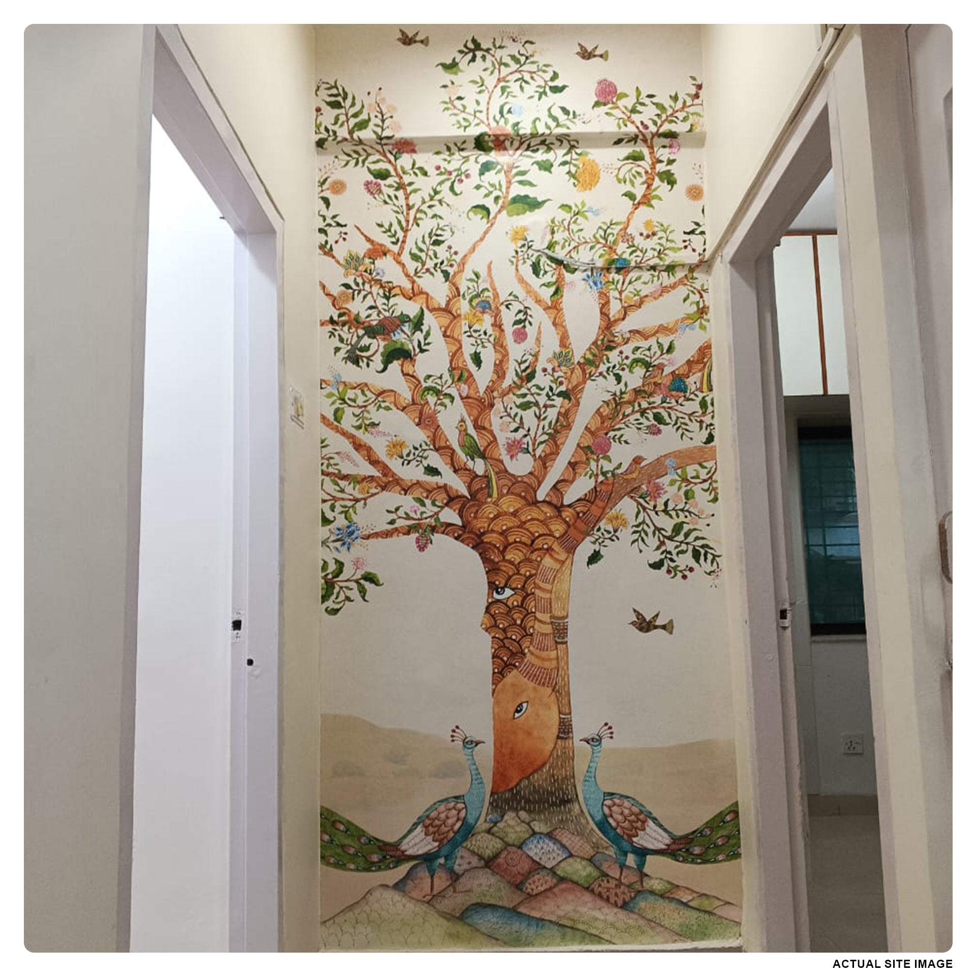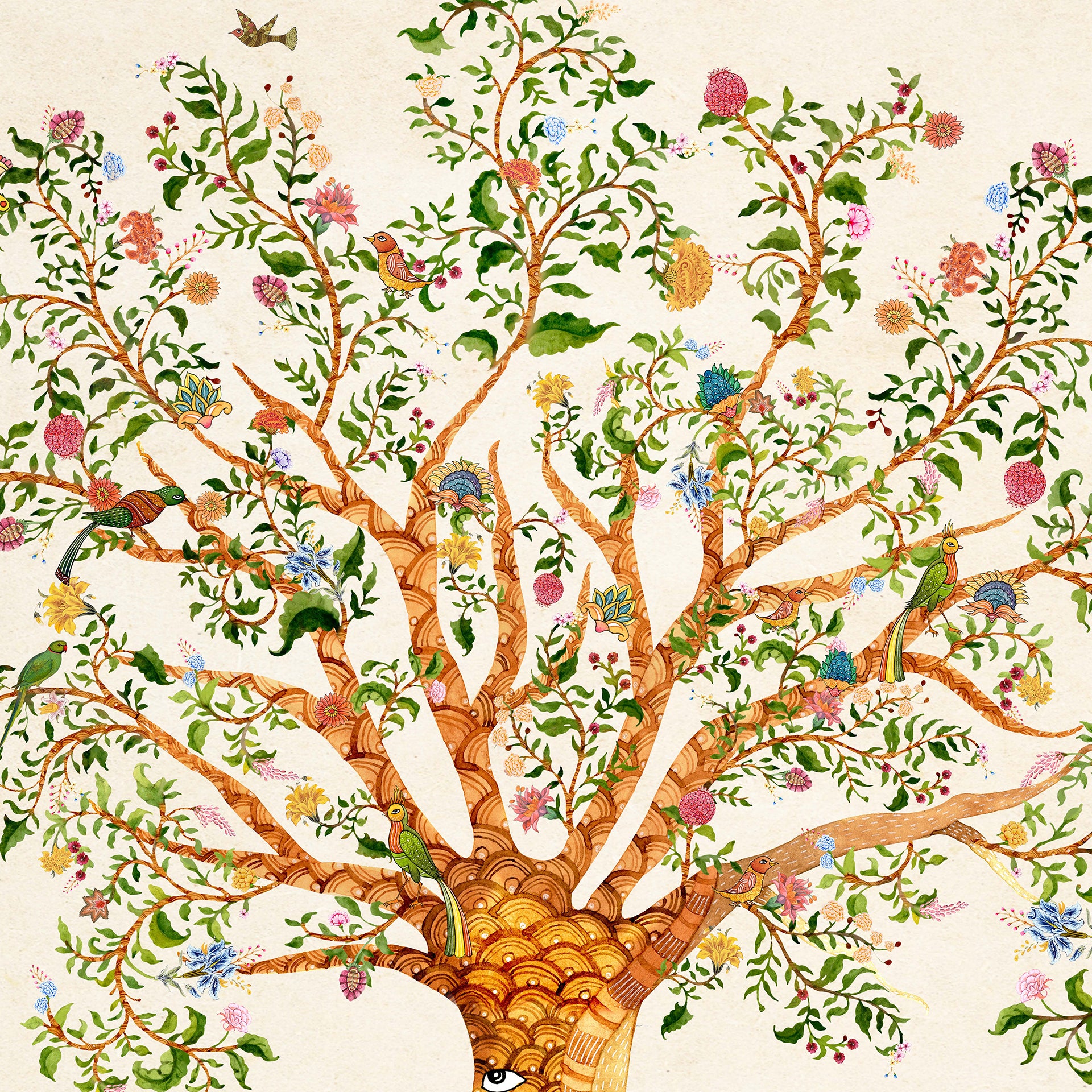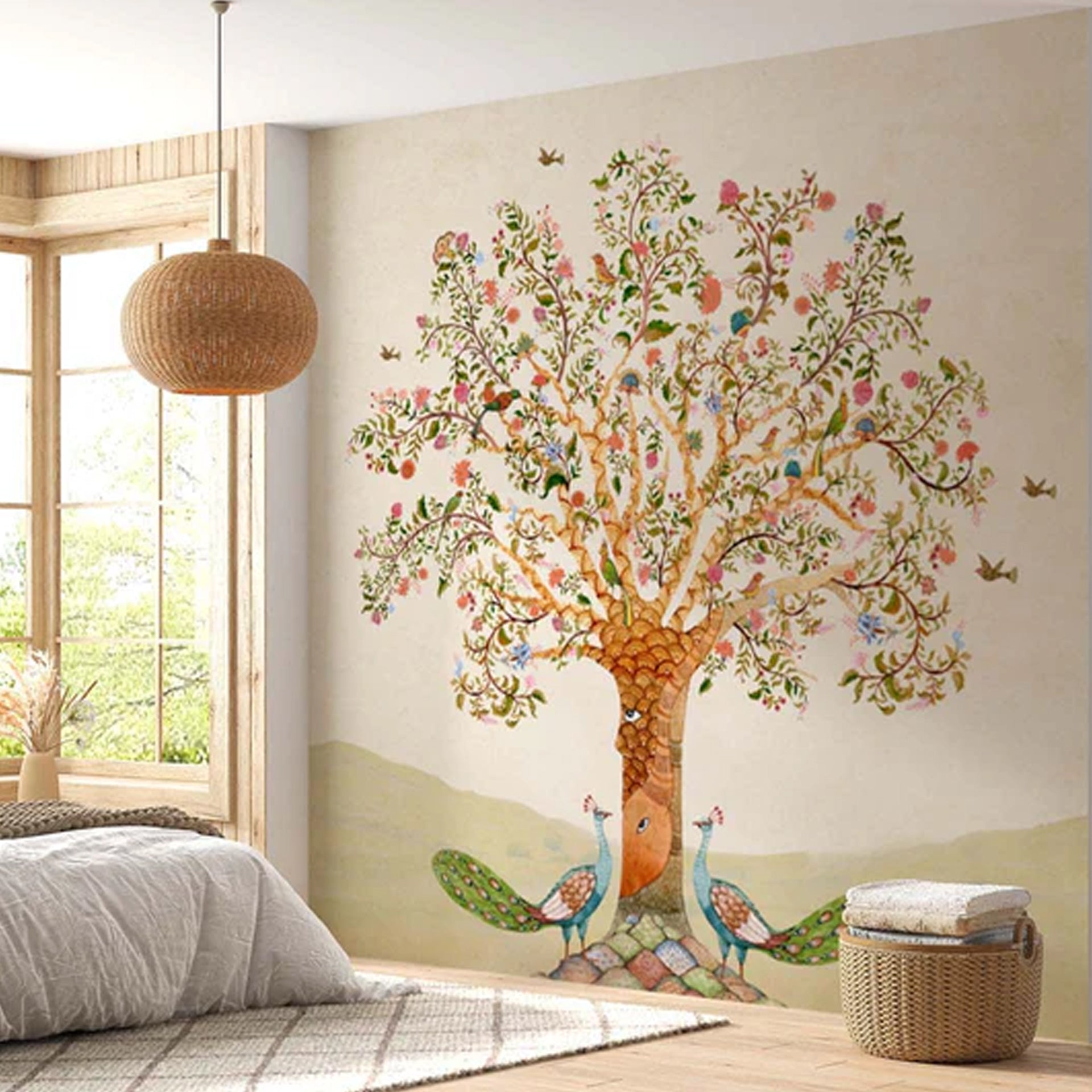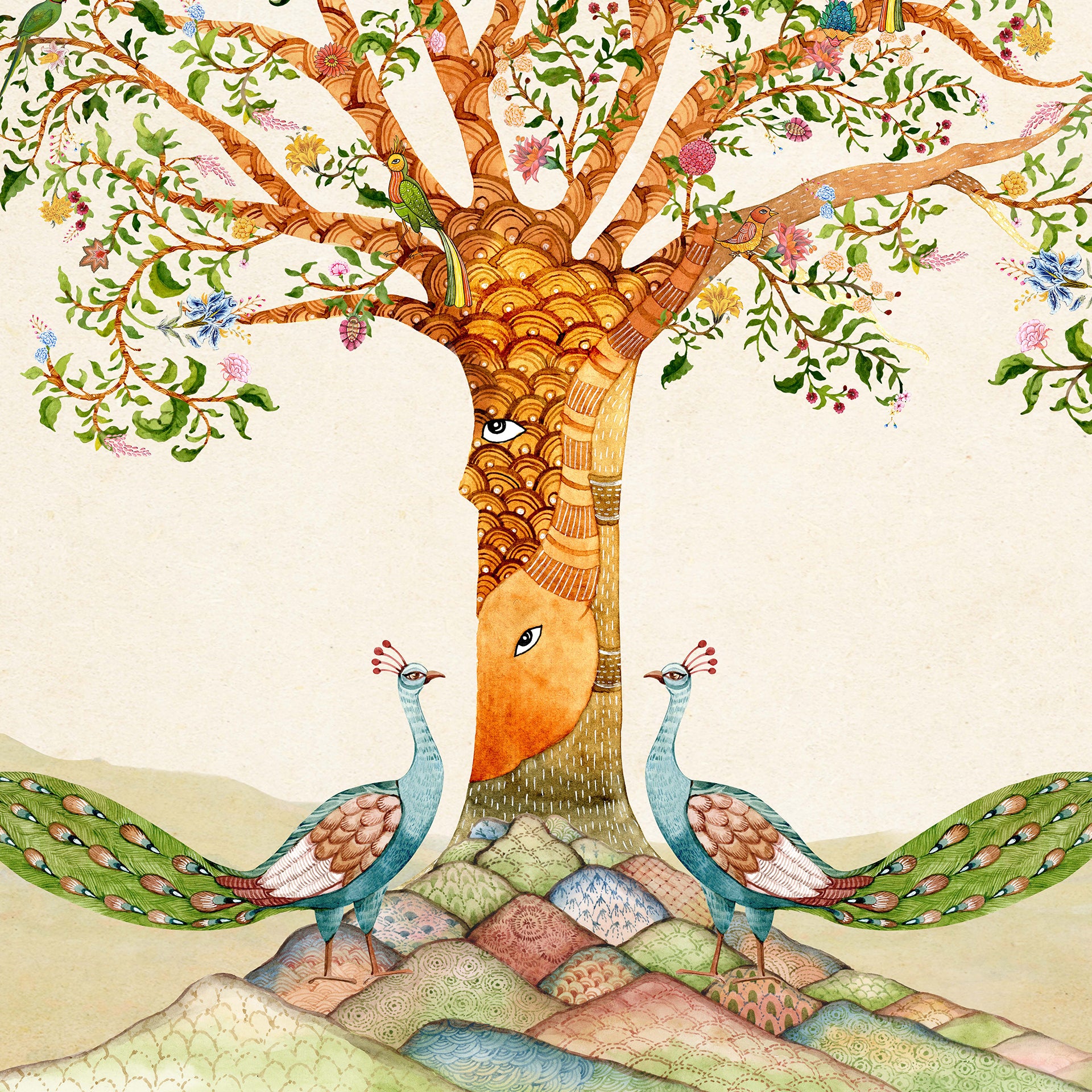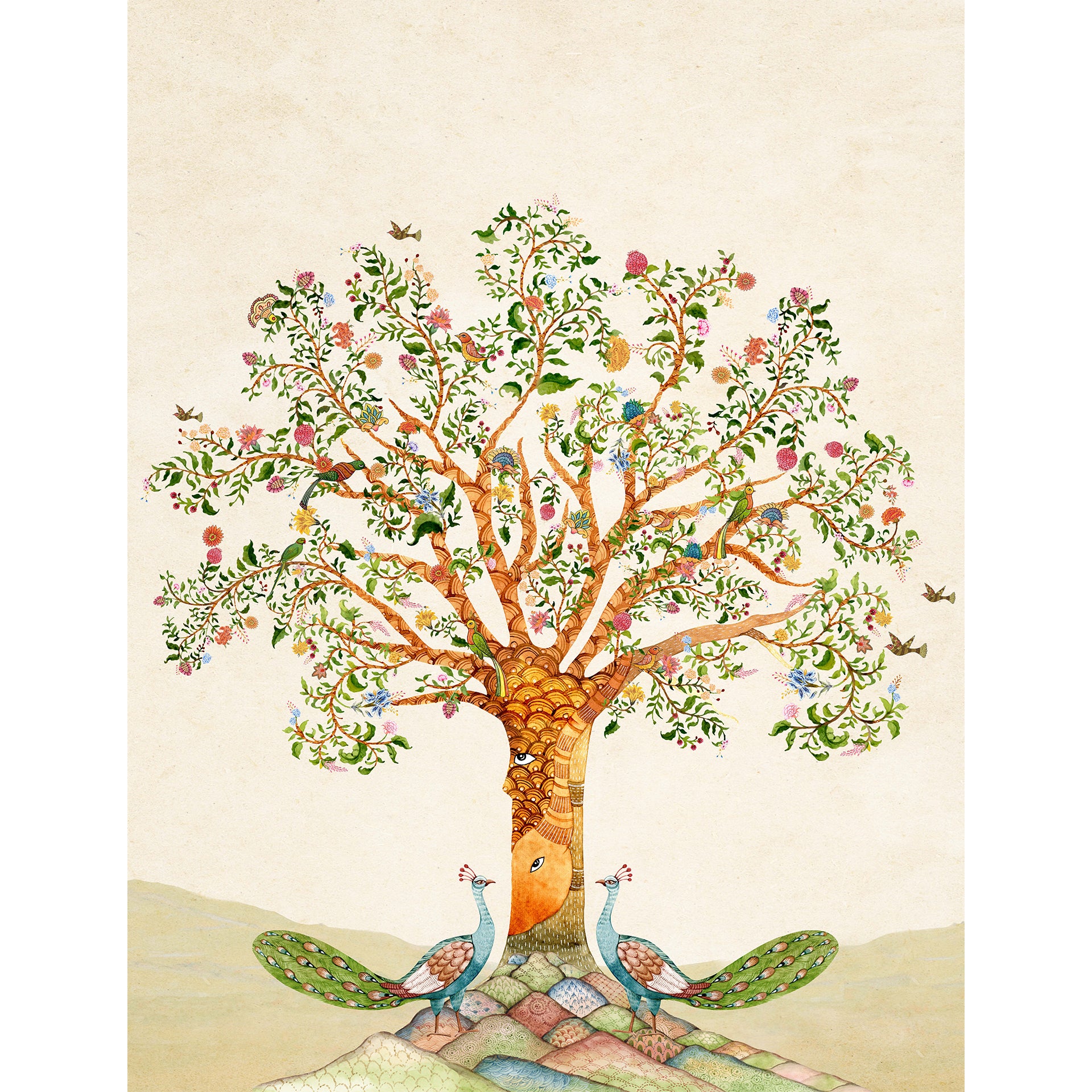 Gentle Guardians: Whimsical Artistic Tree Illustration With Peacocks And Floral Designs
