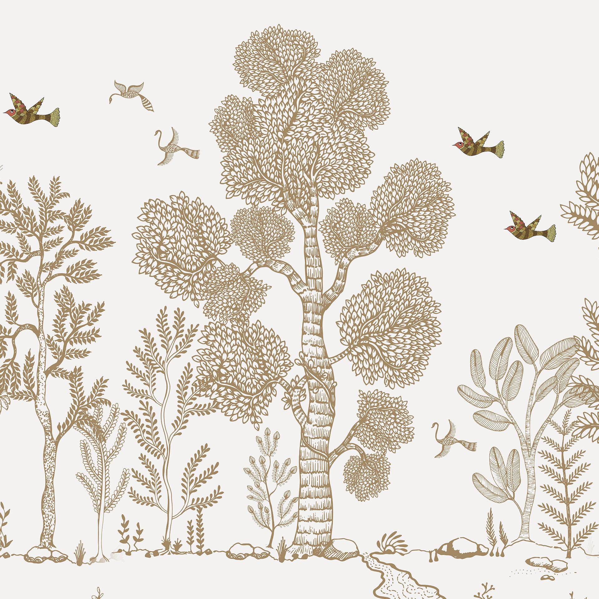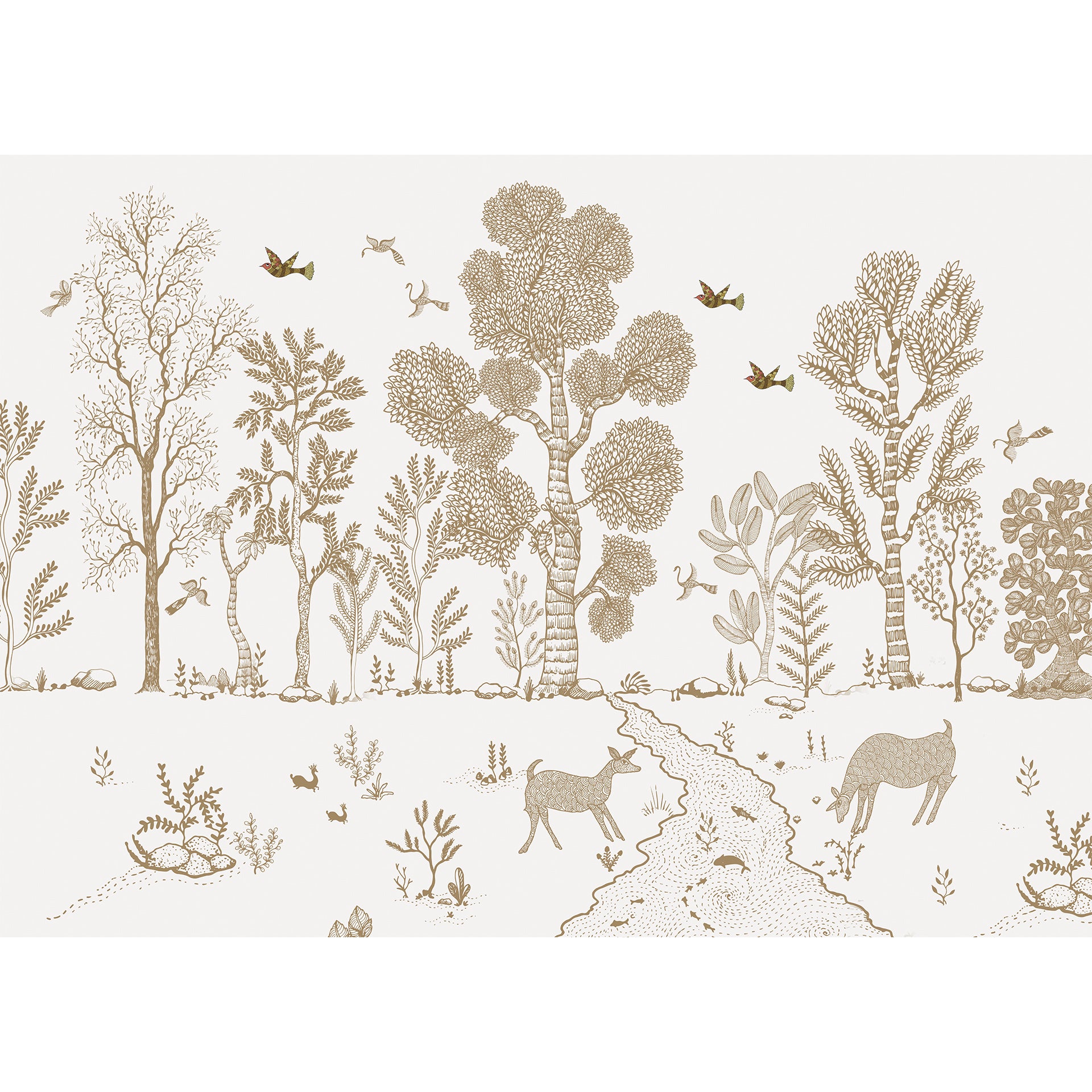 Illustrated nature scene with delicate line-drawn trees, birds in flight, woodland animals, and plants. Soft tones and detailed craftsmanship create a serene and harmonious illustrative charm.