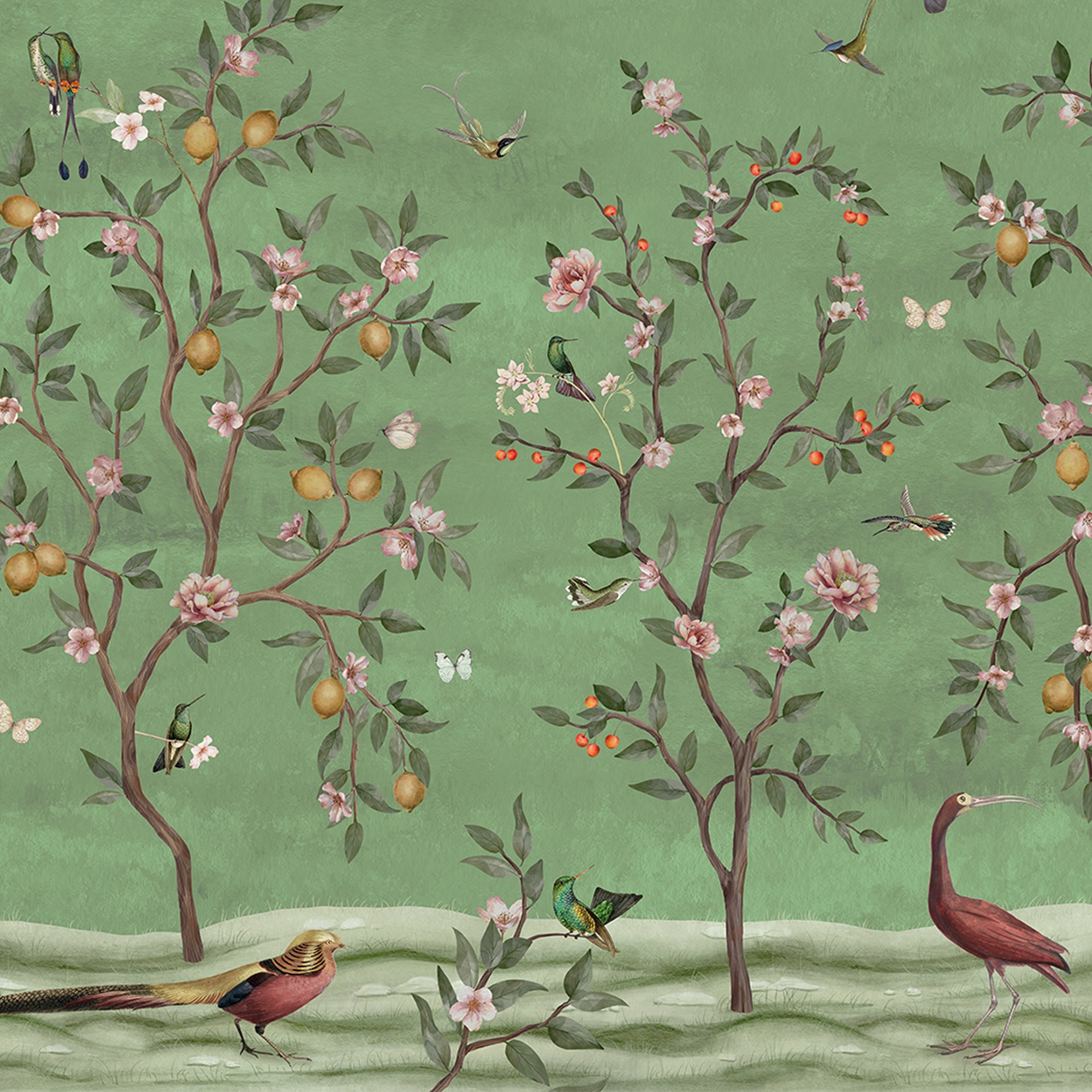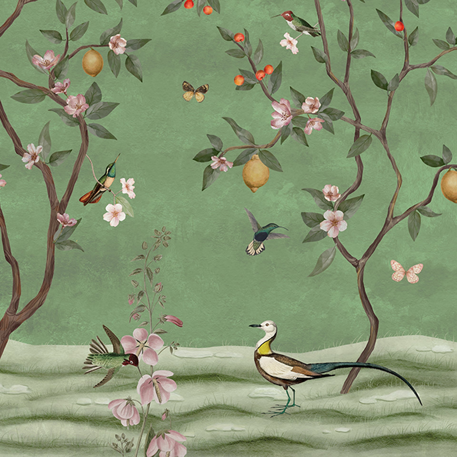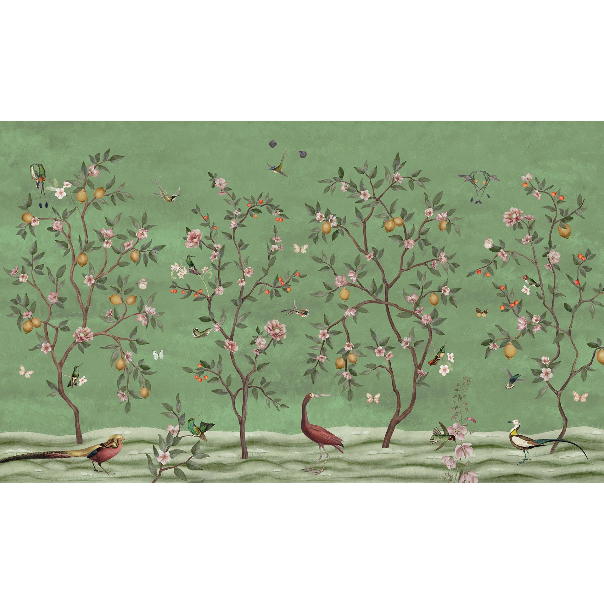 Lemon Tree Chinoiserie Green: A Whimsical Botanical Wallpaper Featuring Blossoming Fruit Trees, Colorful Birds, And Fluttering Butterflies Set Against A Soft Green Background
