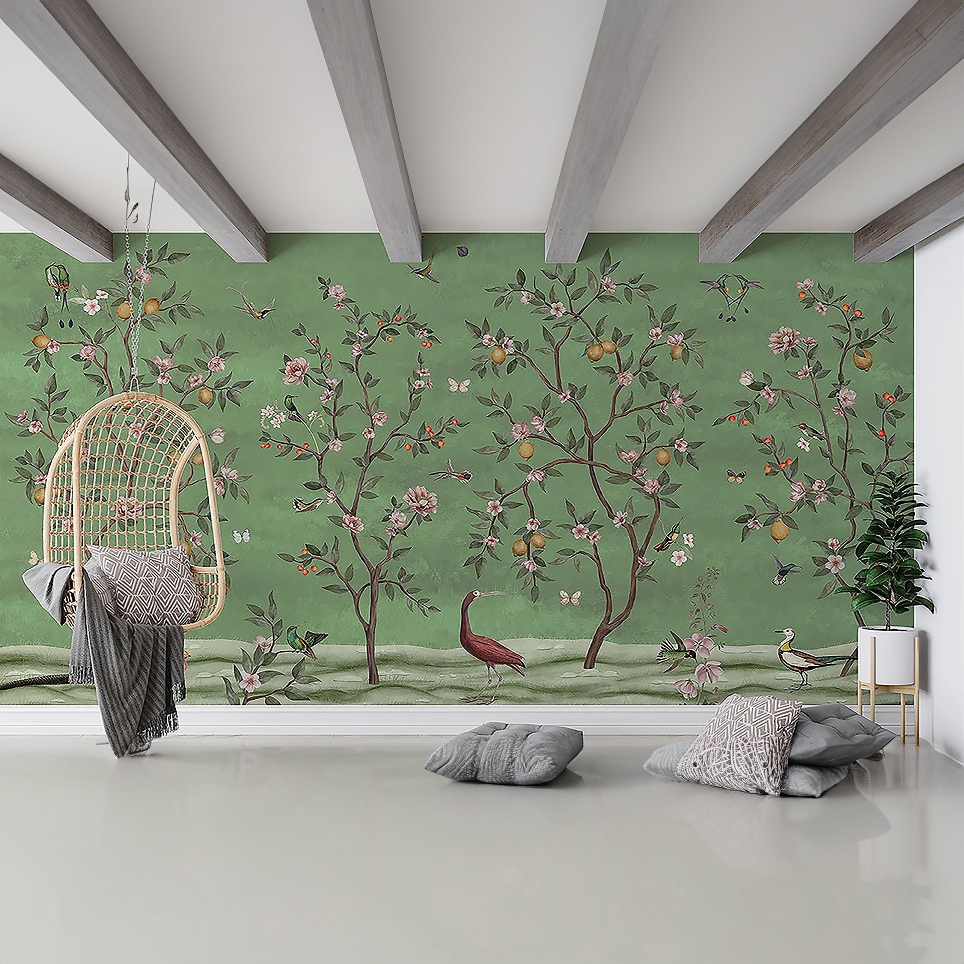 Lemon Tree Wallpaper with Birds on Green Background, a nature inspired wall decor, perfect for living rooms, bedrooms, or nurseries, this nature-inspired wallpaper adds warmth and serenity. Made with high-quality materials, it’s ideal for creating a calming, botanical ambiance.
