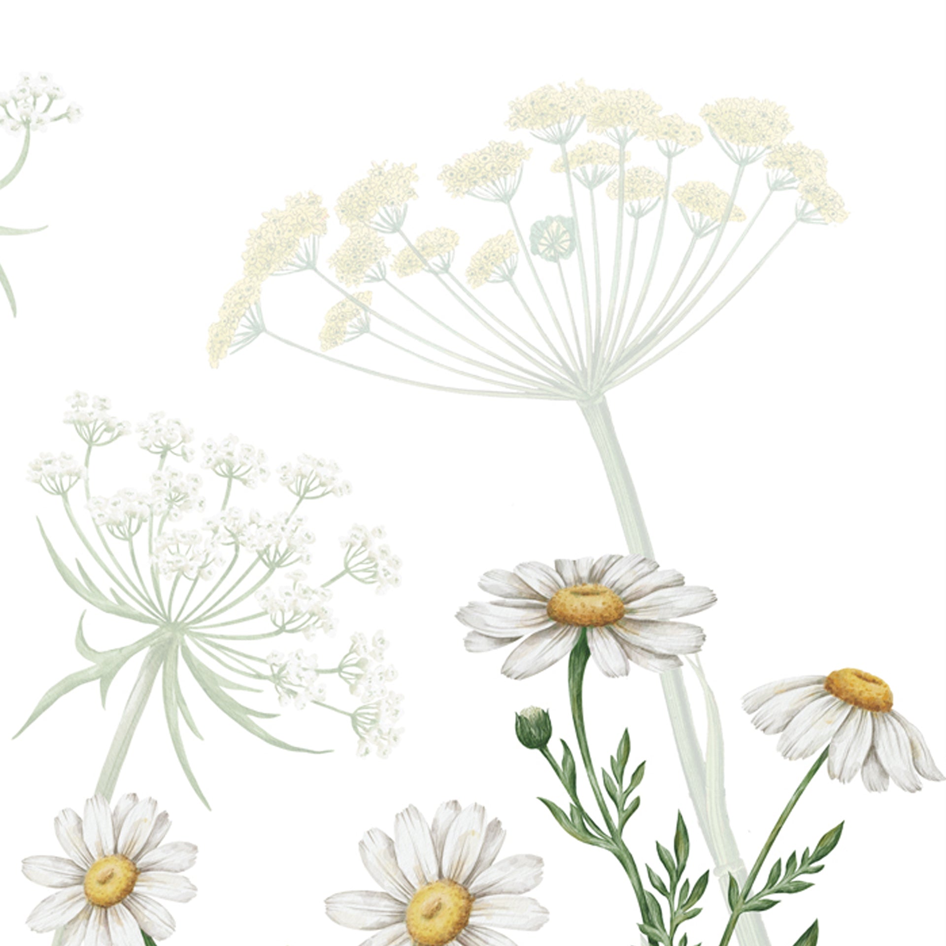 White Daisies: A Light And Airy Botanical Illustration Of Daisies And Wildflowers On A Crisp White Background. The Fresh, Minimalist Design Highlights The Delicate Details And Natural Elegance Of Each Bloom.