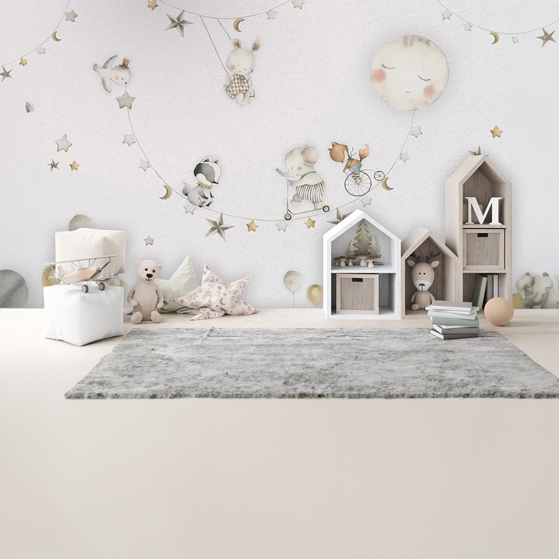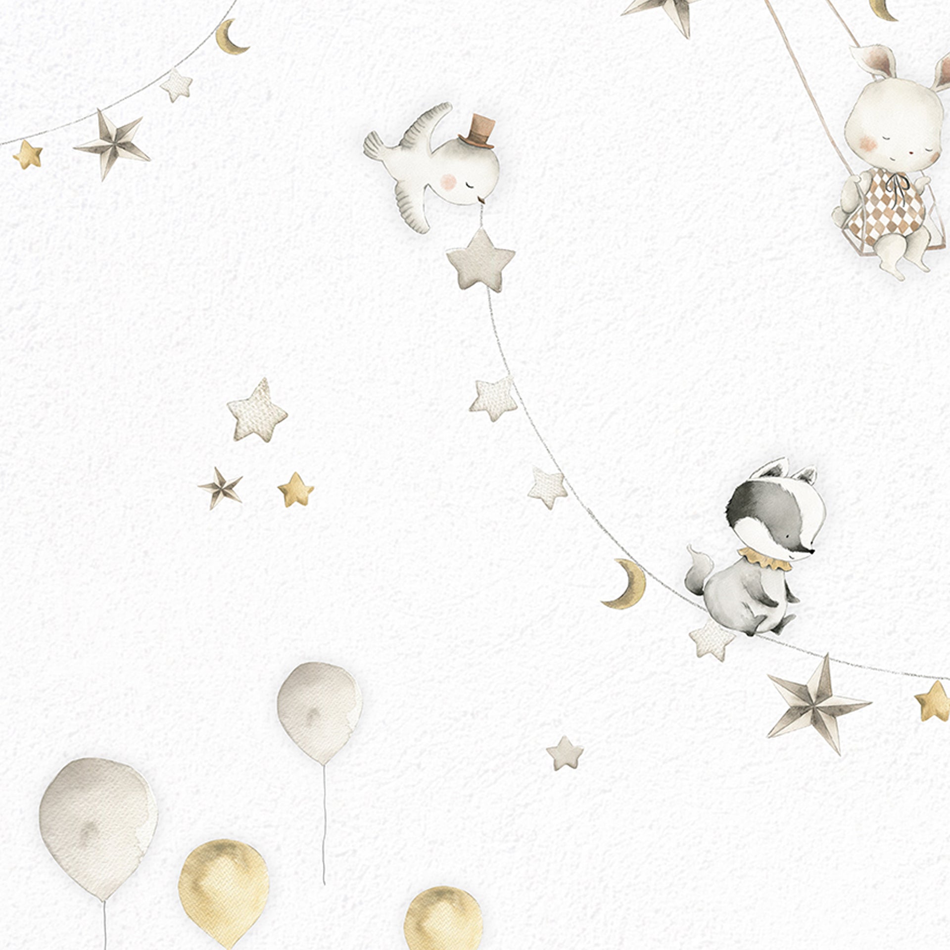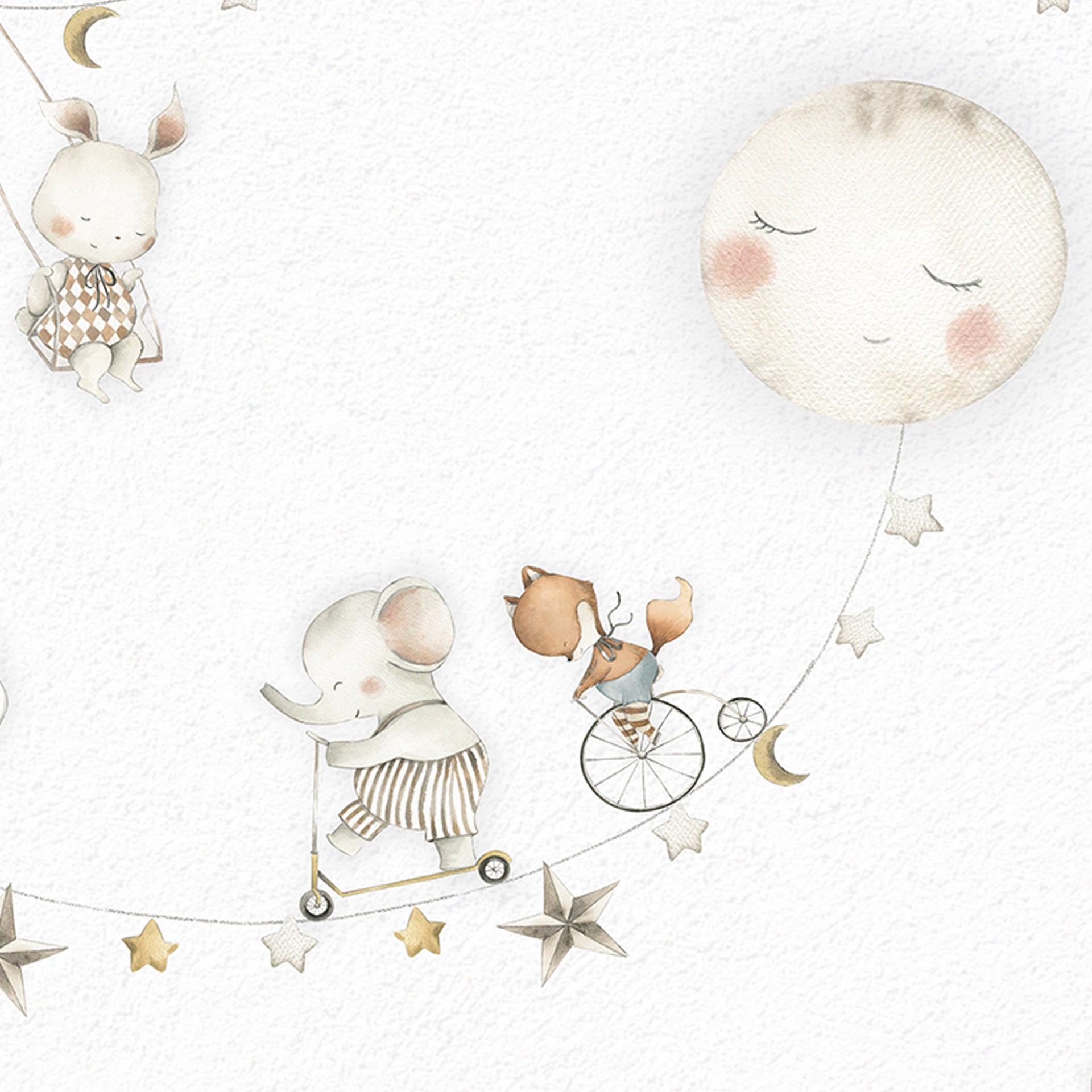 A soft, pastel watercolor scene of cute rabbits on a string of stars and moons, with balloons drifting below. Gentle, dreamlike and perfect for children’s rooms or whimsical celebrations.