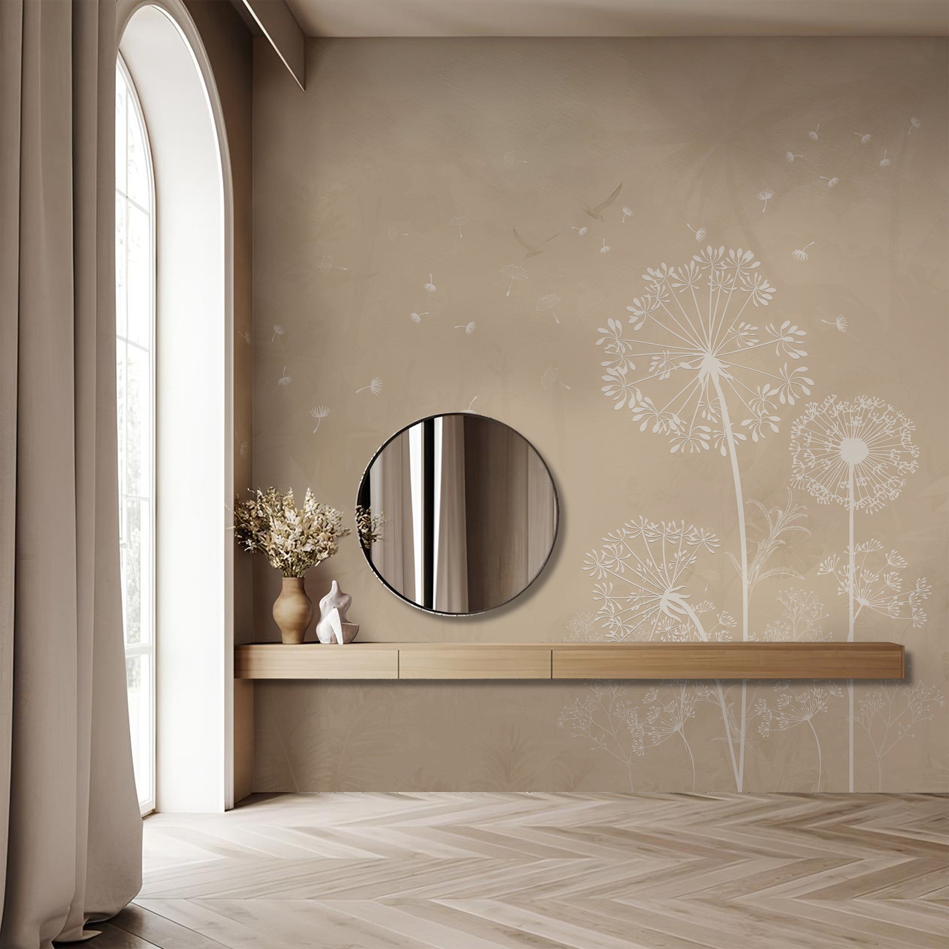 Minimalistic design featuring white dandelions blowing in the wind against a soft beige gradient background. The gentle tones evoke tranquility and simplicity, ideal for decor, design, or peaceful settings.