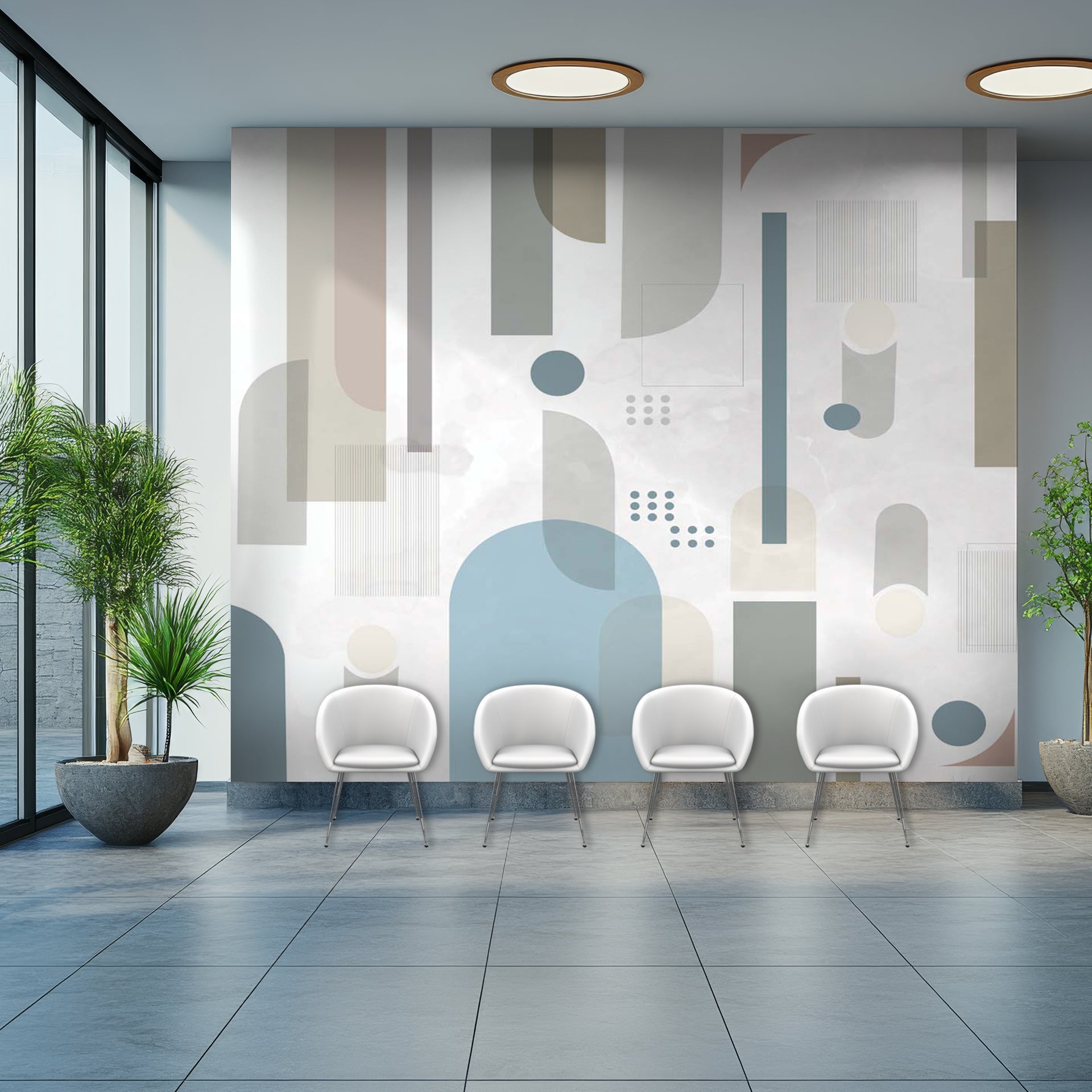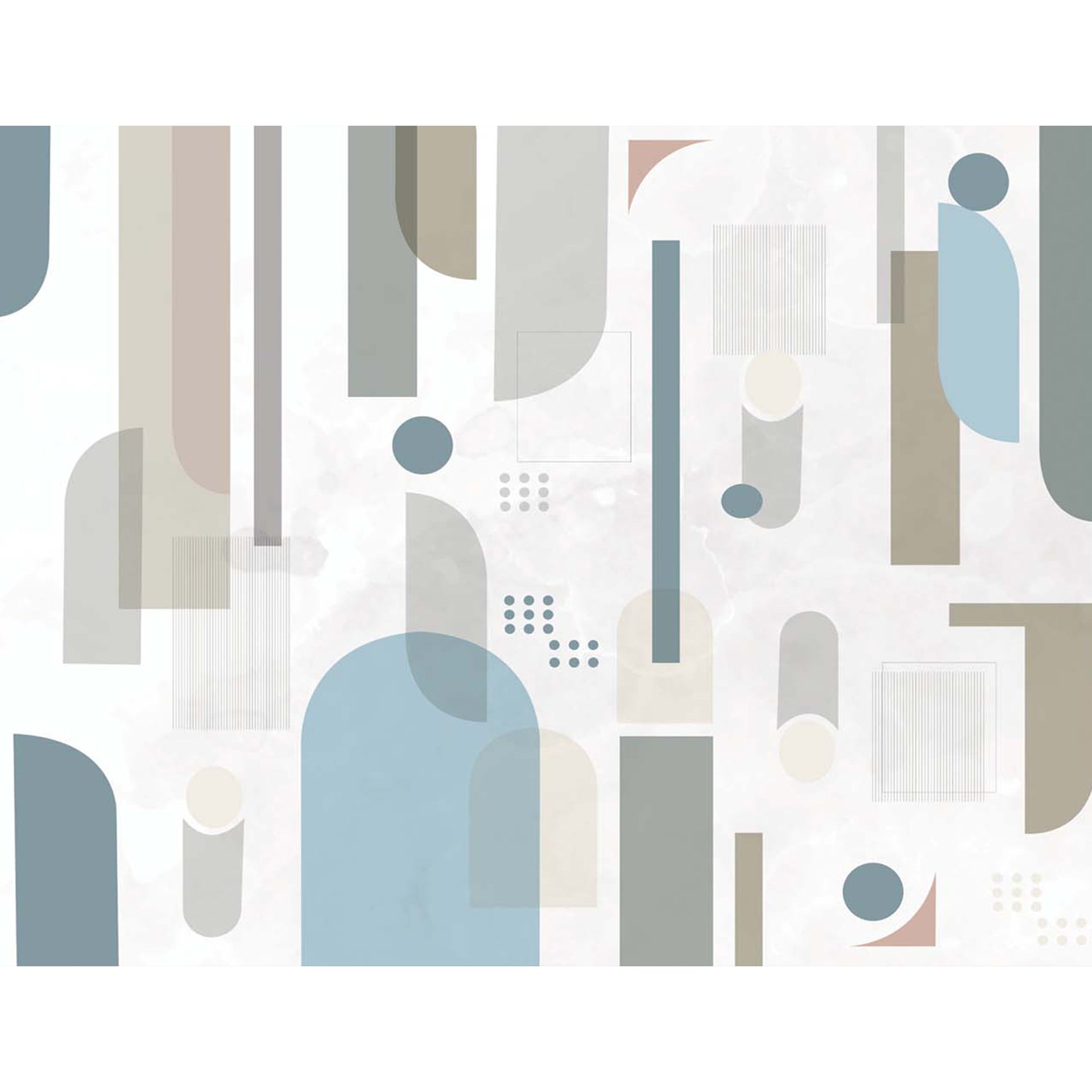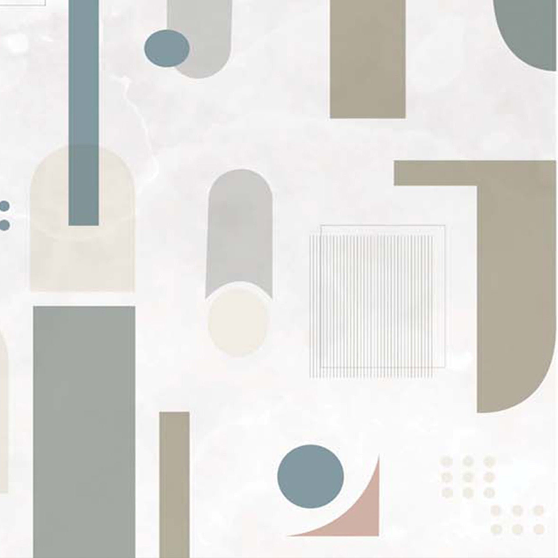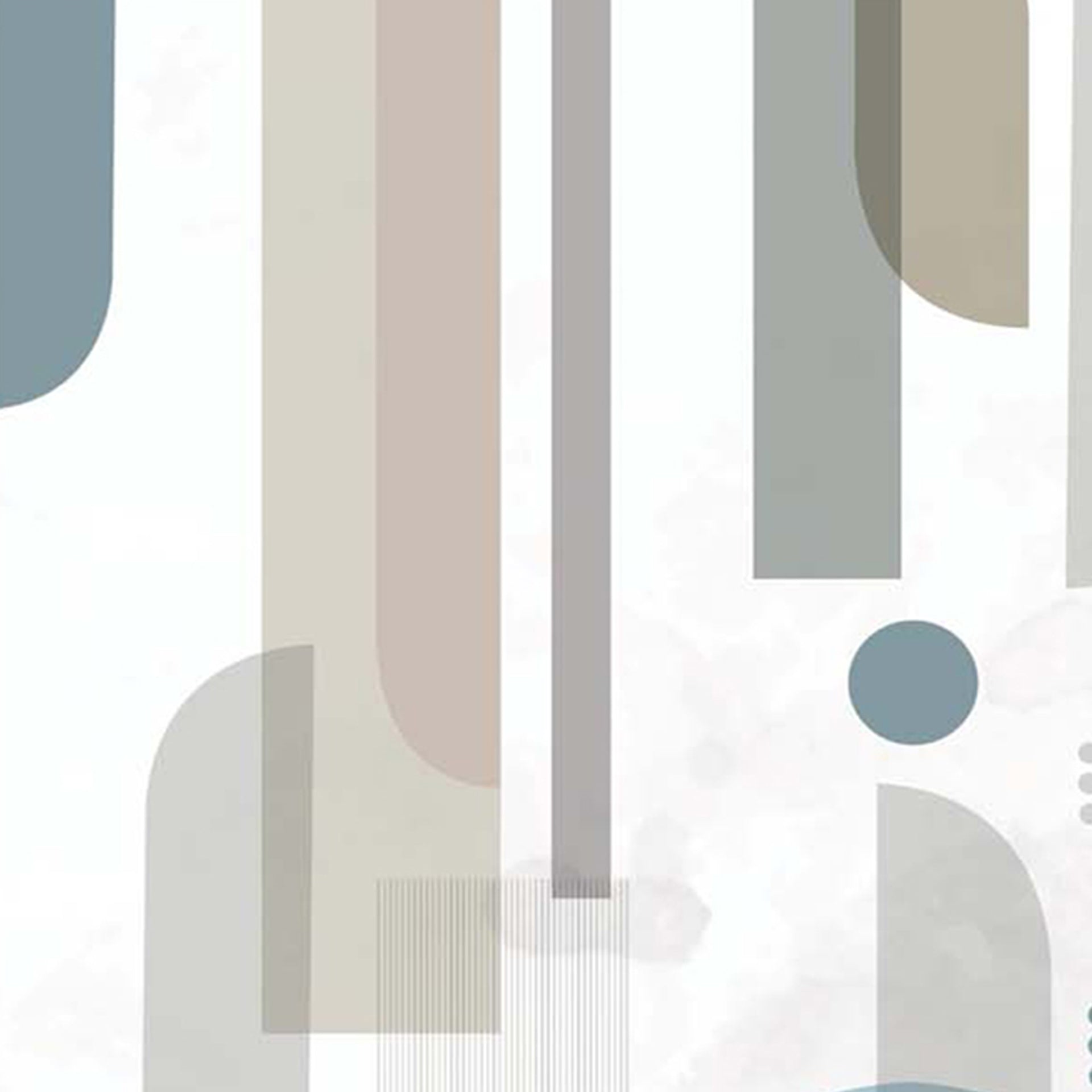 Dynamic Geometry: This Modern Abstract Design Features A Dynamic Arrangement Of Geometric Shapes And Lines In Soft, Muted Tones Of Blue, Beige, And Taupe.