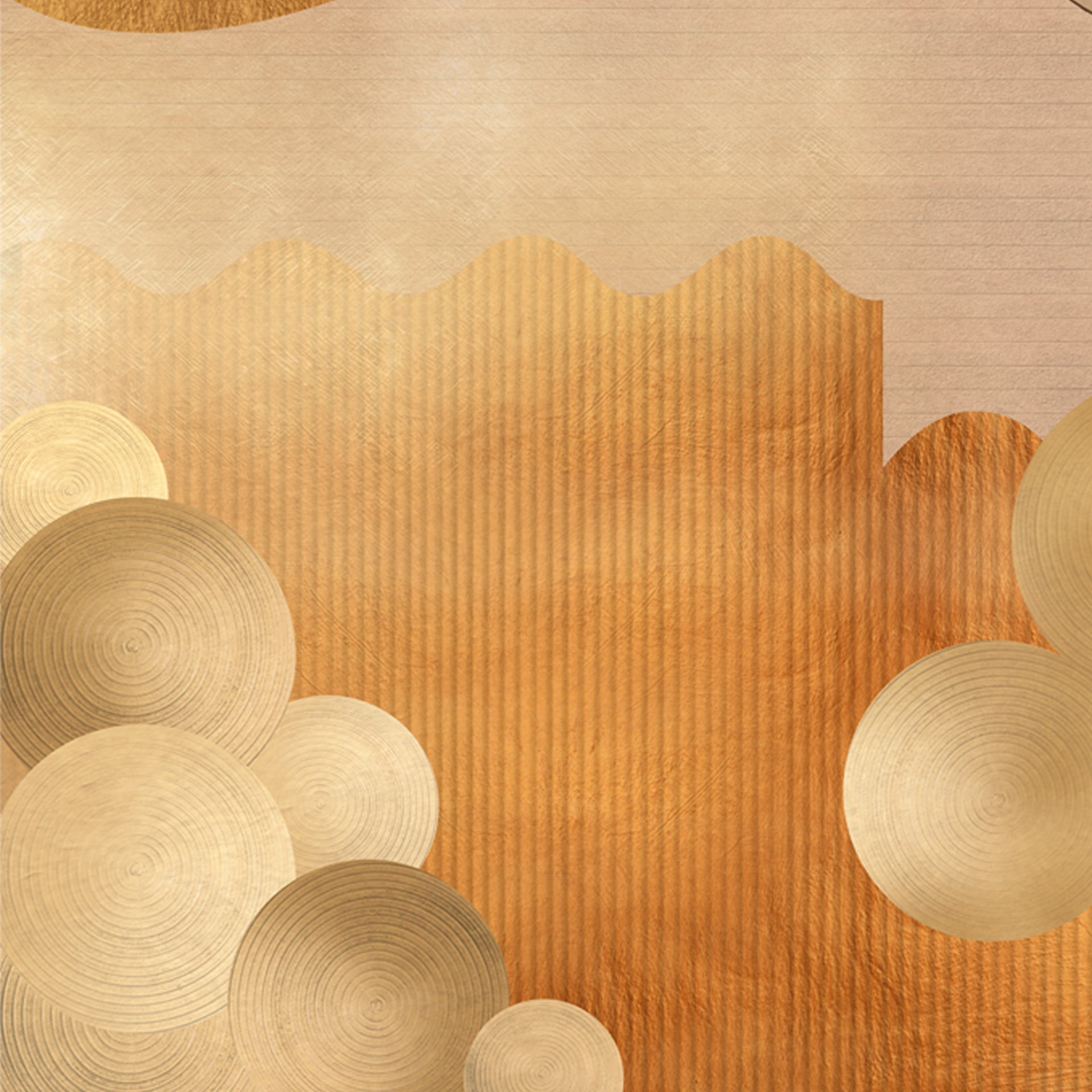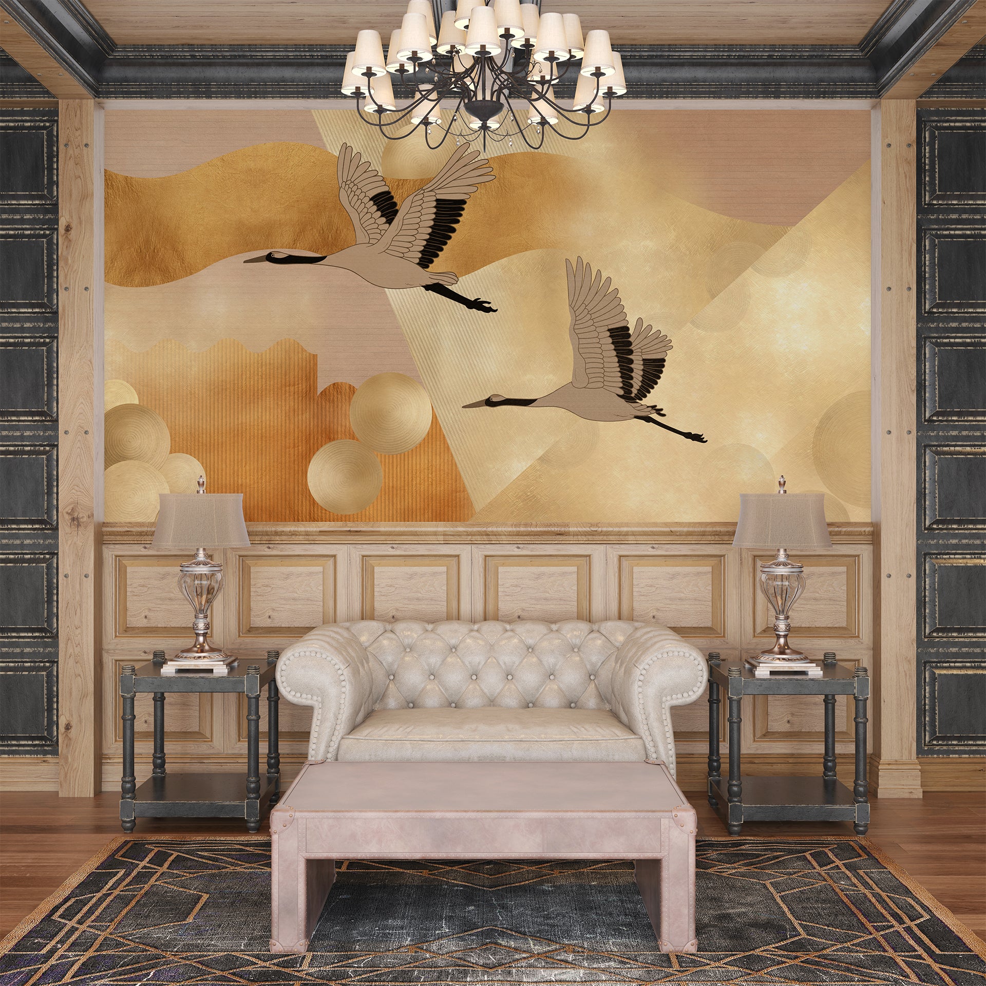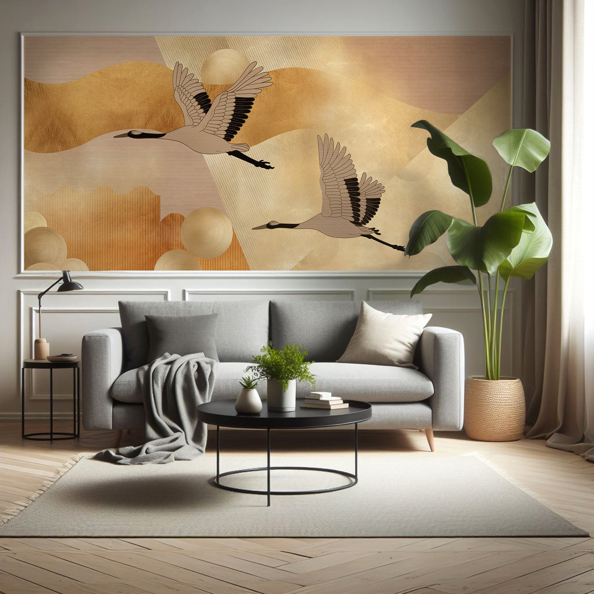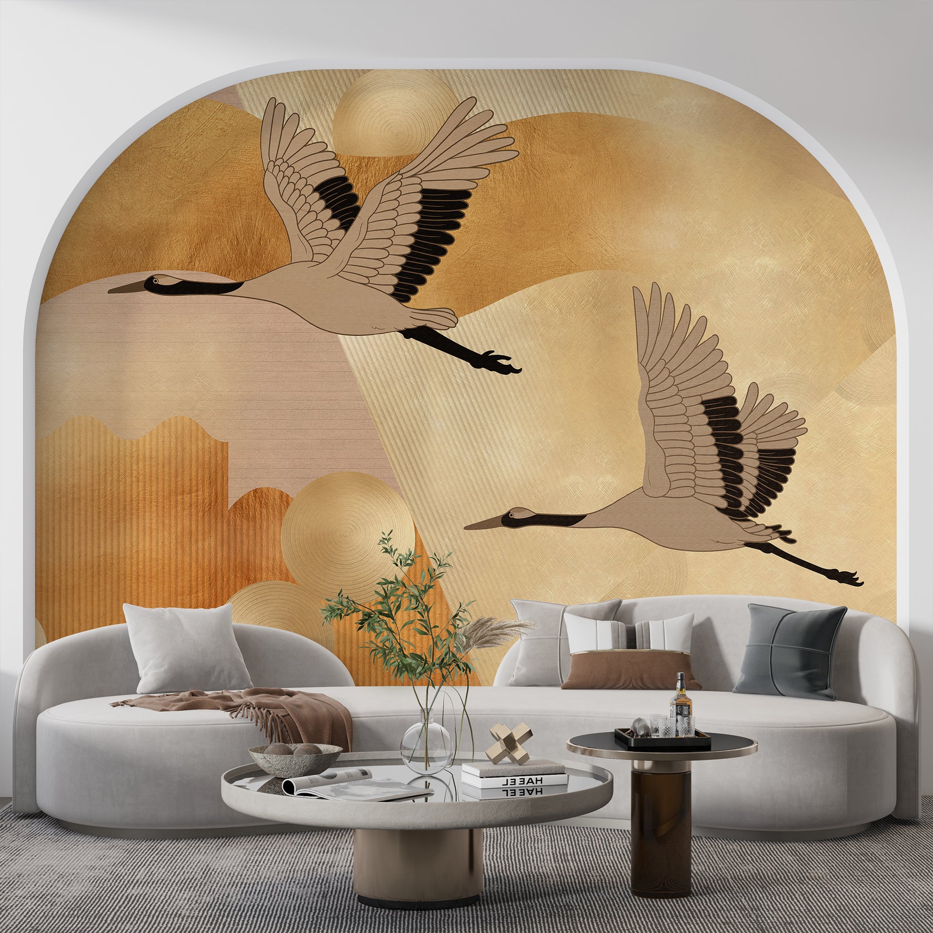 Elegant Cranes: Flying Over Abstract Golden Canvas With Textured Patterns