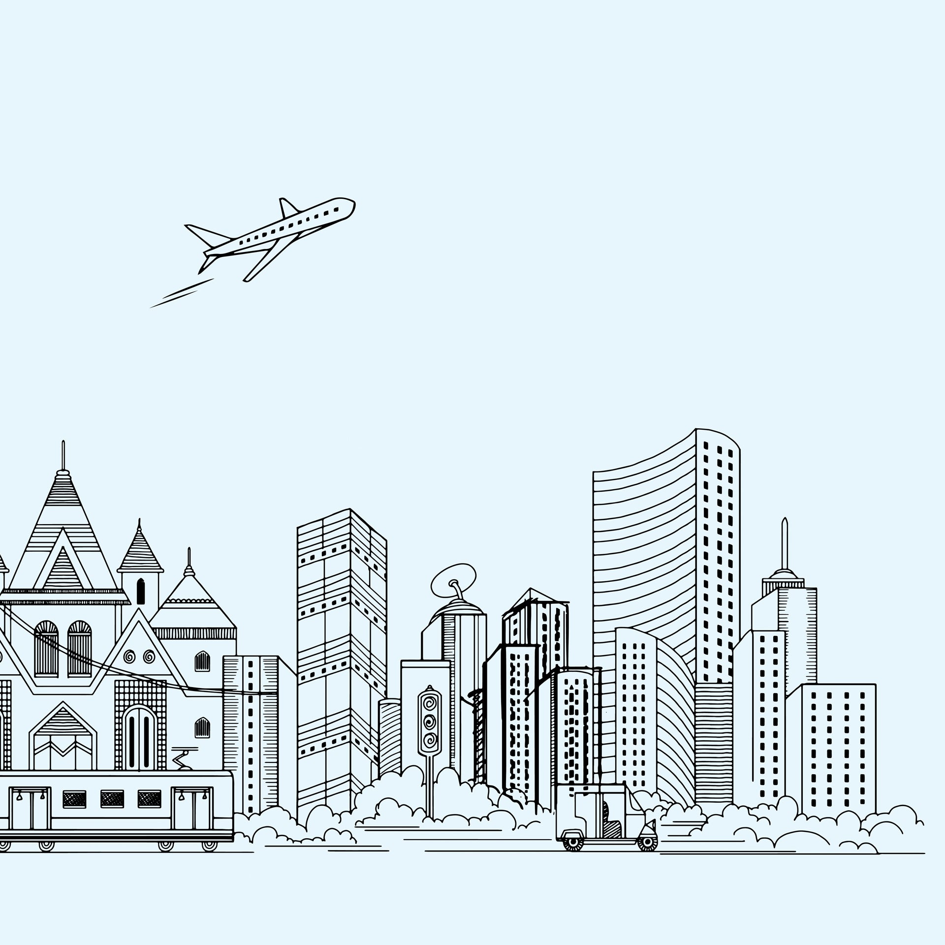 Black-and-white line art of a city skyline showcasing prominent landmarks and modes of transport, including the Gateway monument and urban buildings set against a light blue background.