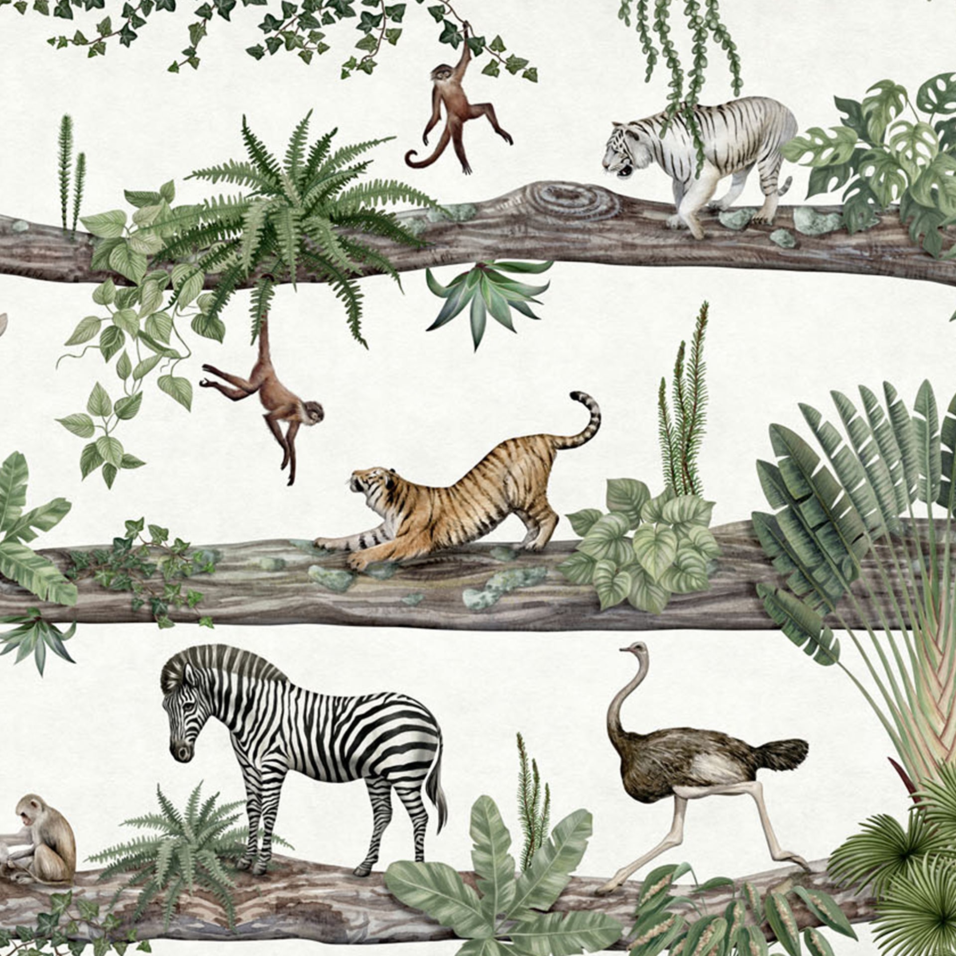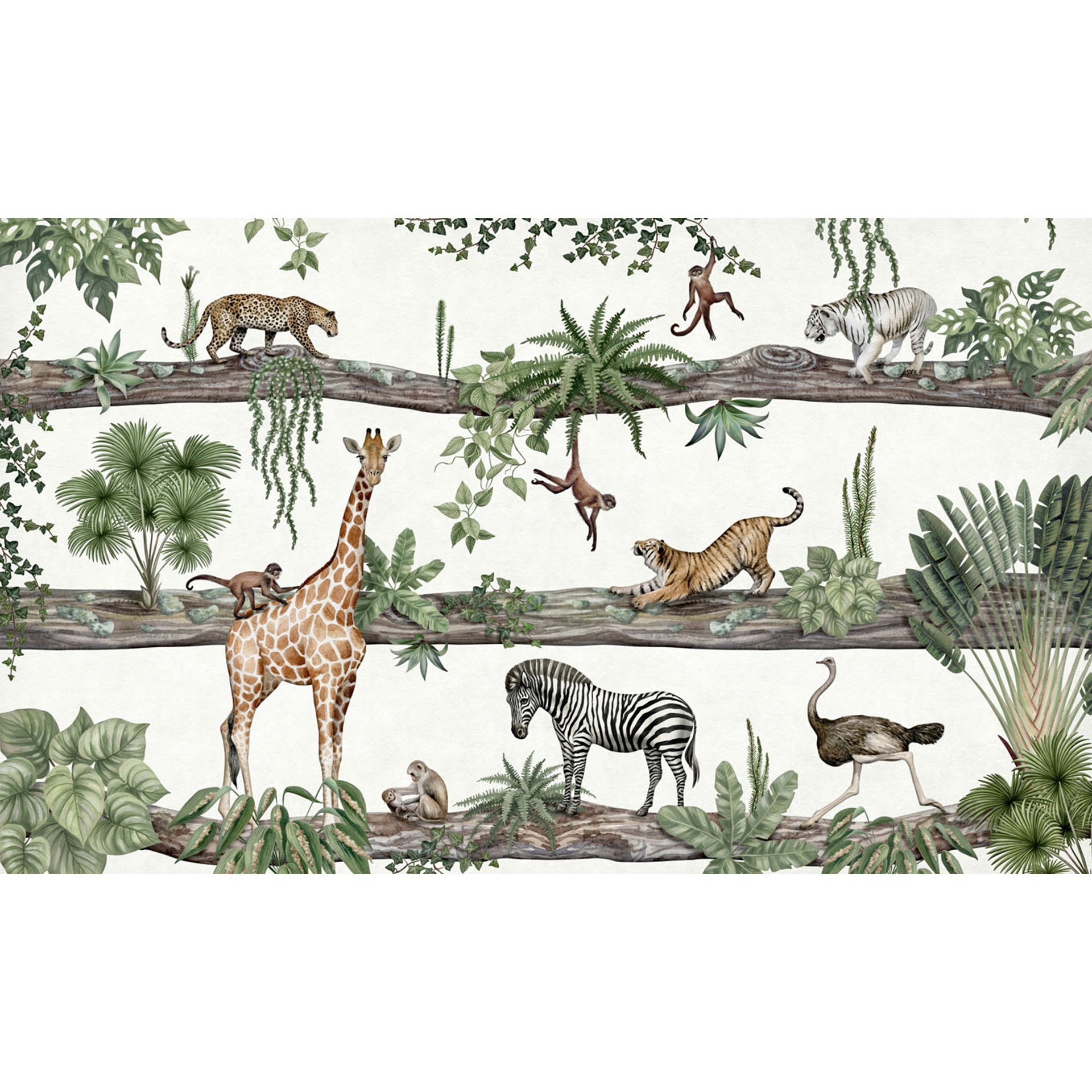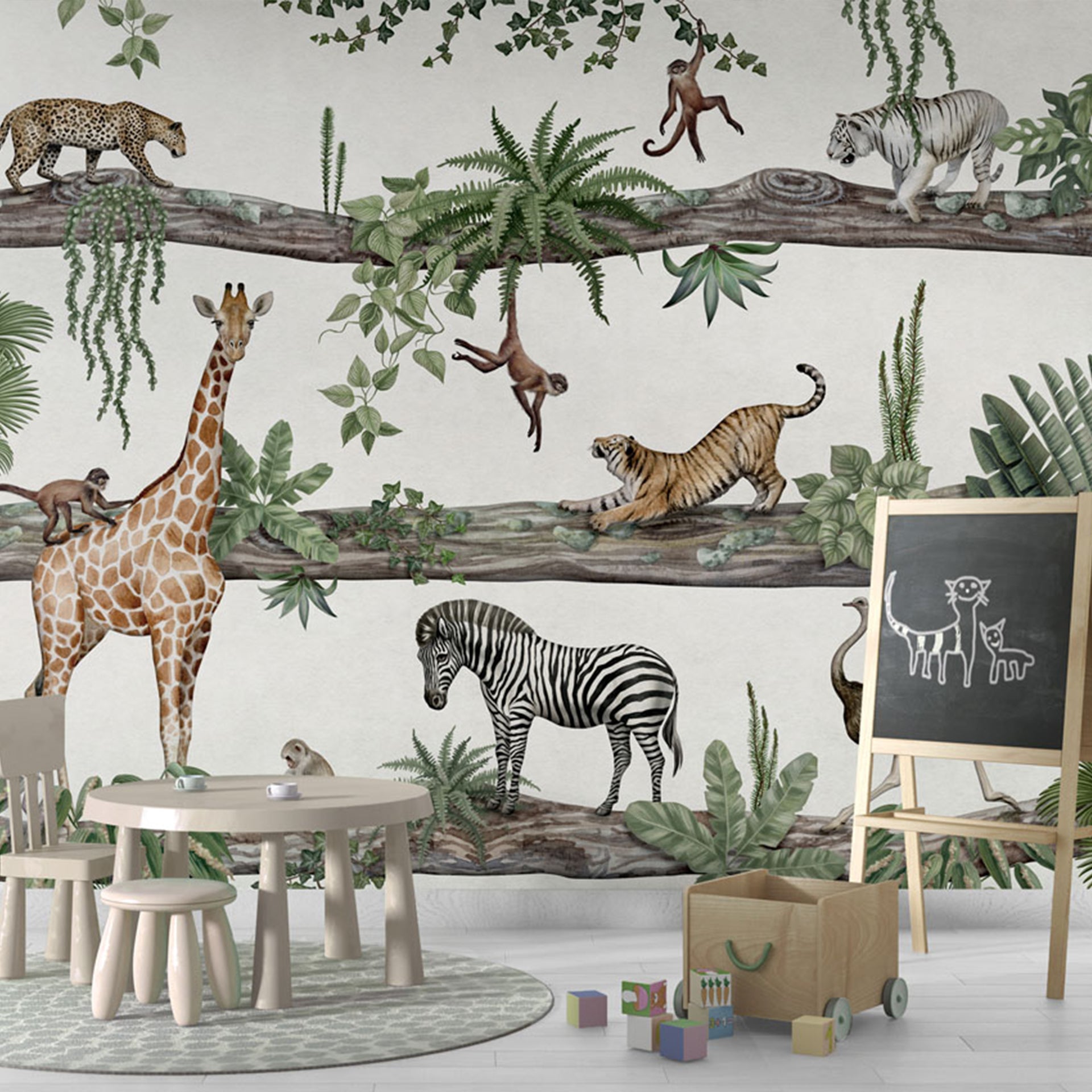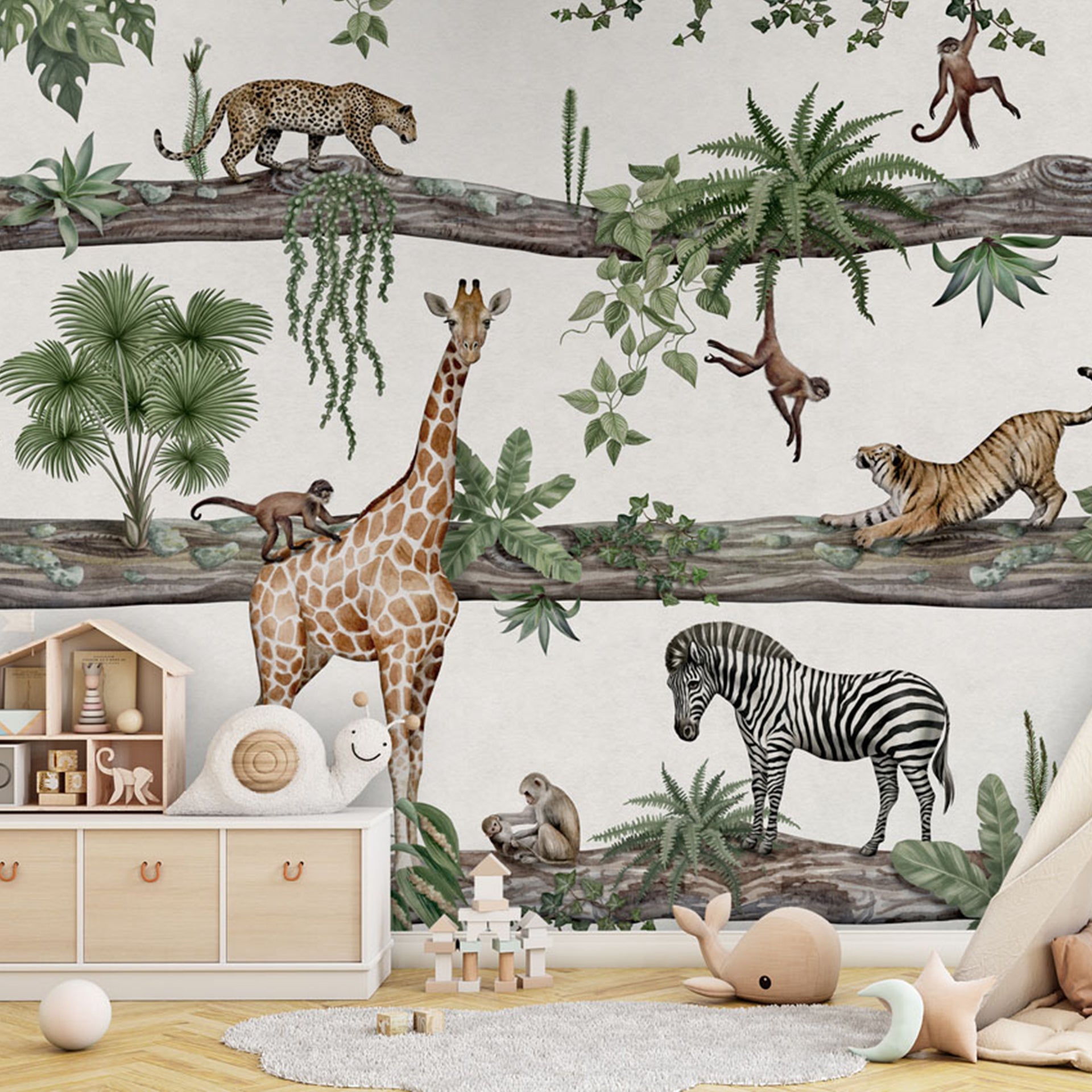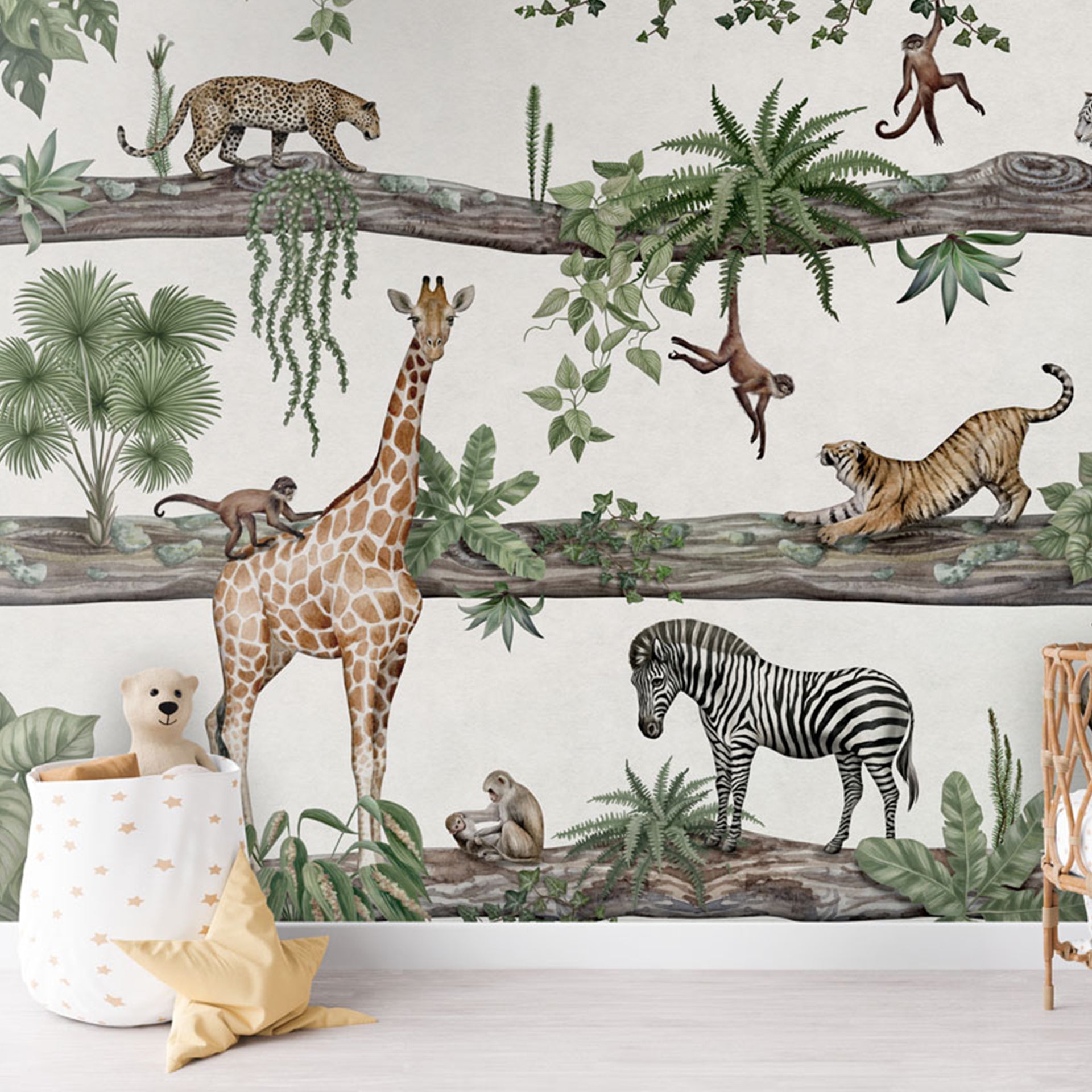 Amazing-Animals: Colorful Jungle Wallapaper With Giraffe Zebra Tiger Monkey Leopard On Wooden Logs