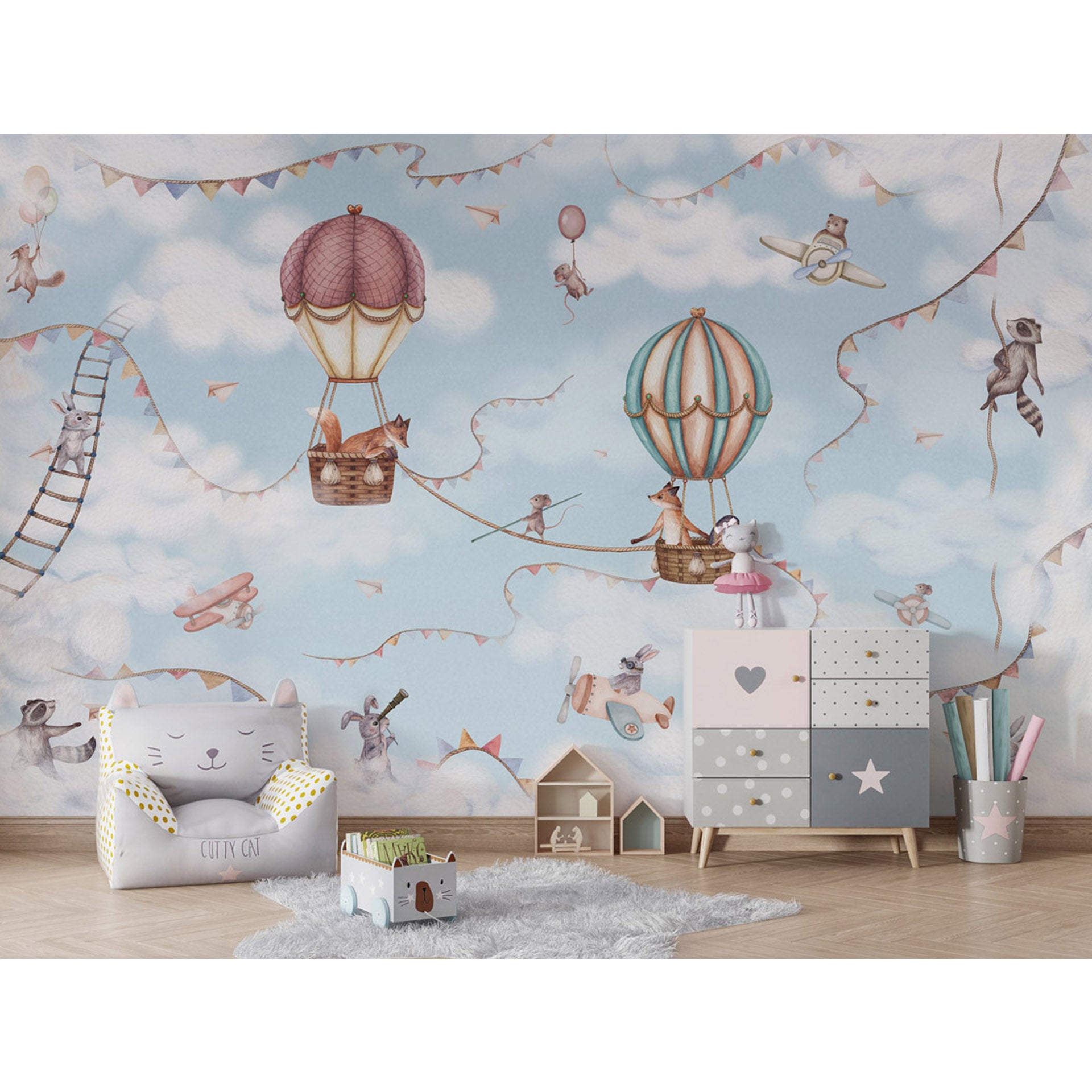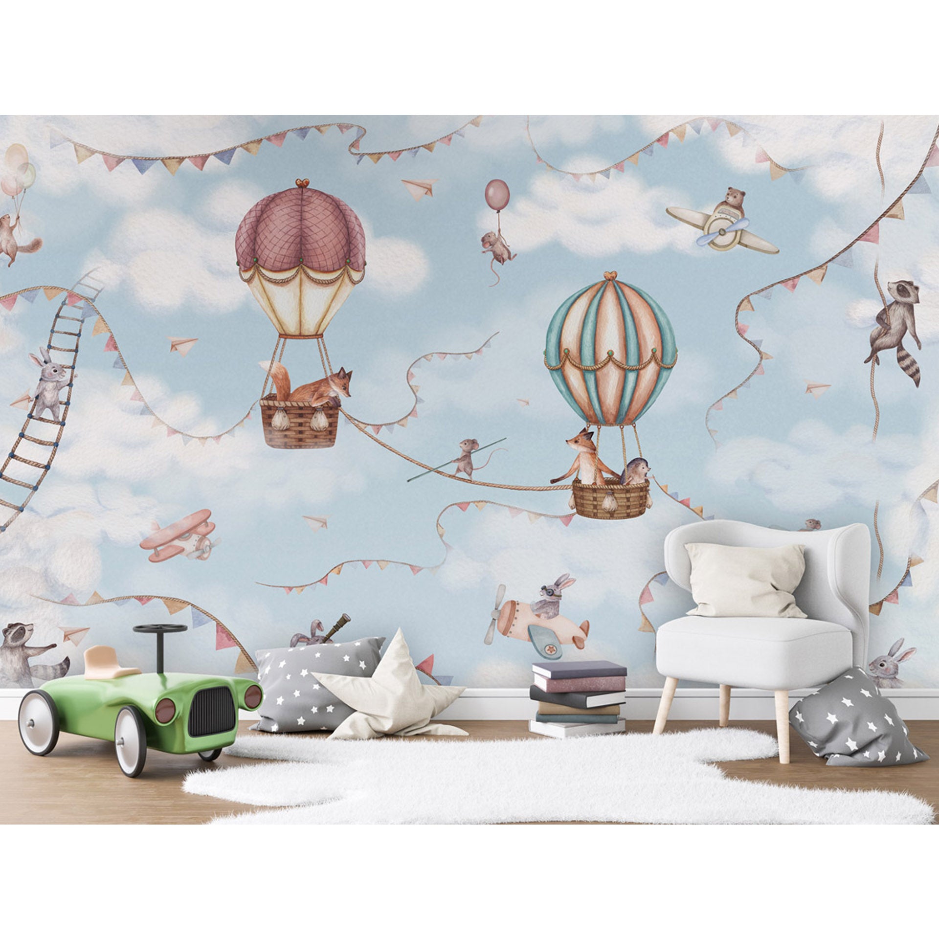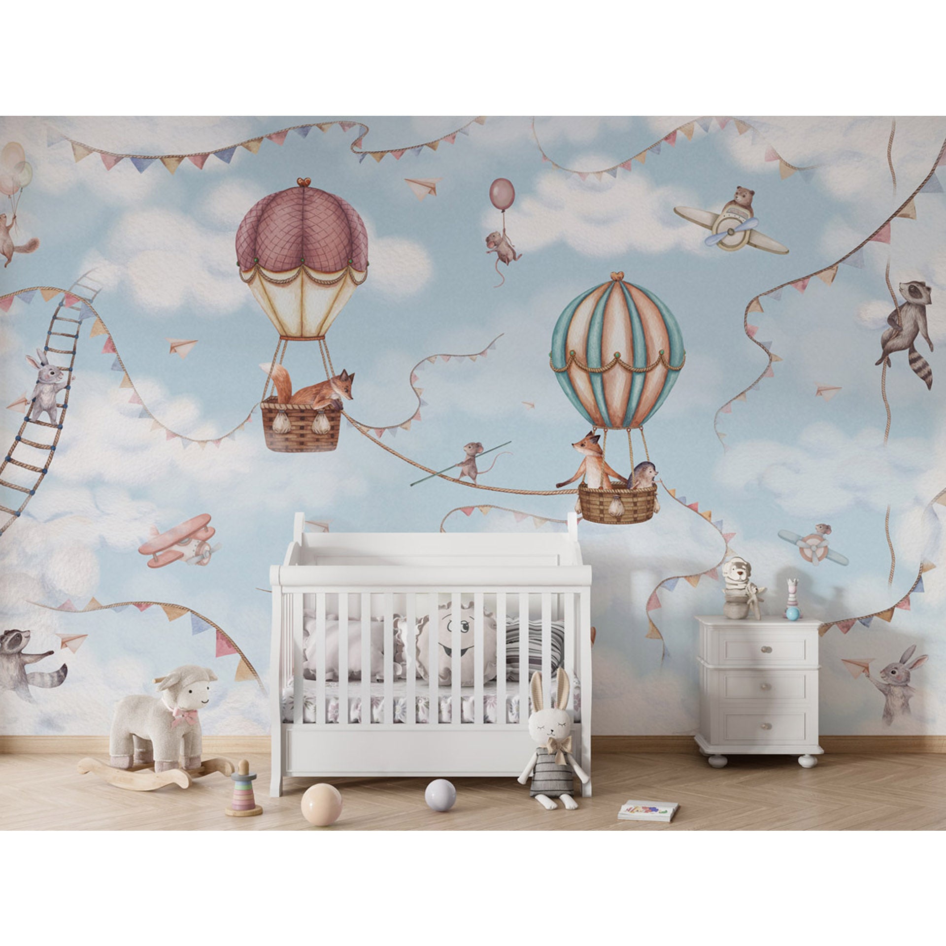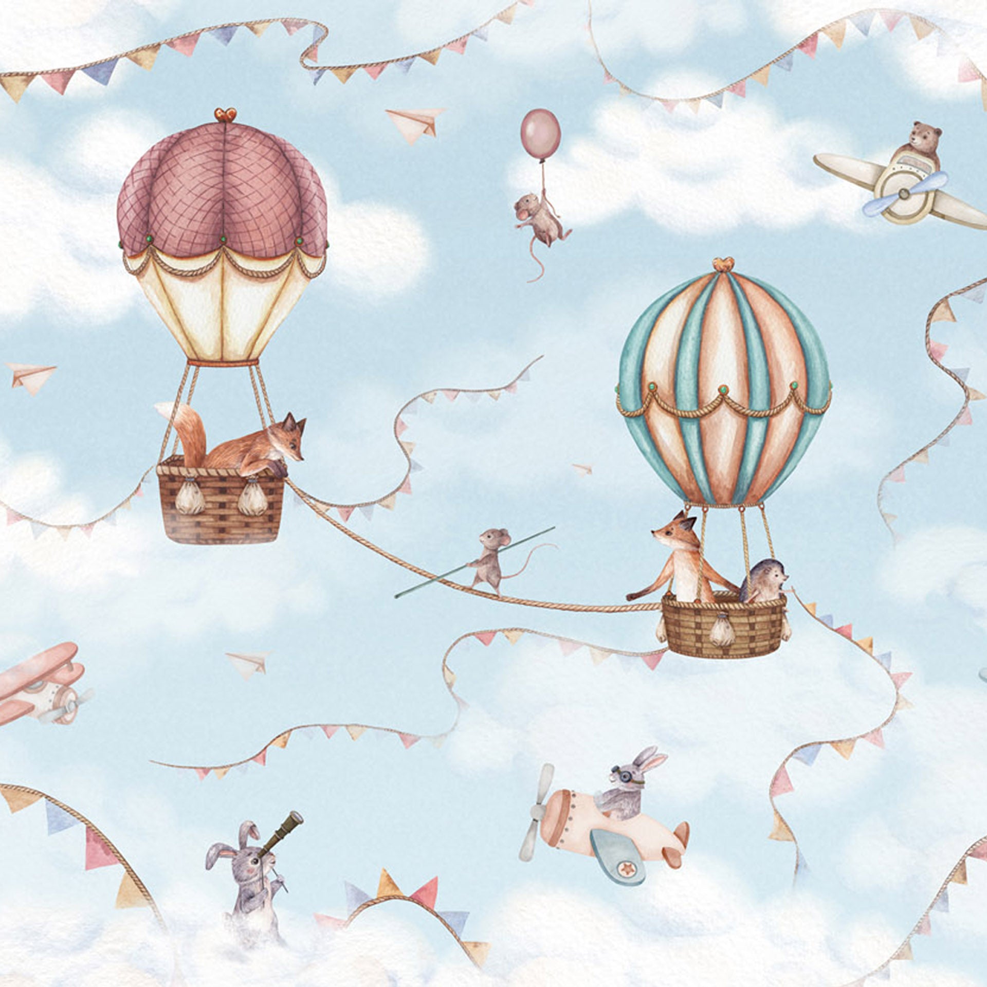 Dreamy watercolor illustration of hot air balloons, playful woodland animals and vintage planes drifting among clouds and bunting flags; gentle pastel tones evoke imagination, adventure, and cozy nursery decor for children.