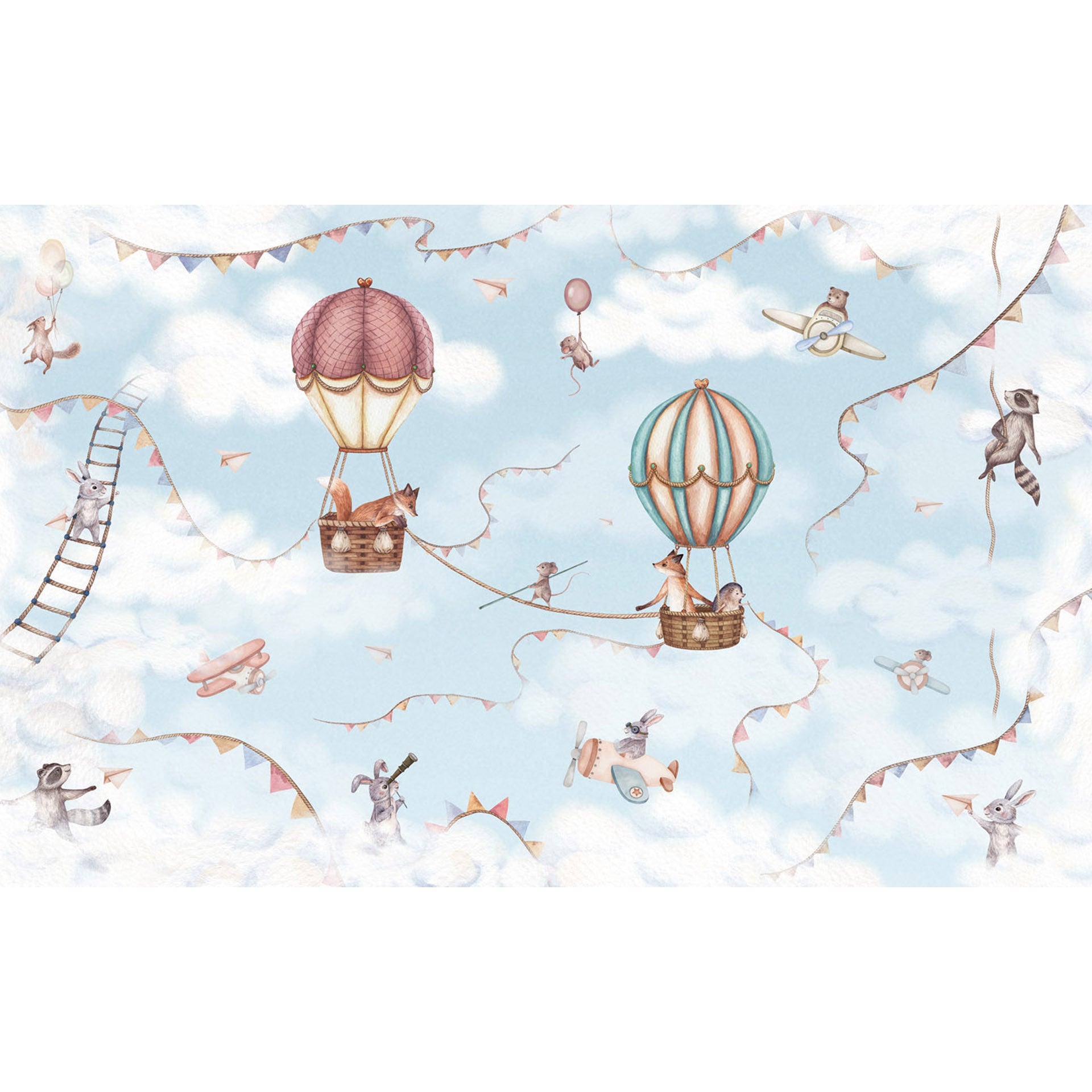 Aviation Adventure: Whimsical Hot Air Balloons and Woodland Animals Flying Through Cloudy Sky