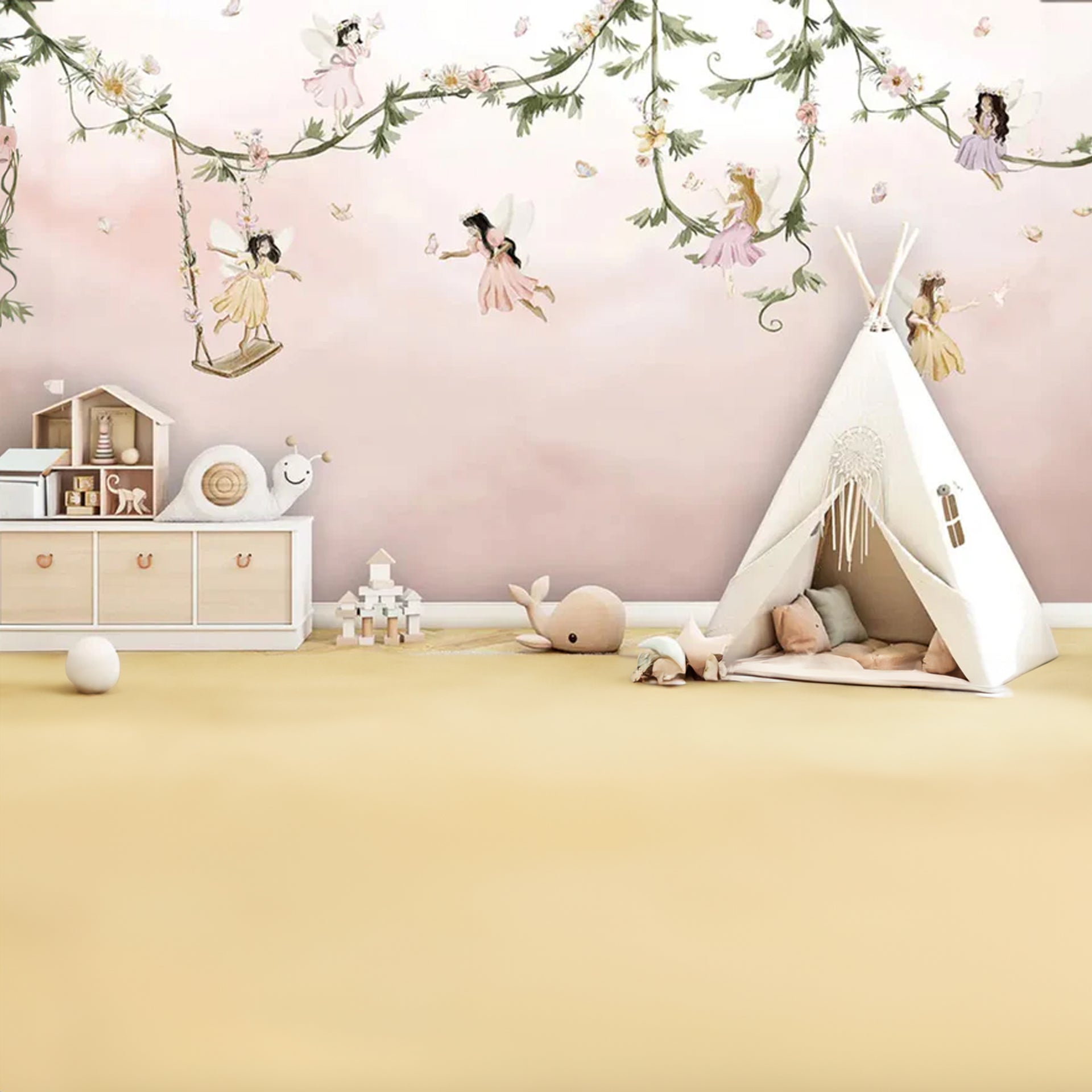 Delicate illustration of tiny fairies in pastel dresses perched on twisting vines, fluttering among blossoms beneath a dreamy pink sky. Whimsical, magical mood perfect for children's decor and fantasy storytelling.