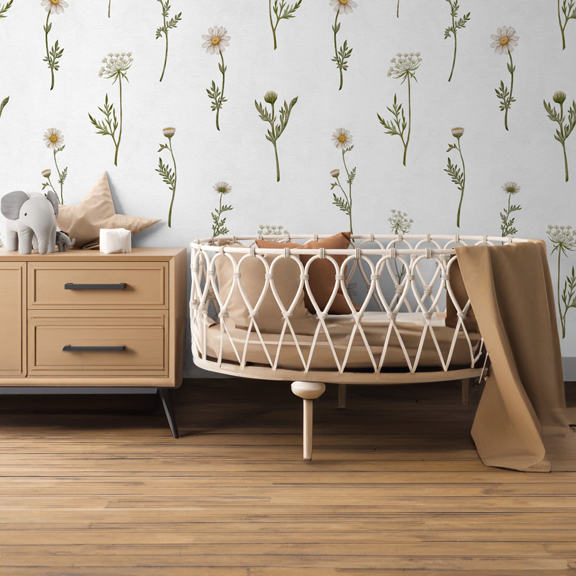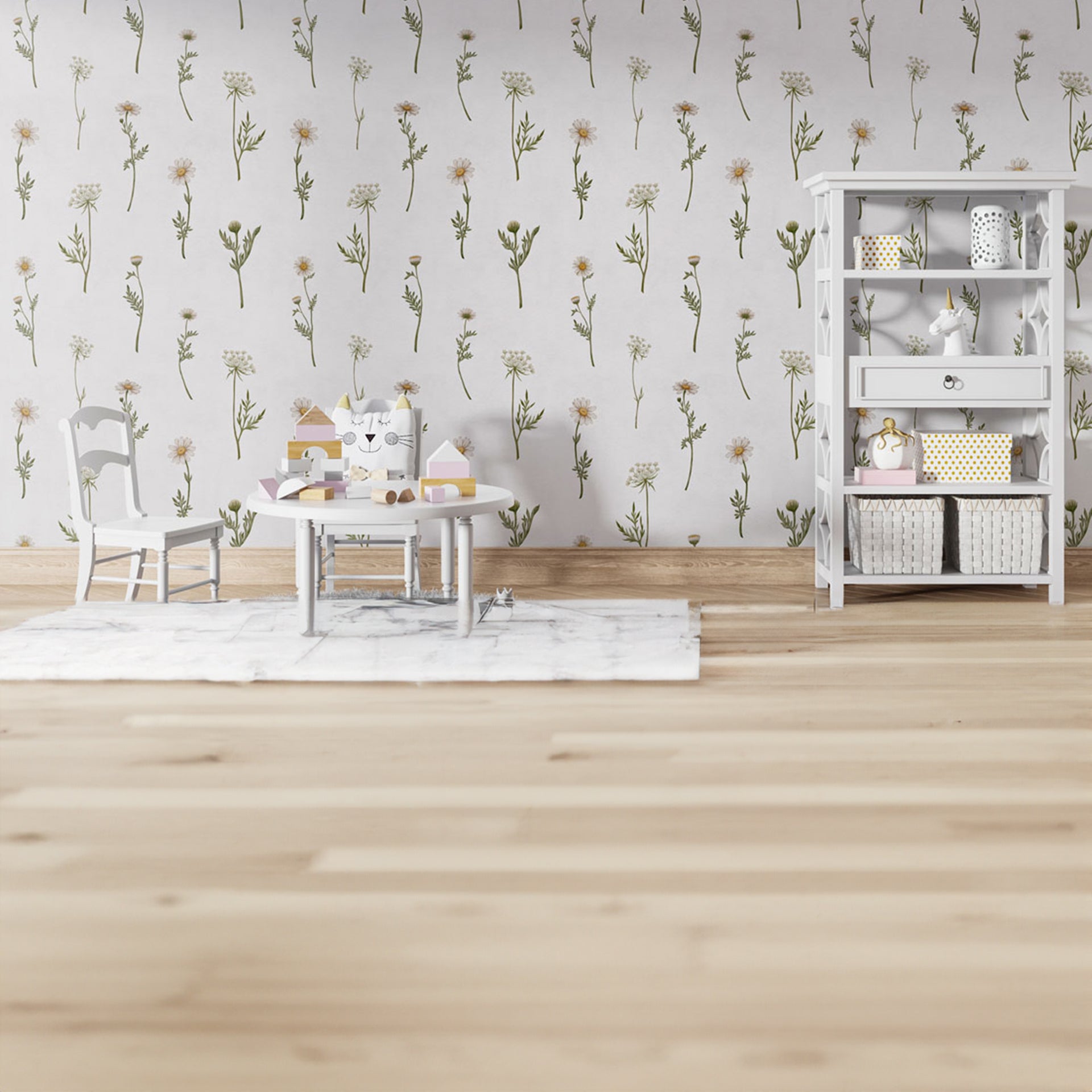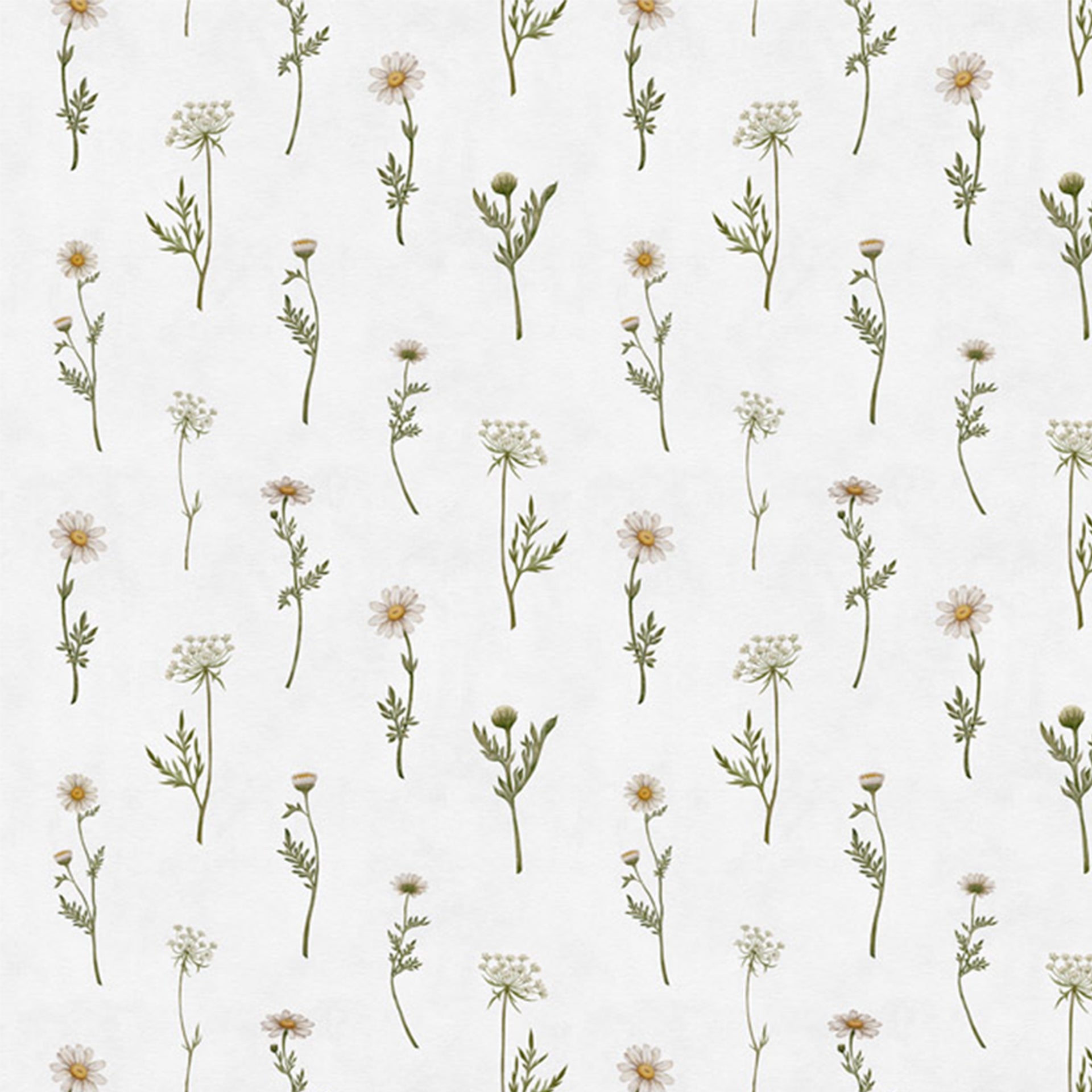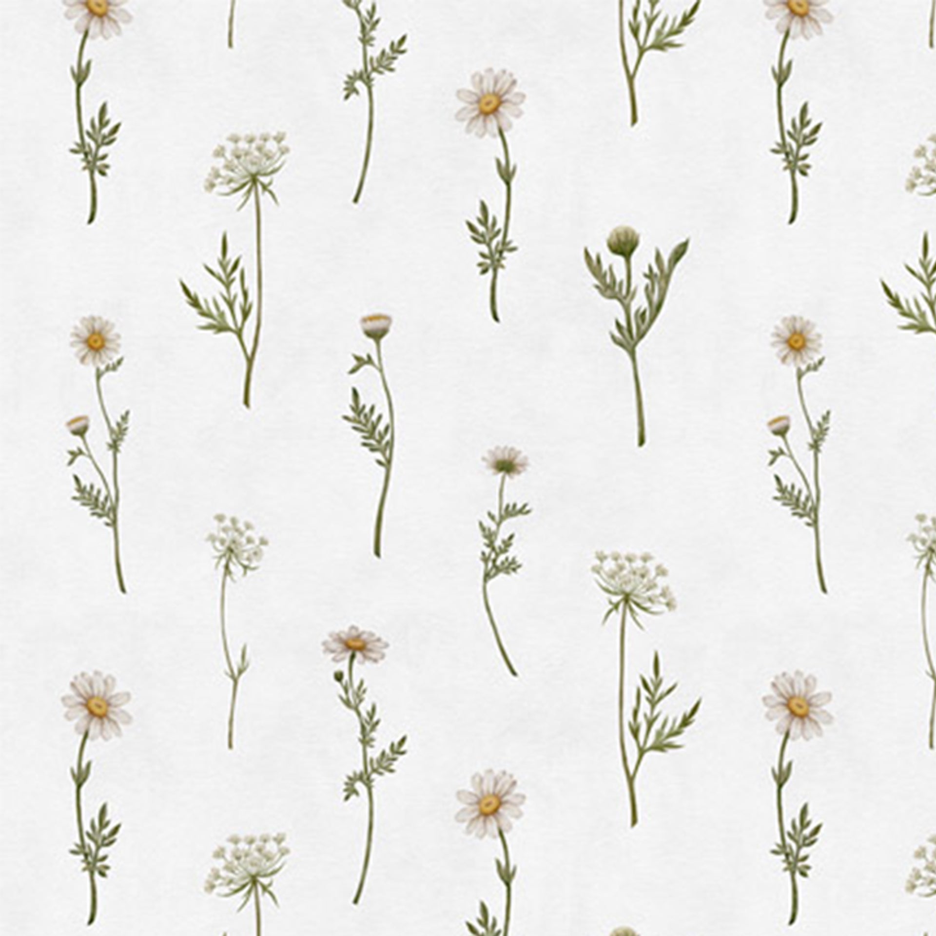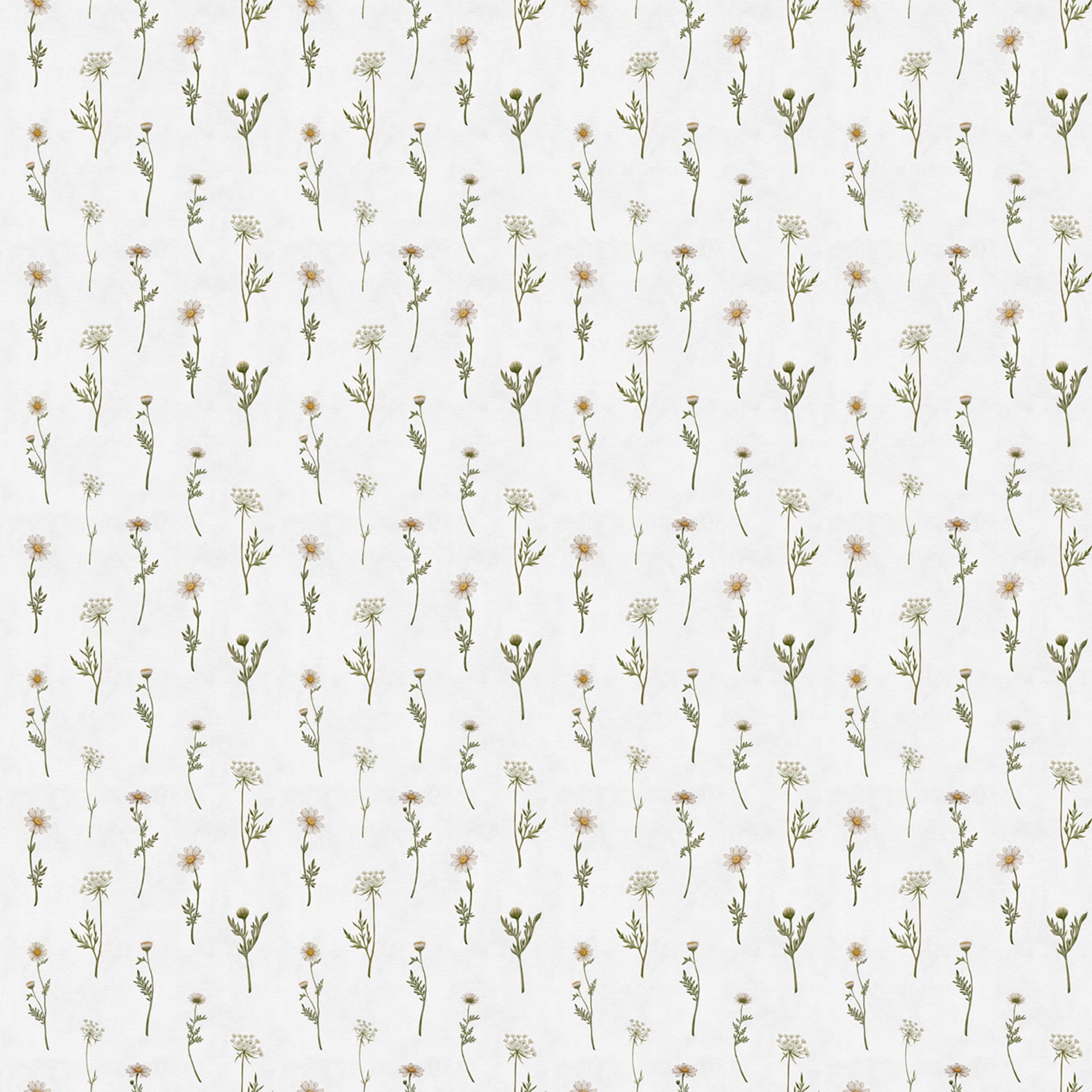 A repeating floral pattern featuring small daisies and slender greens on a pale, textured background. Ideal for wallpaper, fabric, and home decor projects seeking natural, botanical charm..