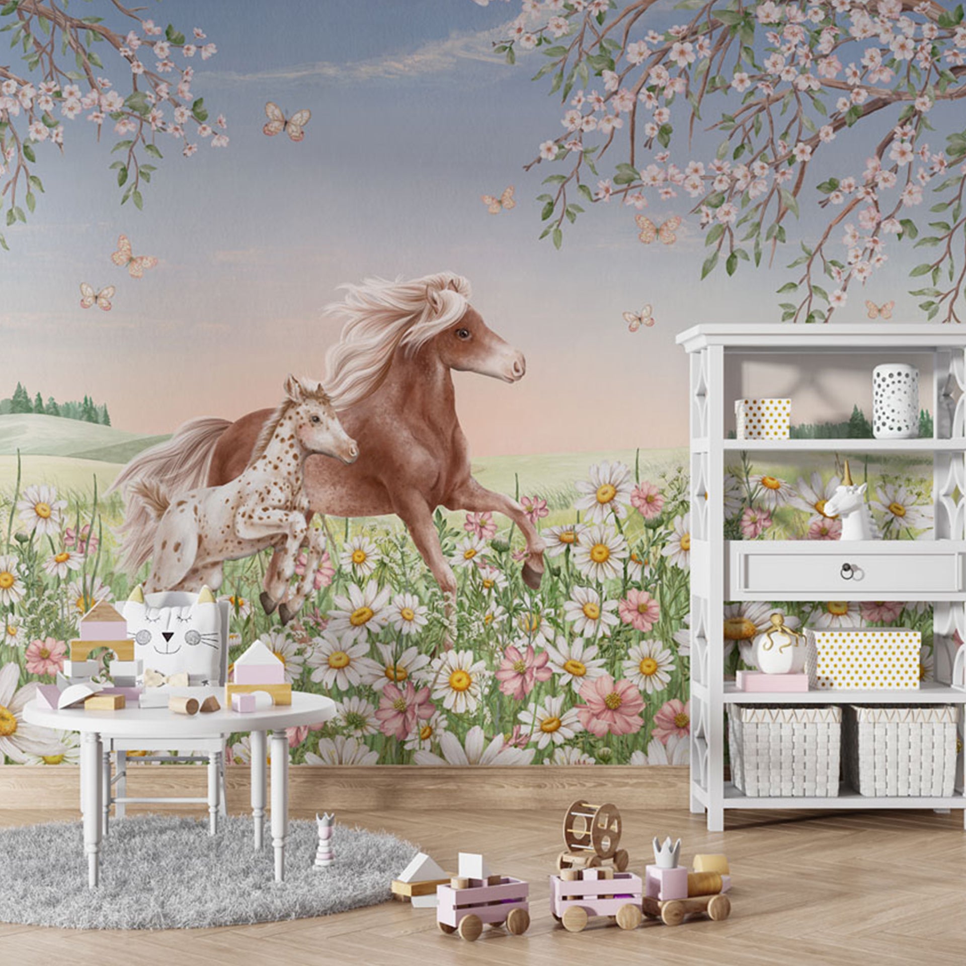 Happy-Horses:Running Horses Amid Blooming Daisies and Cherry Blossom