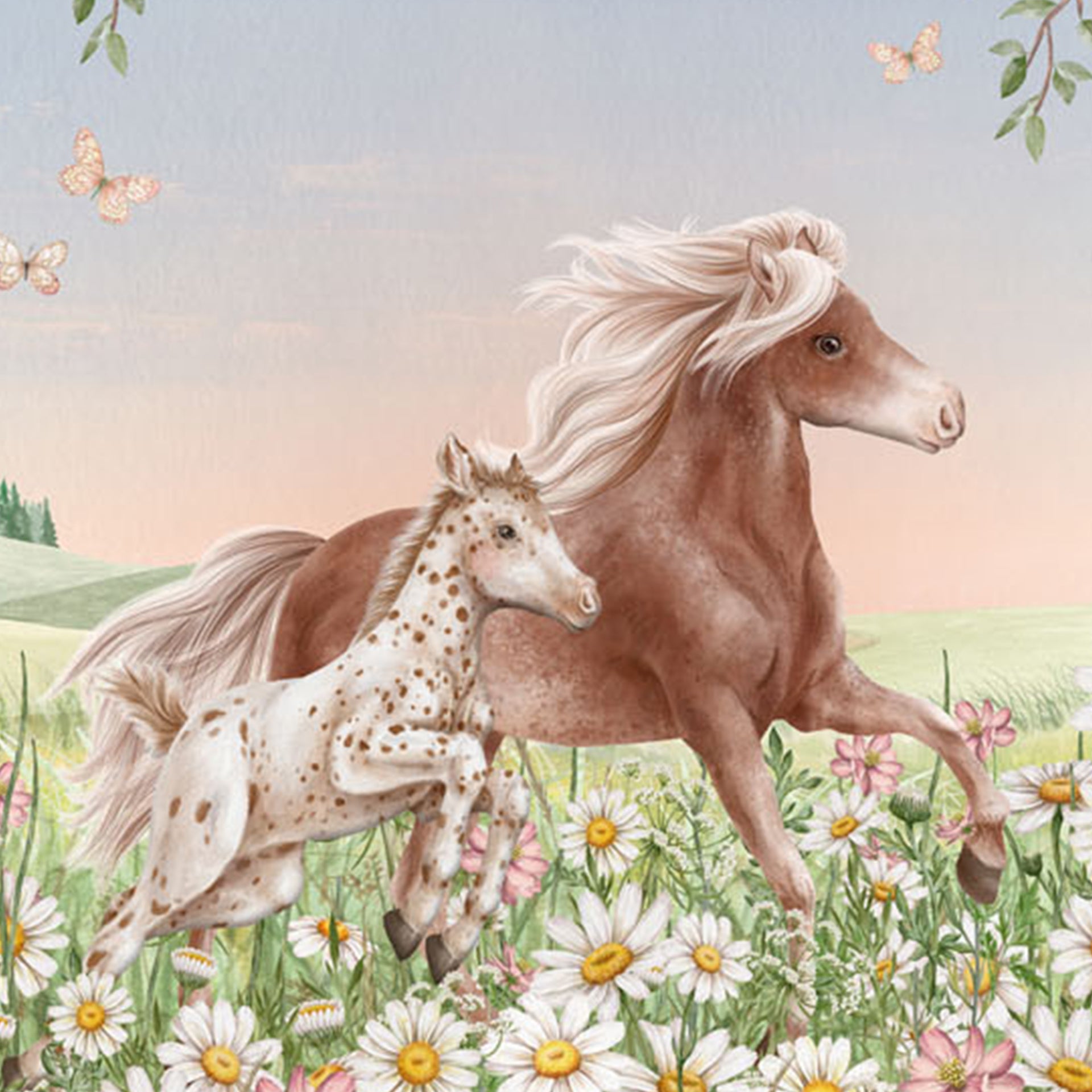 A tranquil spring scene features a brown horse and foal galloping through a daisy-filled meadow, framed by cherry blossoms and fluttering butterflies beneath a soft pastel sky.