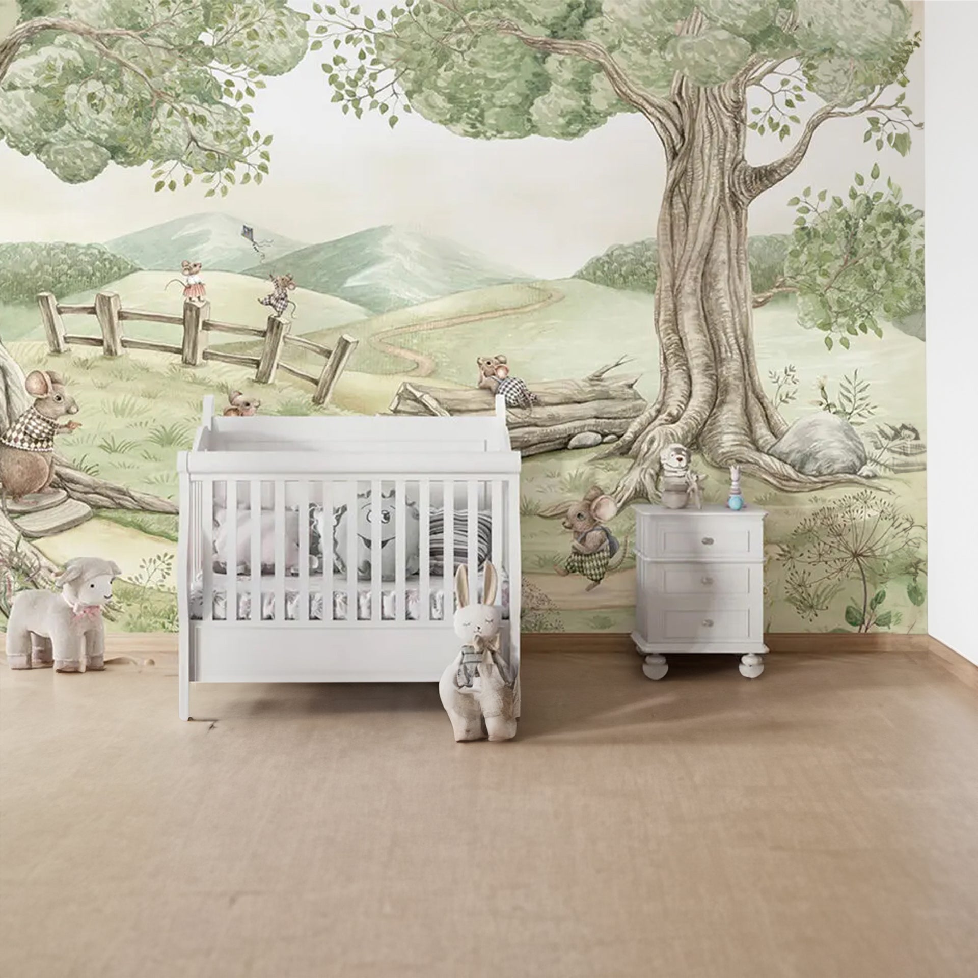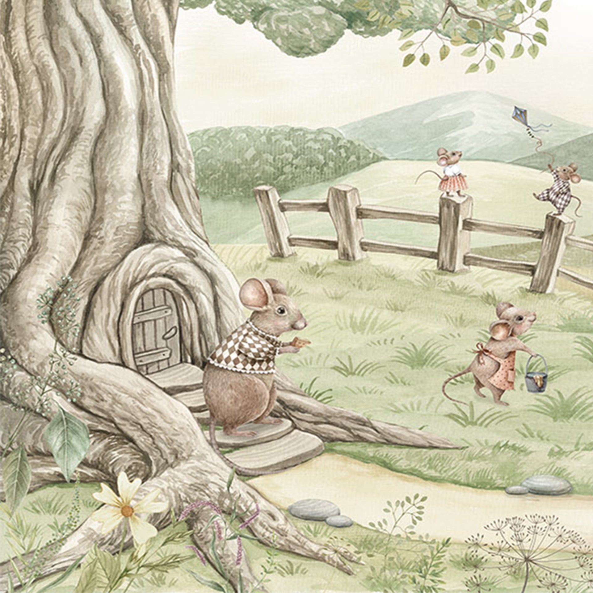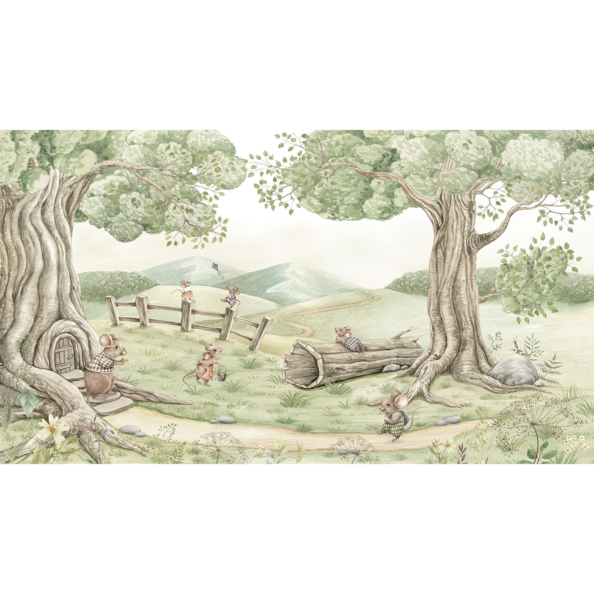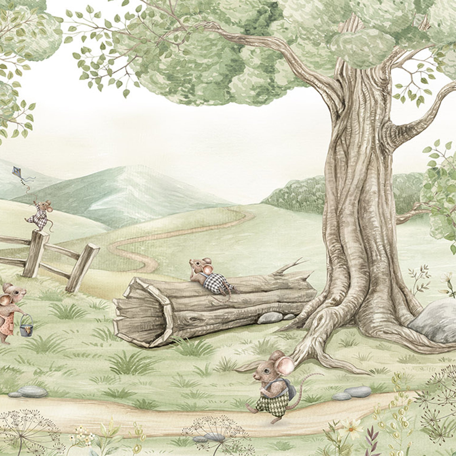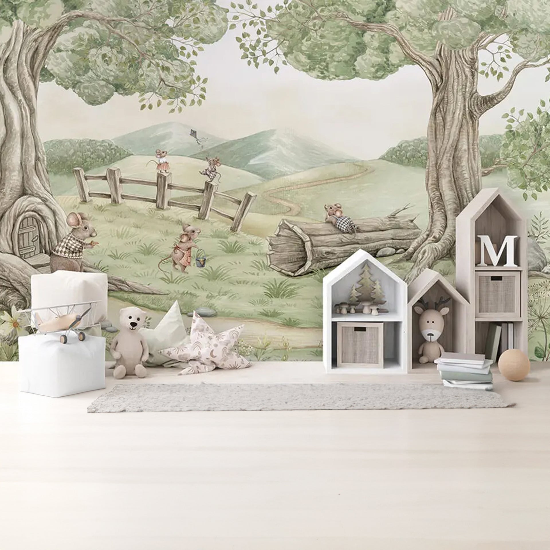 Mouse-Family: Whimsical Wallpaper With Mouse Friends, Squirrels, Trees, and a Gentle Hilltop Landscape