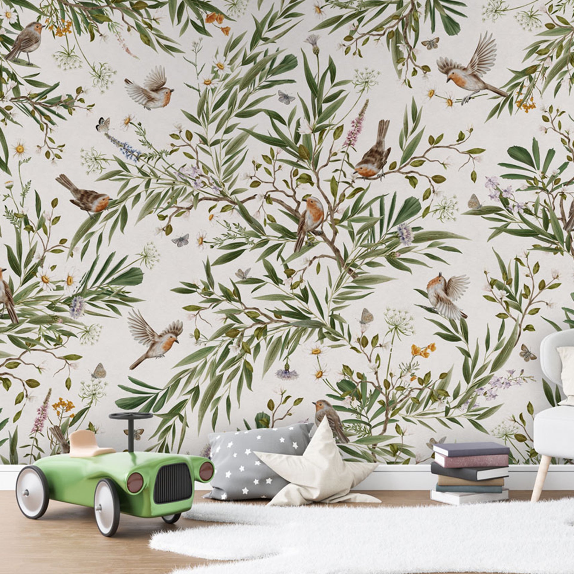 Playful-Robins:Elegant Olive Branch Pattern With Small Birds, Floral Elements, and Natural Botanical Charm