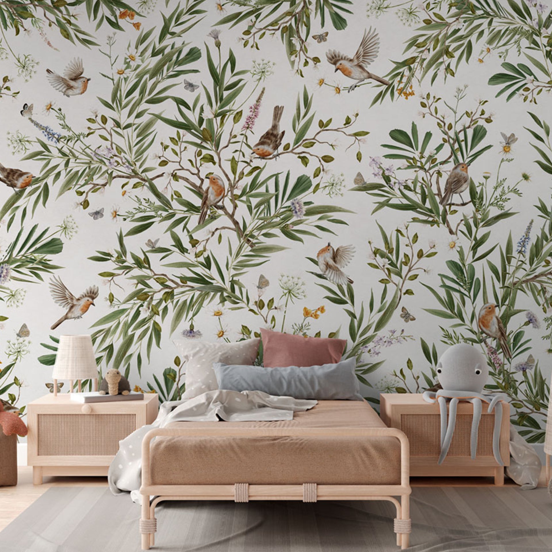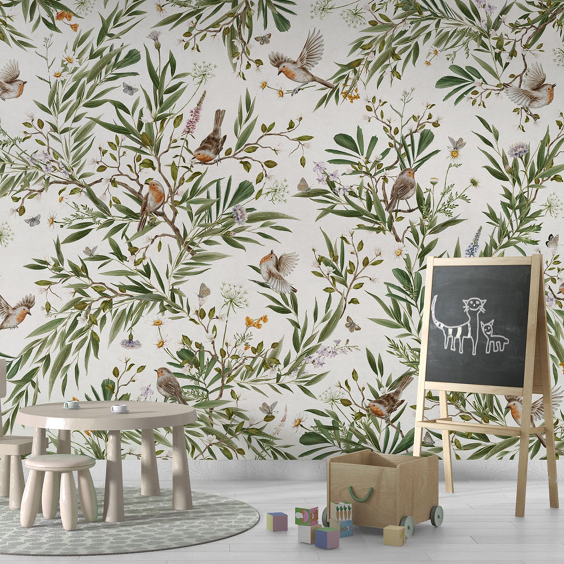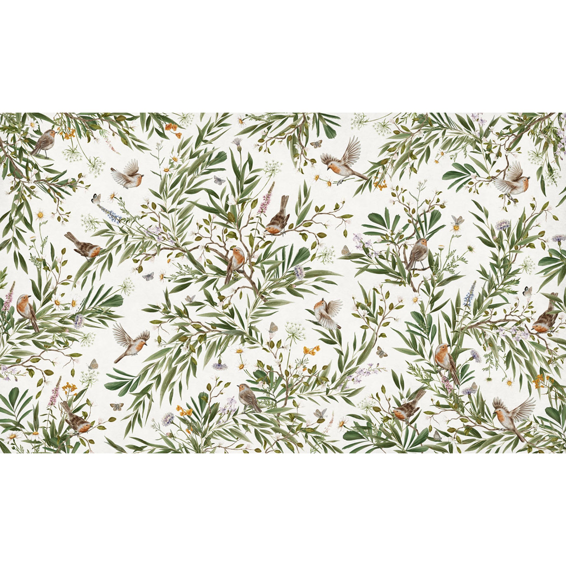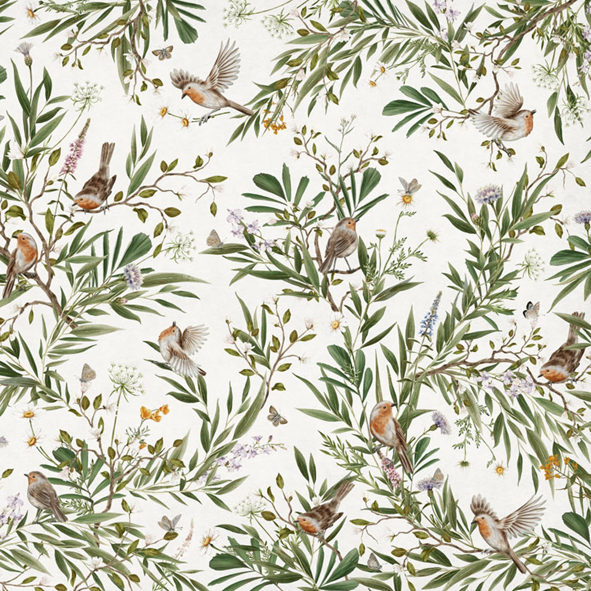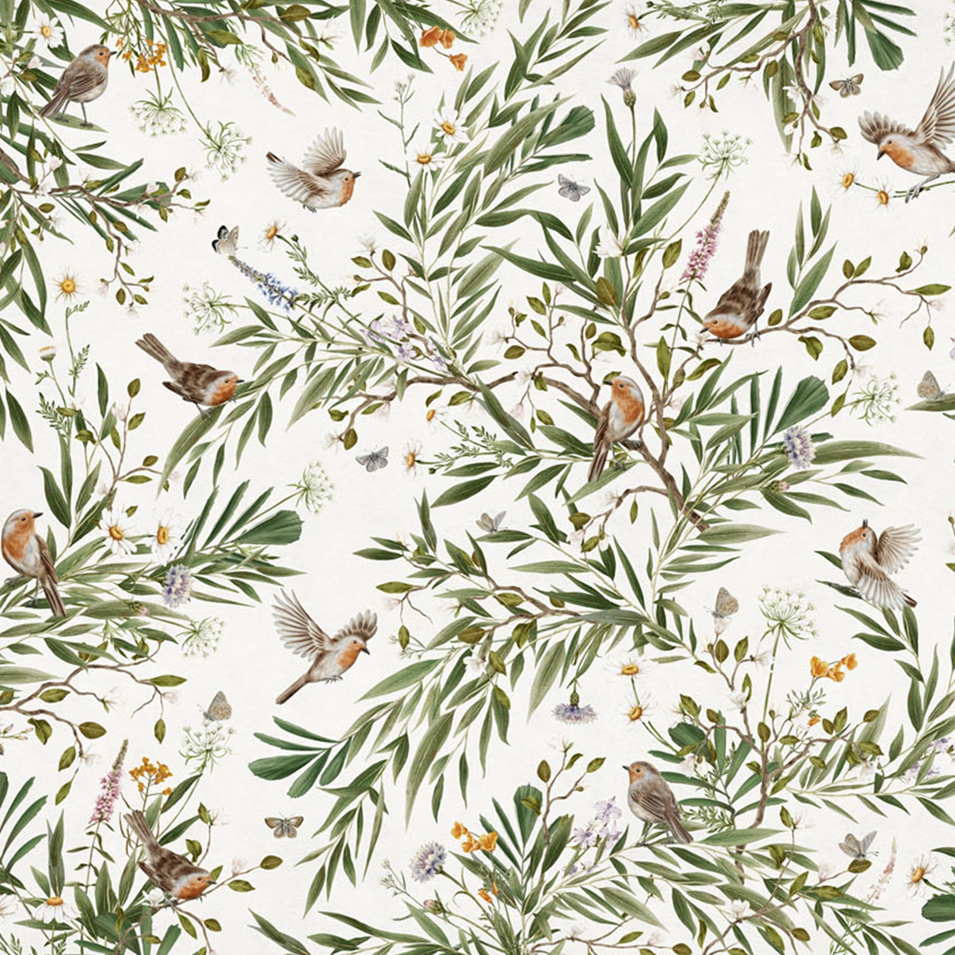 A delicate wallpaper-style illustration featuring slender olive branches, tiny birds, and scattered wildflowers. Perfect for nature-inspired decor, textiles, packaging, or stationery, conveying calm, freshness, and vintage botanical charm.