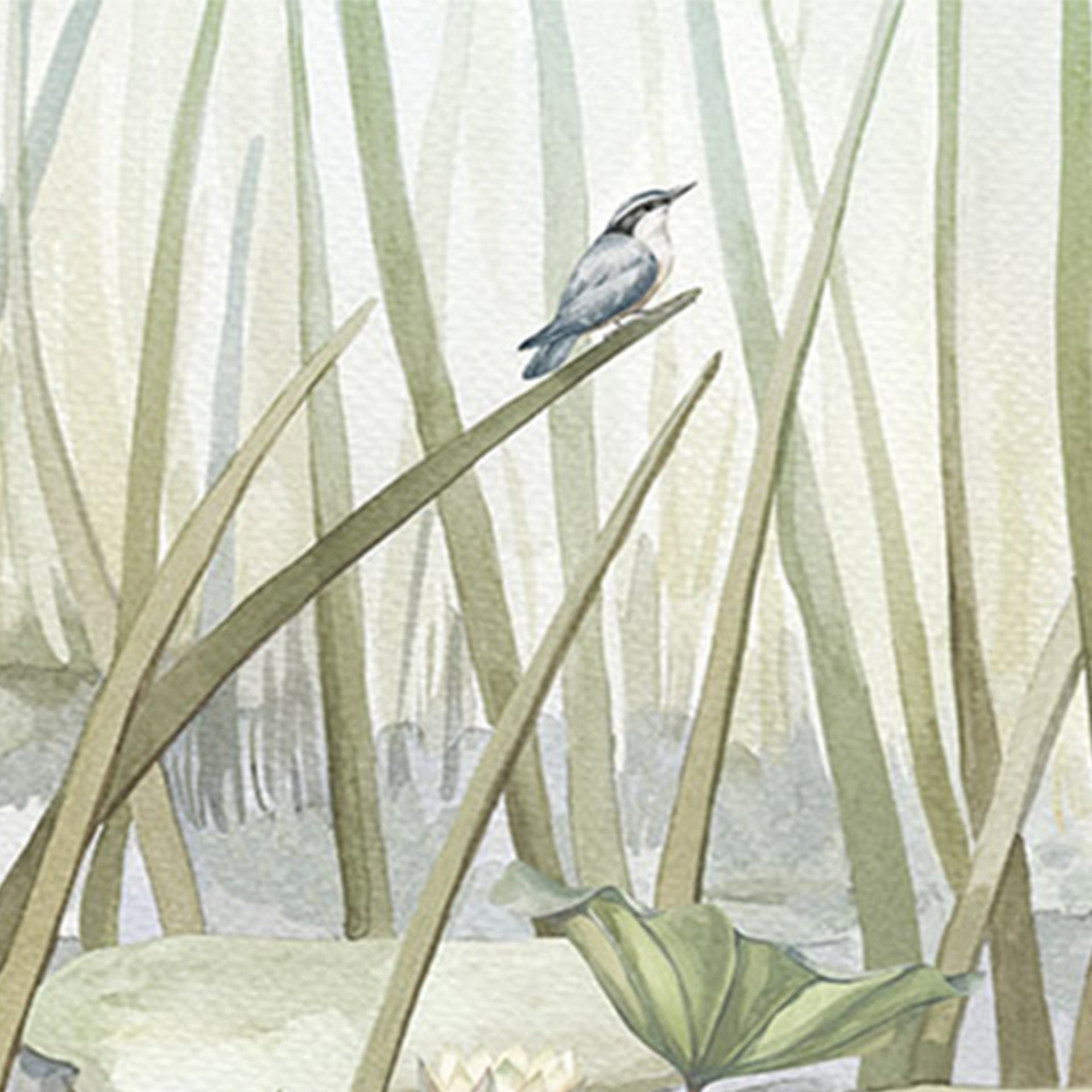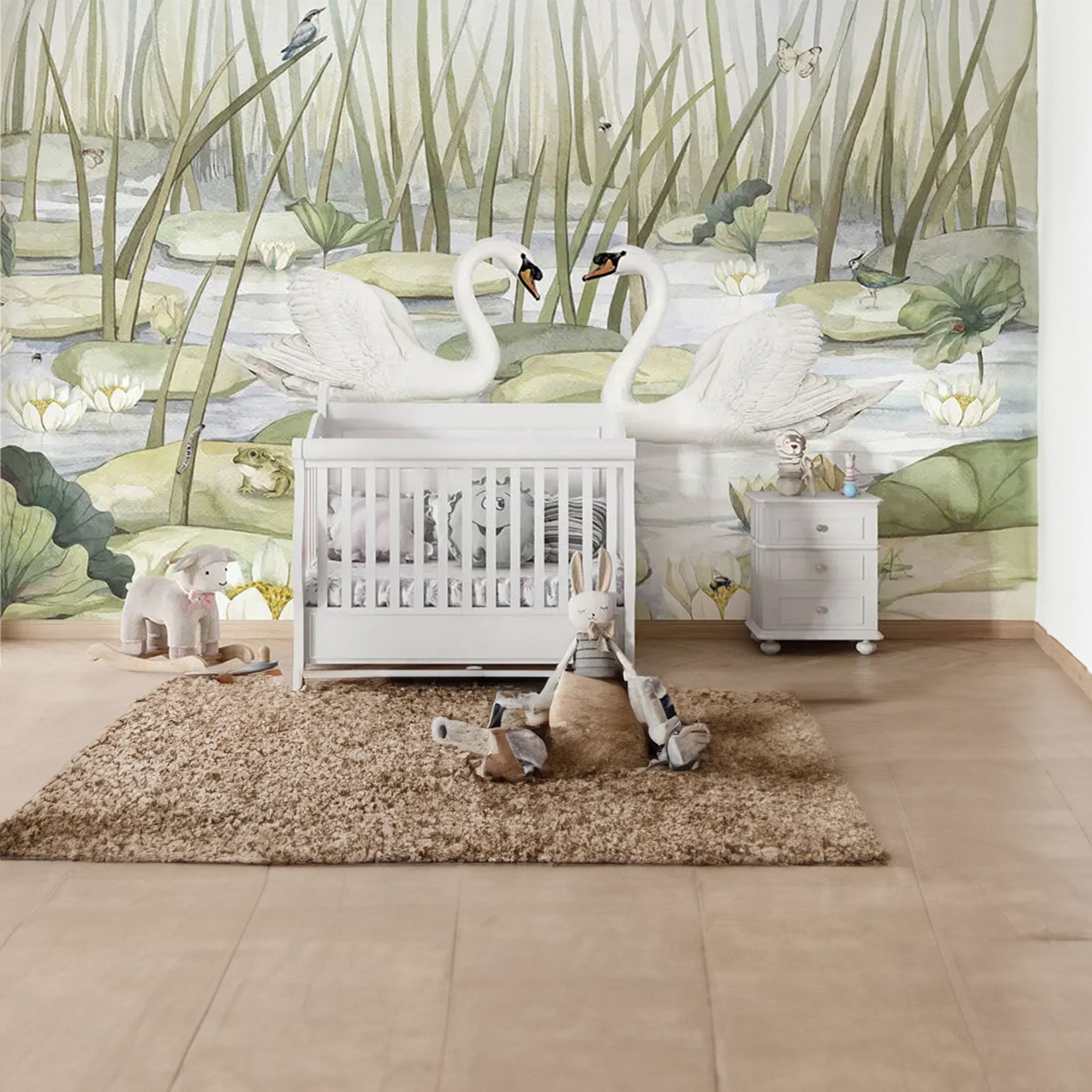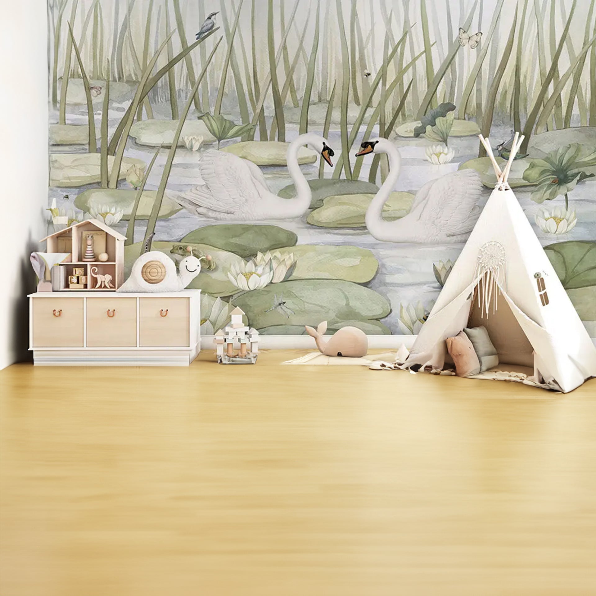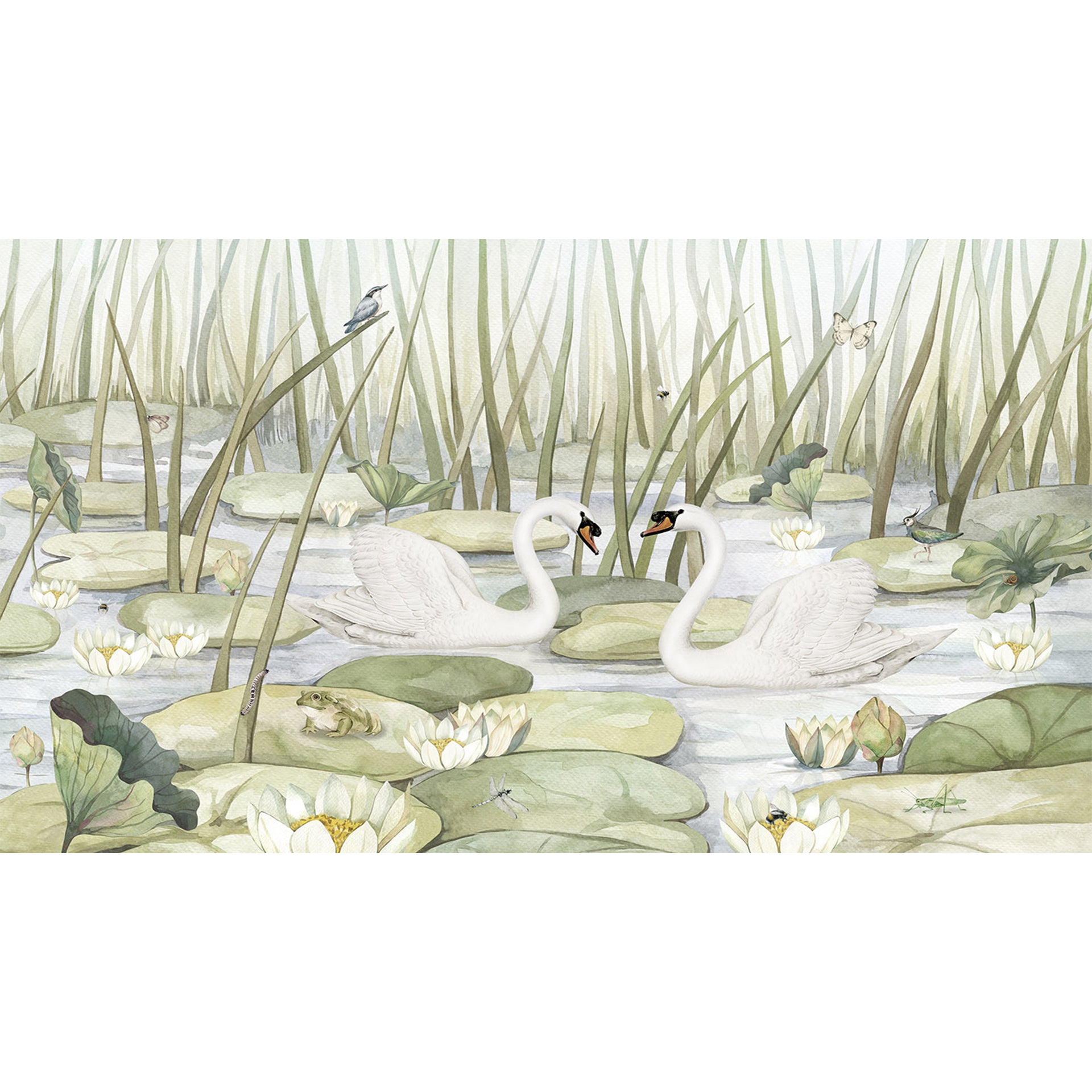 A peaceful watercolor scene features two white swans on a tranquil pond, surrounded by tall reeds, lily pads, and blooming water lilies. Small birds, frogs, and dragonflies add gentle life to the landscape.