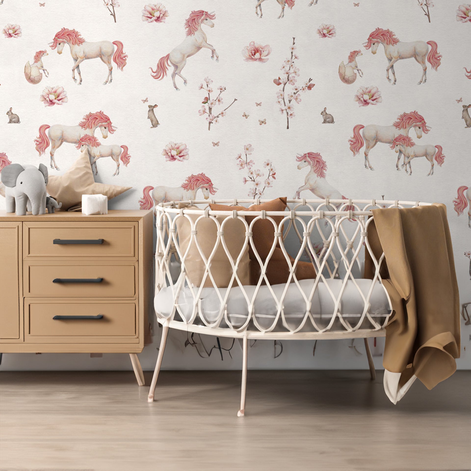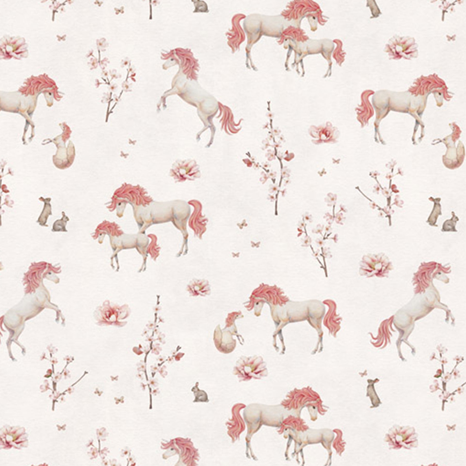 Soft, whimsical repeating pattern featuring pastel horses, pink manes, delicate blossoms, and branches. Ideal for nursery decor, textiles, wallpaper, and home accents, conveying charm, gentleness, and dreamy whimsy.