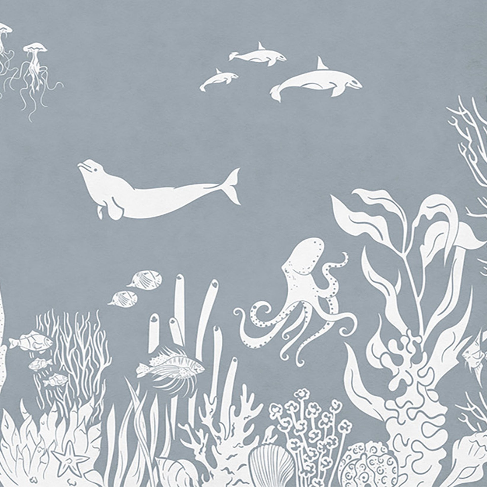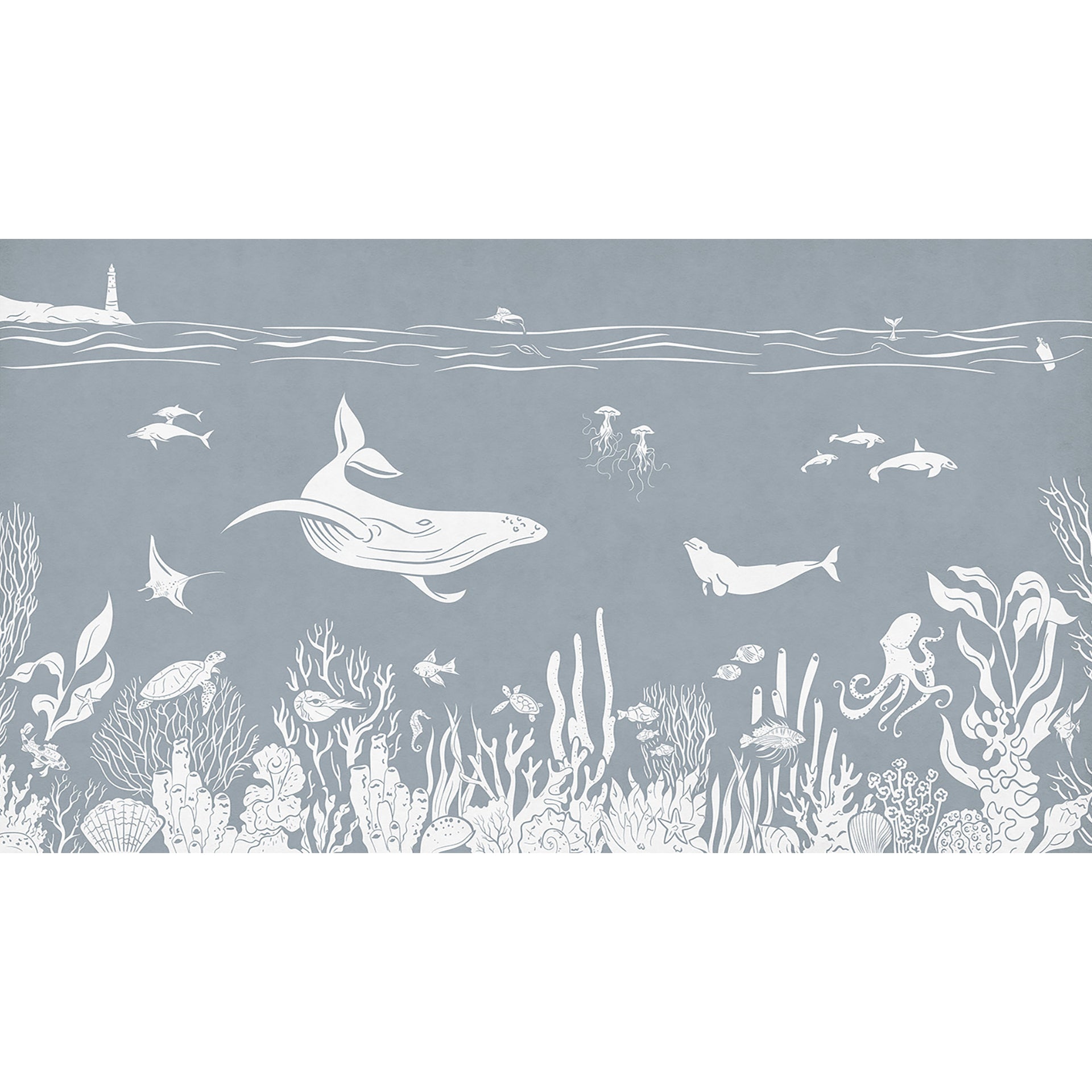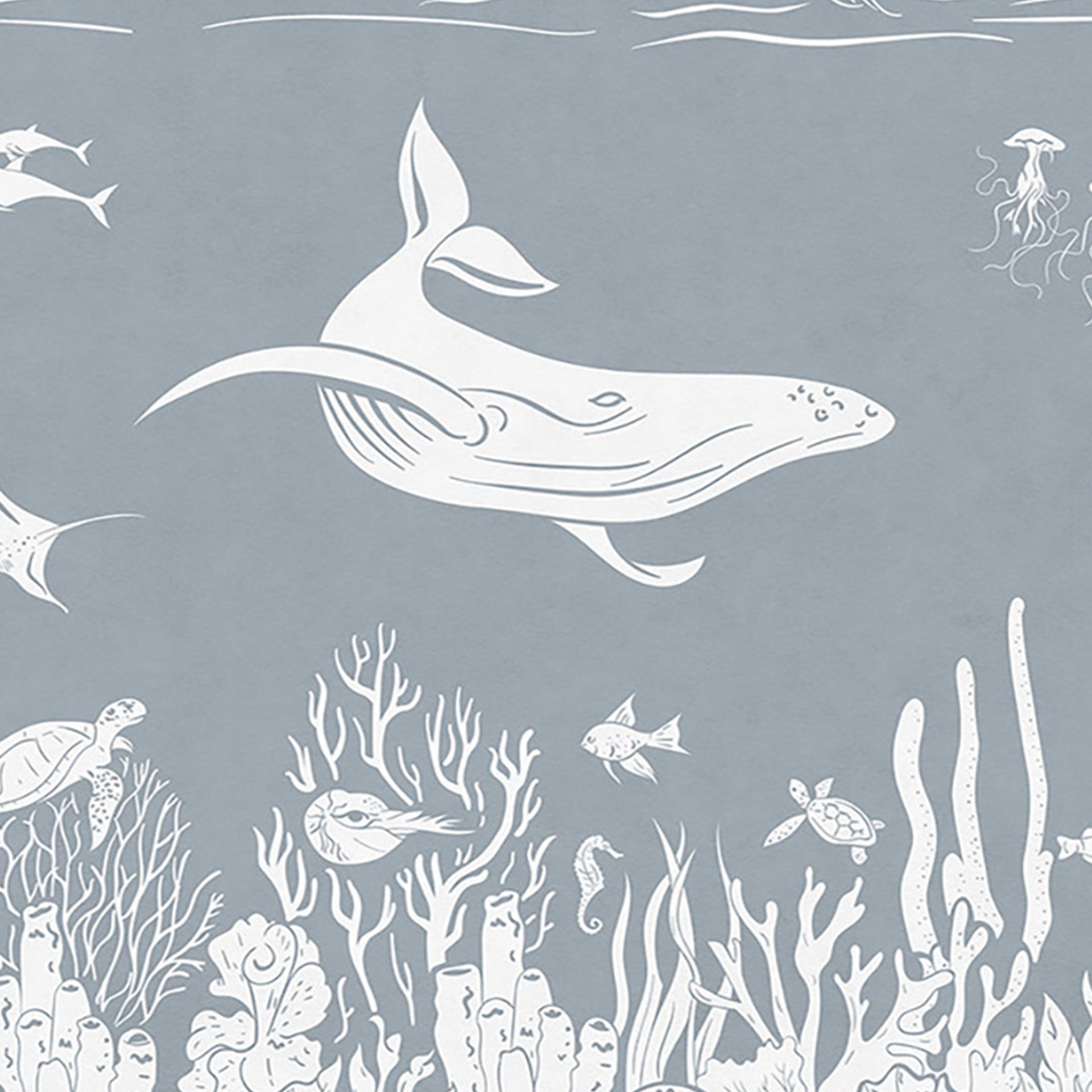 A tranquil underwater scene featuring white silhouettes of whales, dolphins, jellyfish, and a diverse coral reef, set against a soft blue-gray ocean backdrop. Ideal for nature and marine life themes.