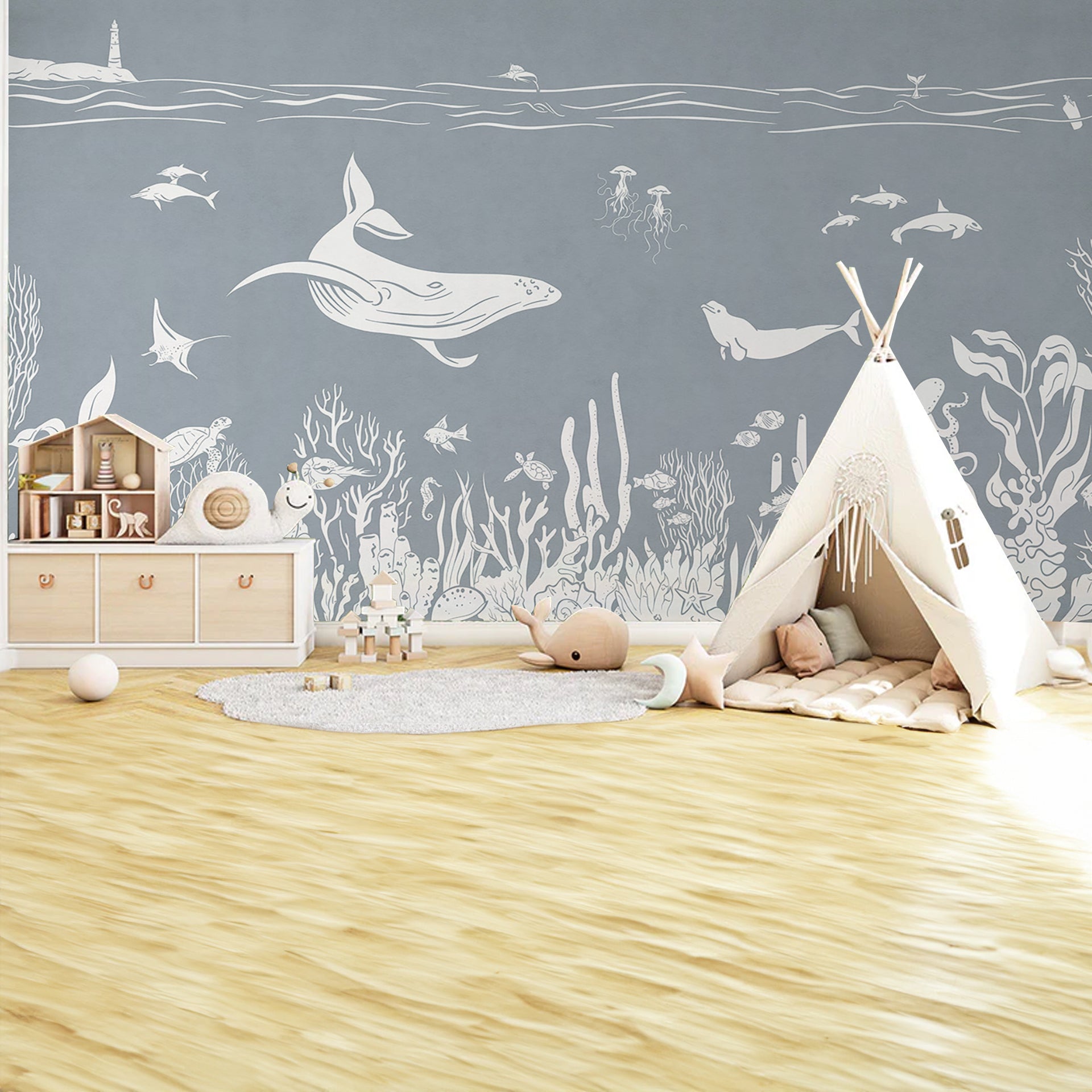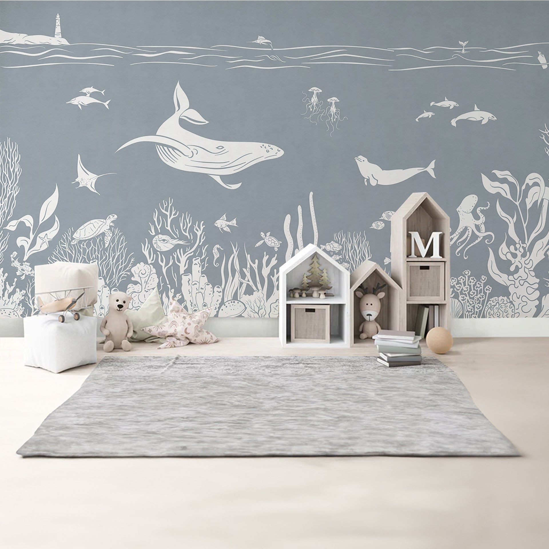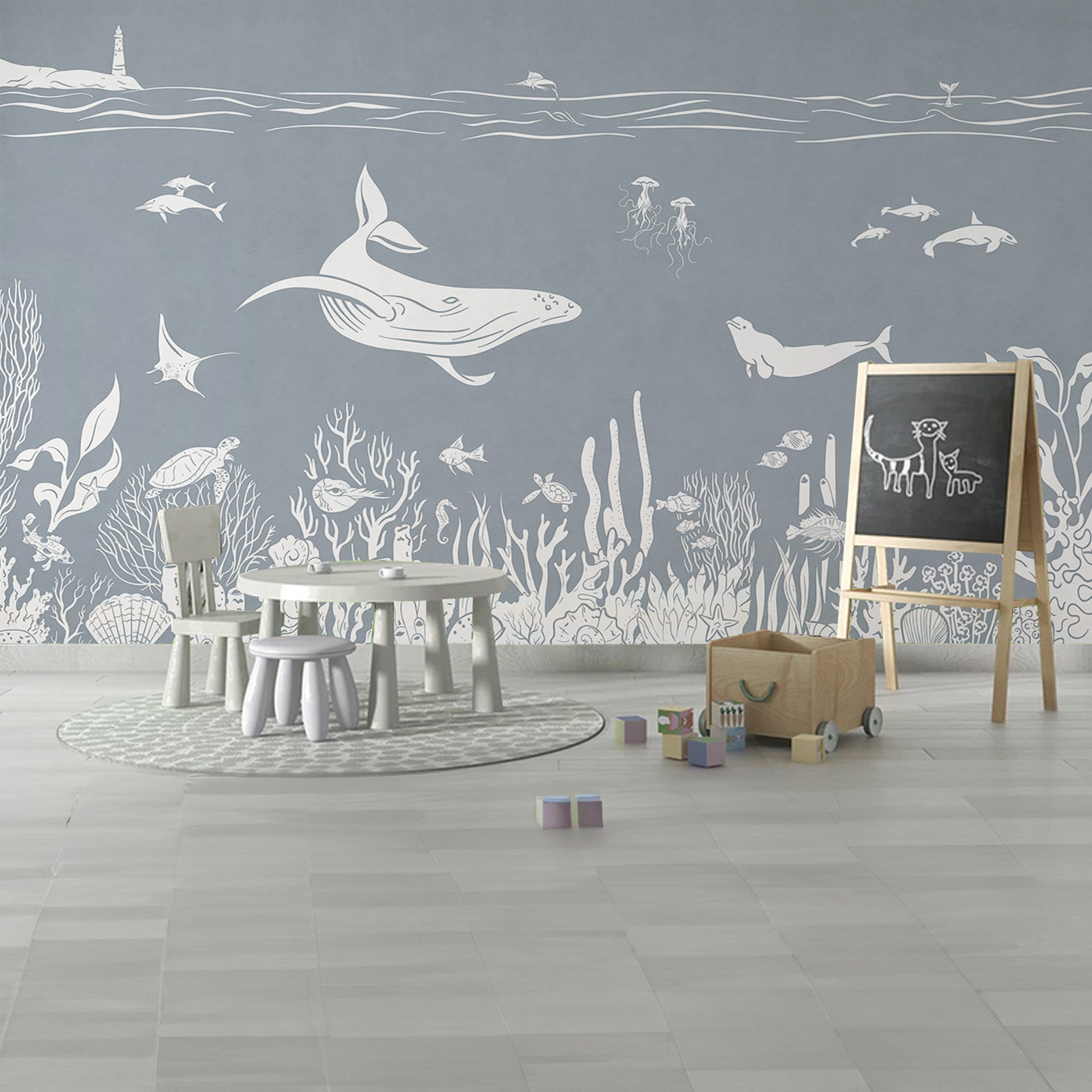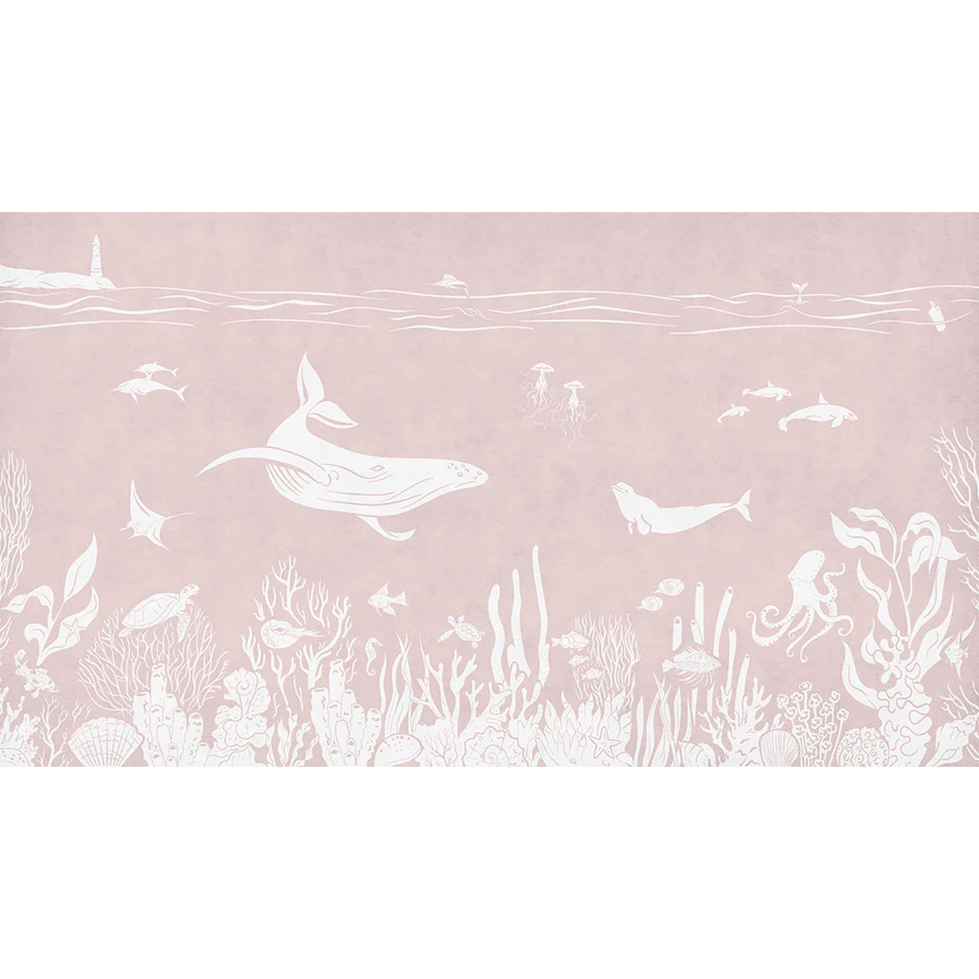 A tranquil underwater scene featuring white silhouettes of whales, dolphins, jellyfish, and a diverse coral reef, set against a soft blue-gray ocean backdrop. Ideal for nature and marine life themes.